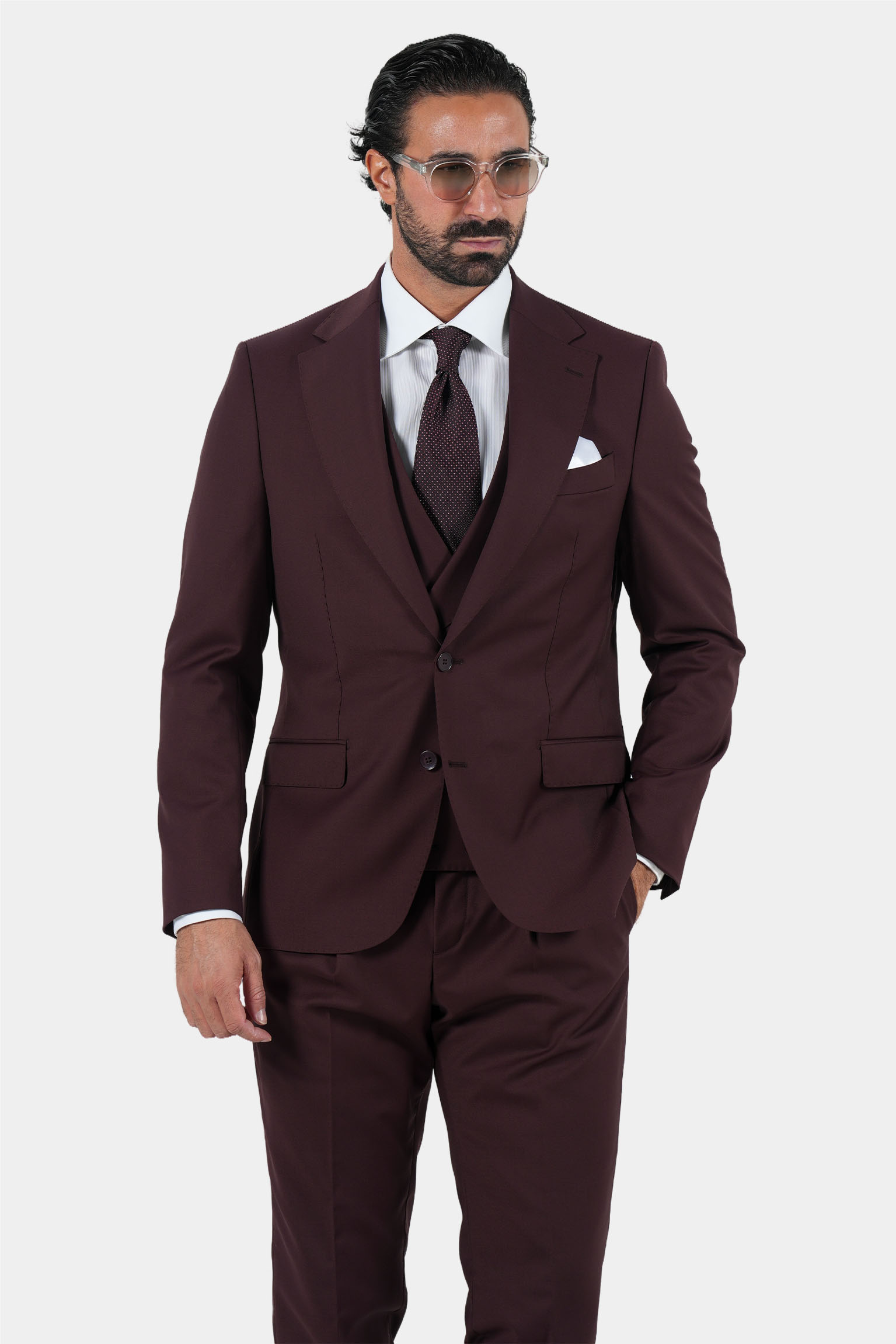Bordeauxfarbener Dreiteiliger Anzug aus italienischer Wolle Slim Fit