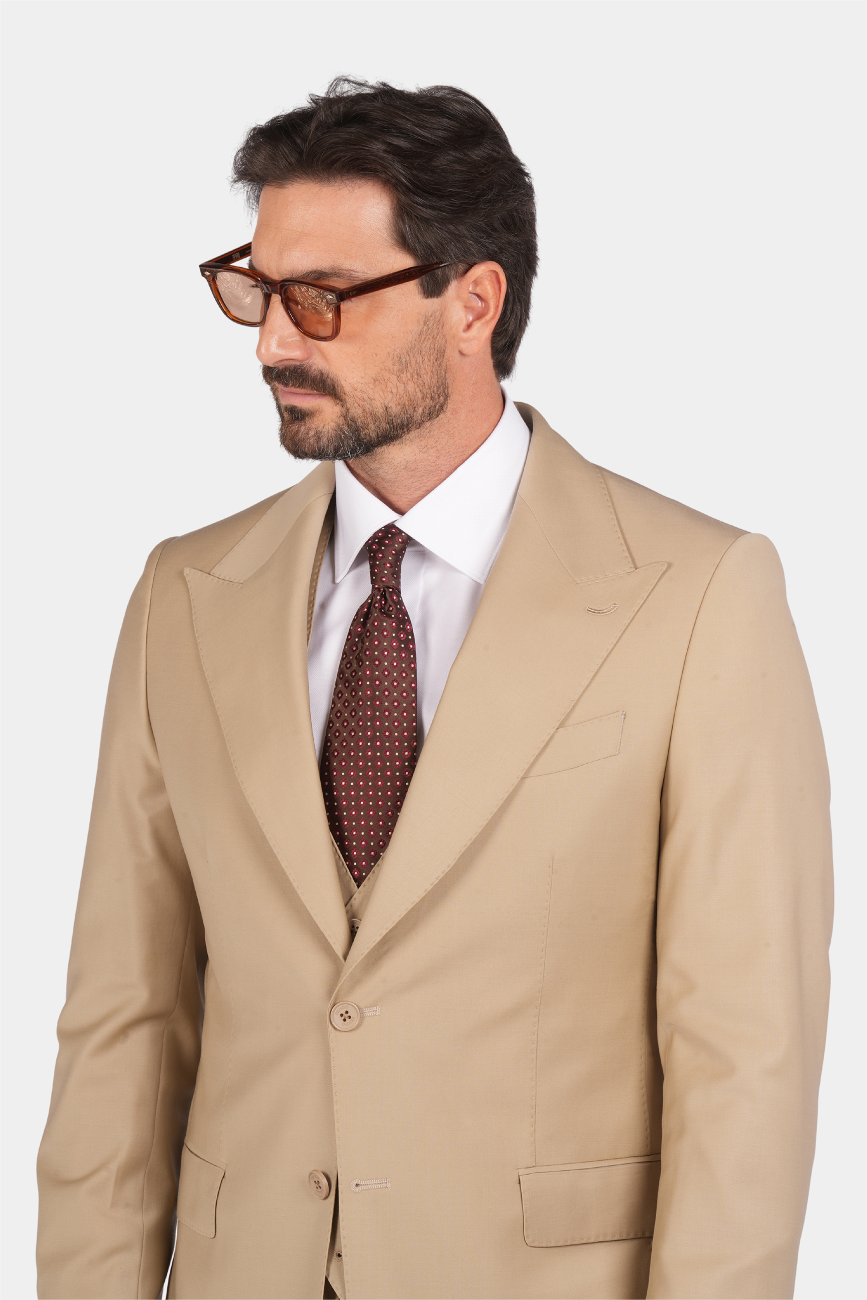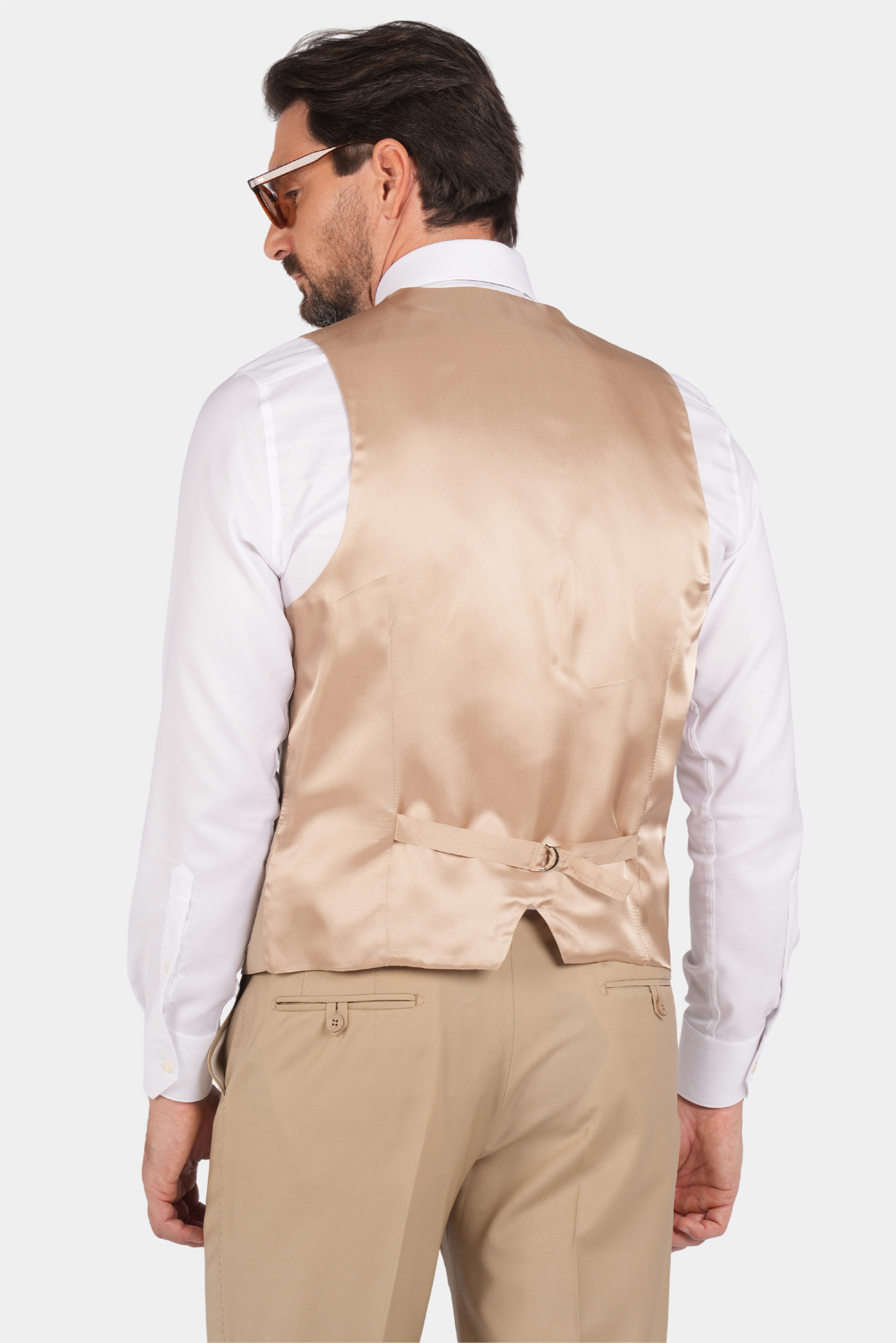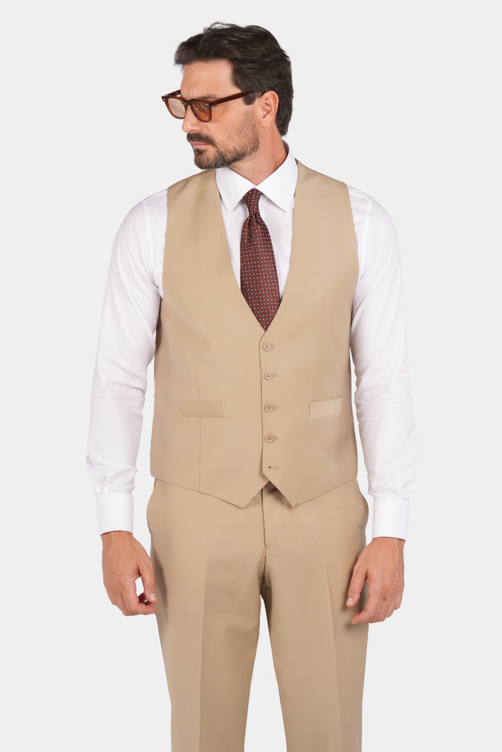 Dieser dreiteilige Anzug ist zu 85% handgefertigt. Er hat einen hochwertigen und langlebigen Stoff, und die Farbe ist beige und es ist eine gute Wahl für semi-formale und formelle Orte.