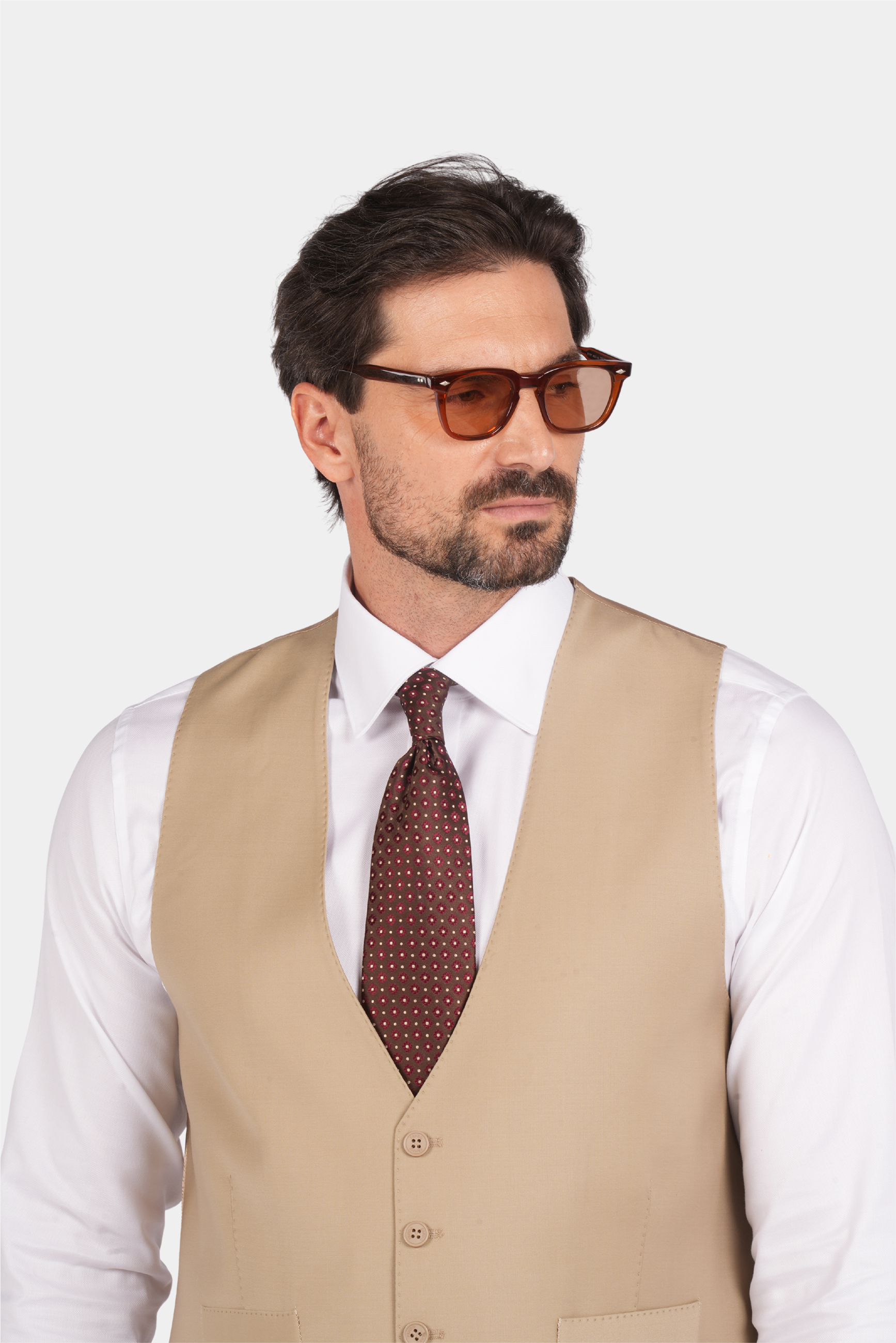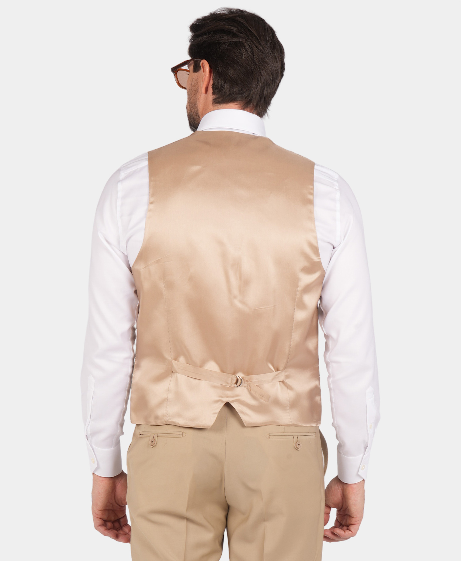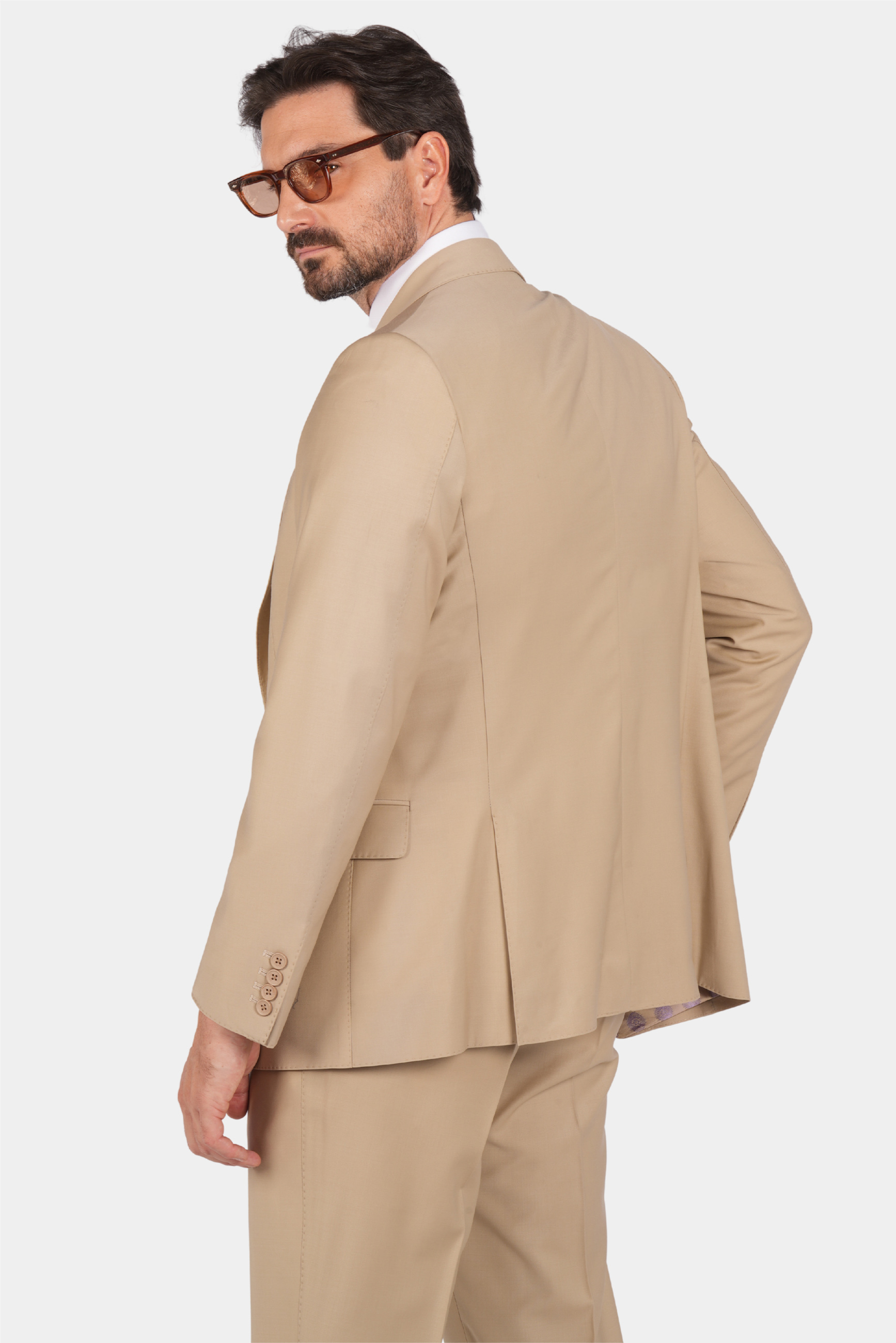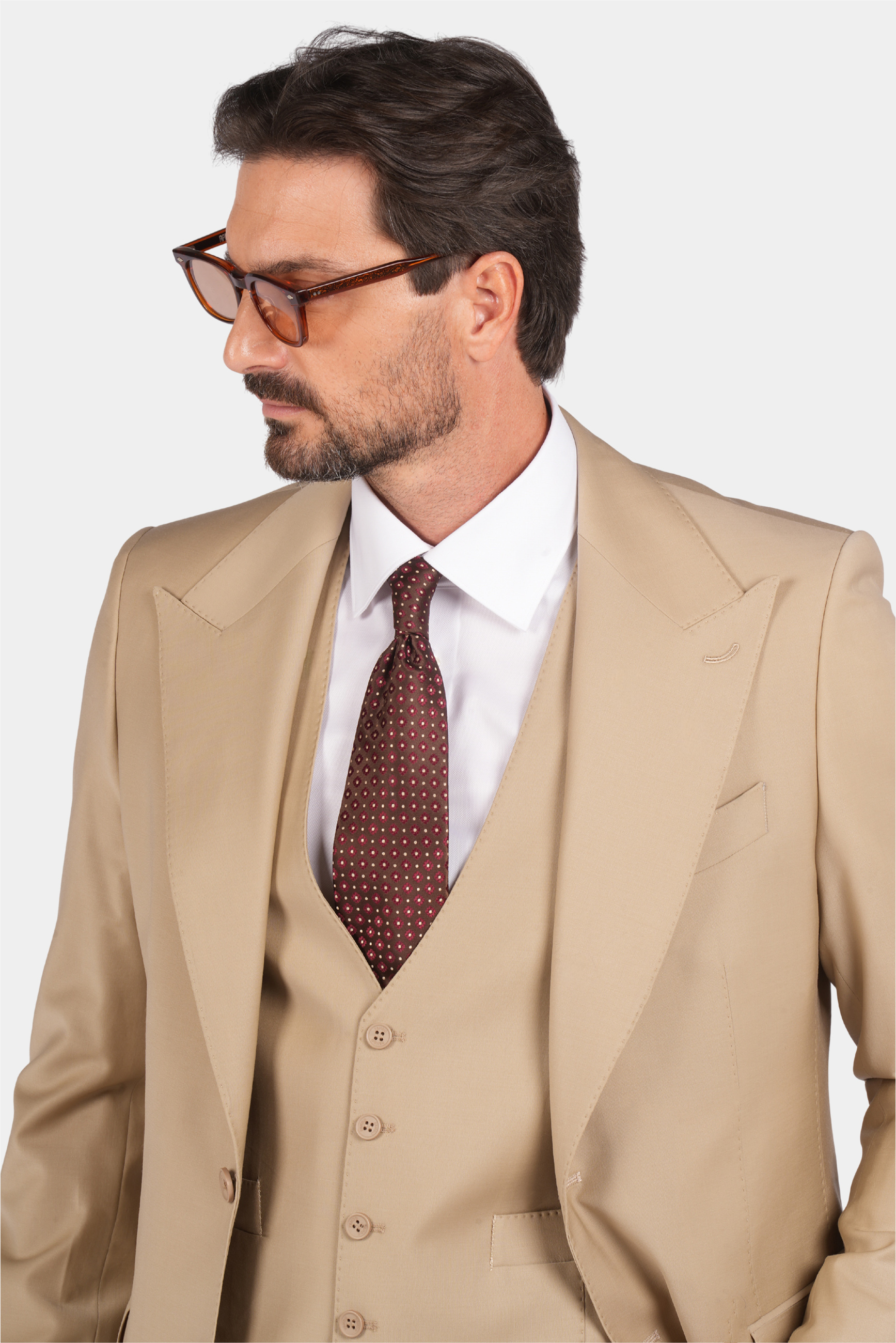 Dieser dreiteilige Anzug ist zu 85% handgefertigt. Er hat einen hochwertigen und langlebigen Stoff, und die Farbe ist beige und es ist eine gute Wahl für semi-formale und formelle Orte.