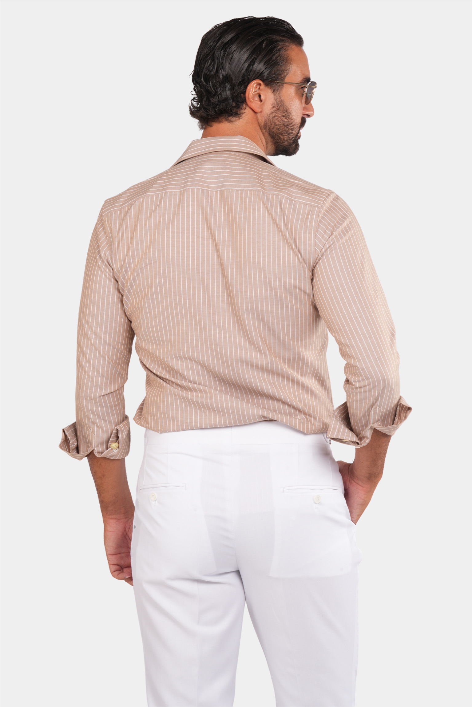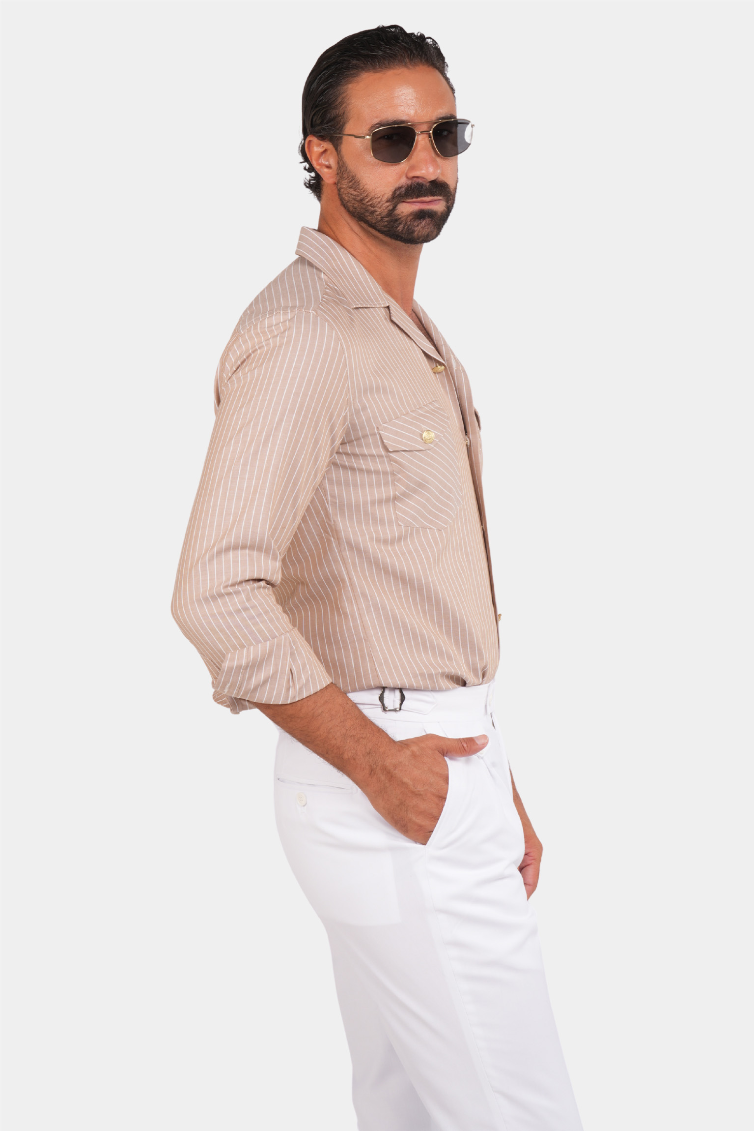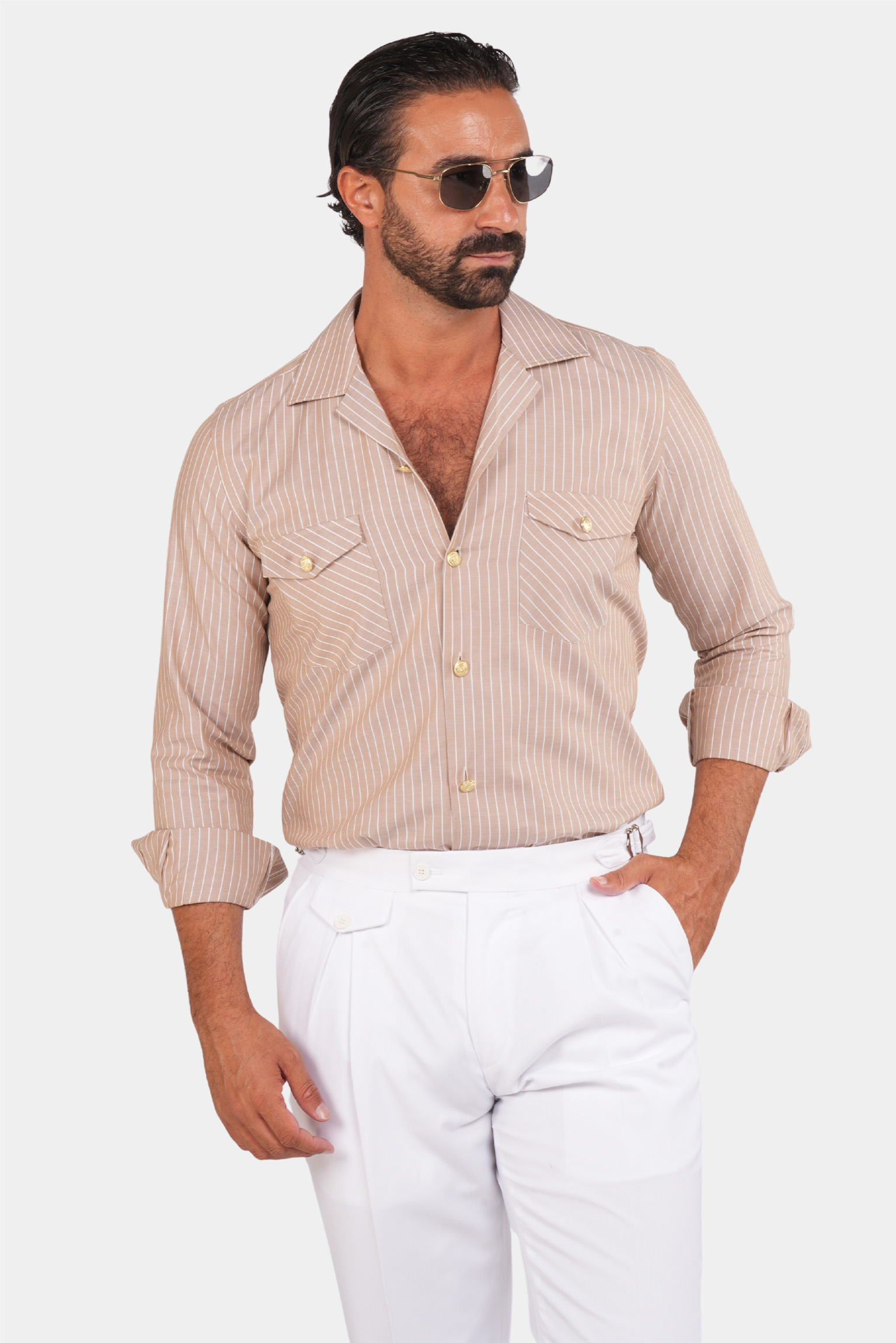 Dieses beige gestreifte Safari-Hemd ist die perfekte Kombination aus Eleganz und Komfort. Hergestellt aus 100% hochwertiger Baumwolle, bietet es ein weiches und atmungsaktives Gefühl. Das dezente Streifenmuster fügt eine raffinierte Note hinzu, während die goldfarbenen Knöpfe und die aufgesetzten Brusttaschen einen eleganten Look verleihen. Mit einem Safari-Kragen ausgestattet, zeigt dieses Hemd den zeitlosen Stil der klassischen italienischen Mode und ist ideal für sowohl legere als auch semi-formelle Anlässe.