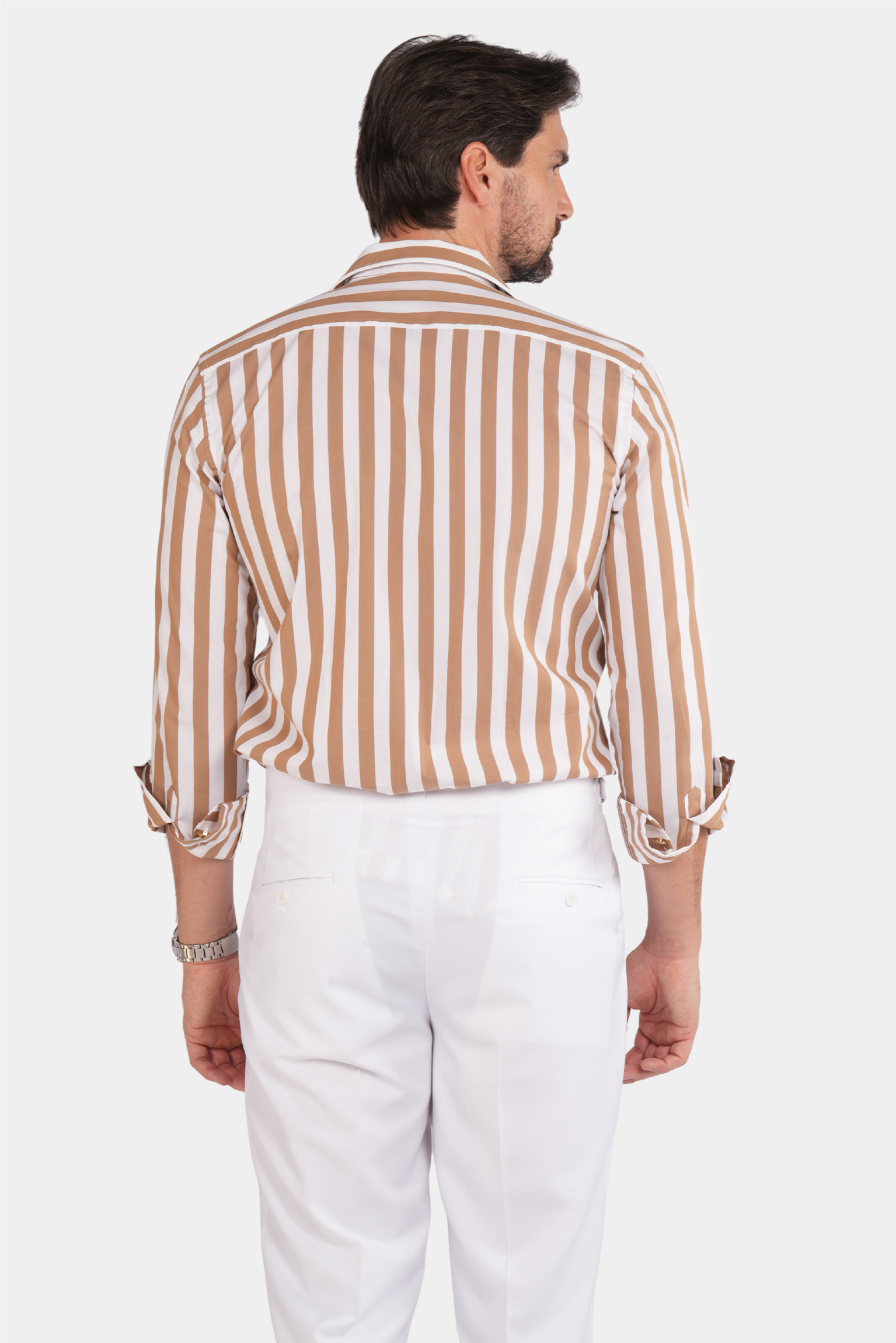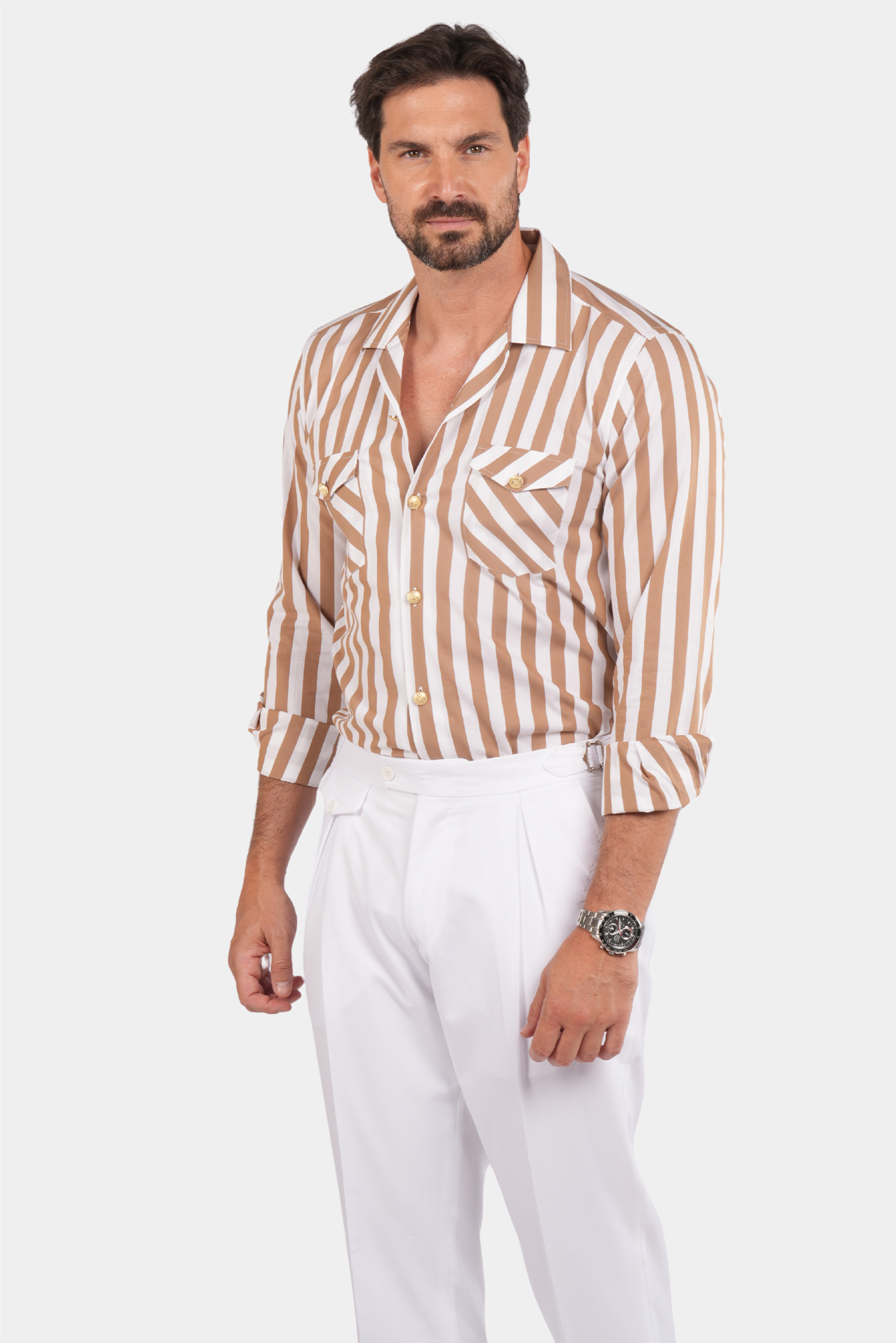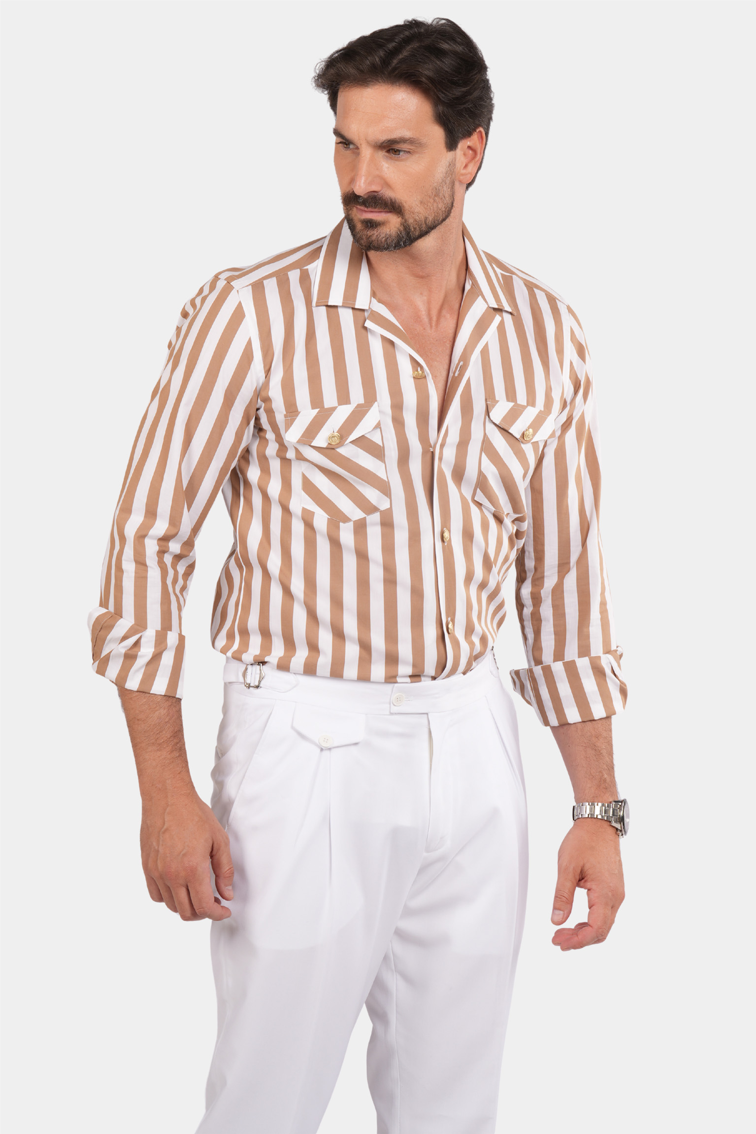 Dieses beige und weiße gestreifte Safari-Hemd besteht aus 100 % Baumwollstoff, der leicht und komfortabel ist. Das vertikale Streifen-Design mit einem klassischen Kragen verleiht Ihrem Stil einen modischen und modernen Look. Die goldfarbenen Knöpfe und die geknöpften Taschen auf der Brust fügen besondere Details hinzu. Dieses Hemd ist ideal für semi-formelle und legere Styles und eignet sich für Partys, freundschaftliche Zusammenkünfte oder sogar informelle Arbeitsumgebungen.