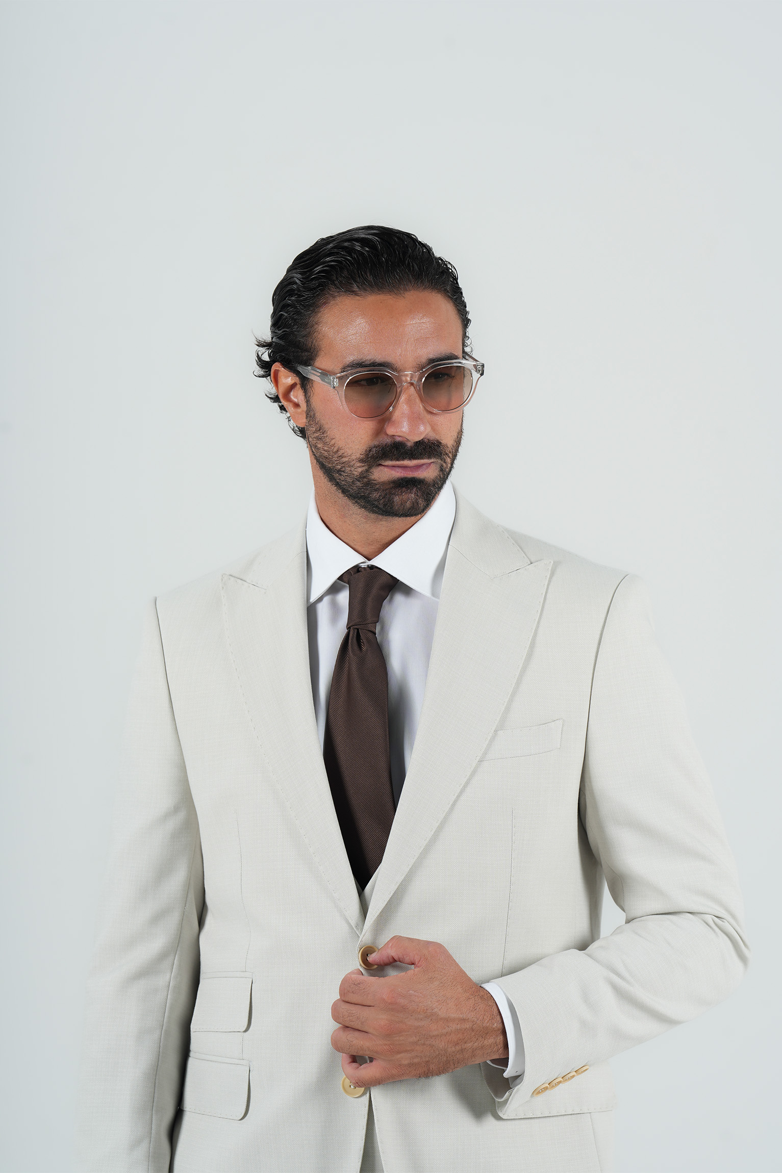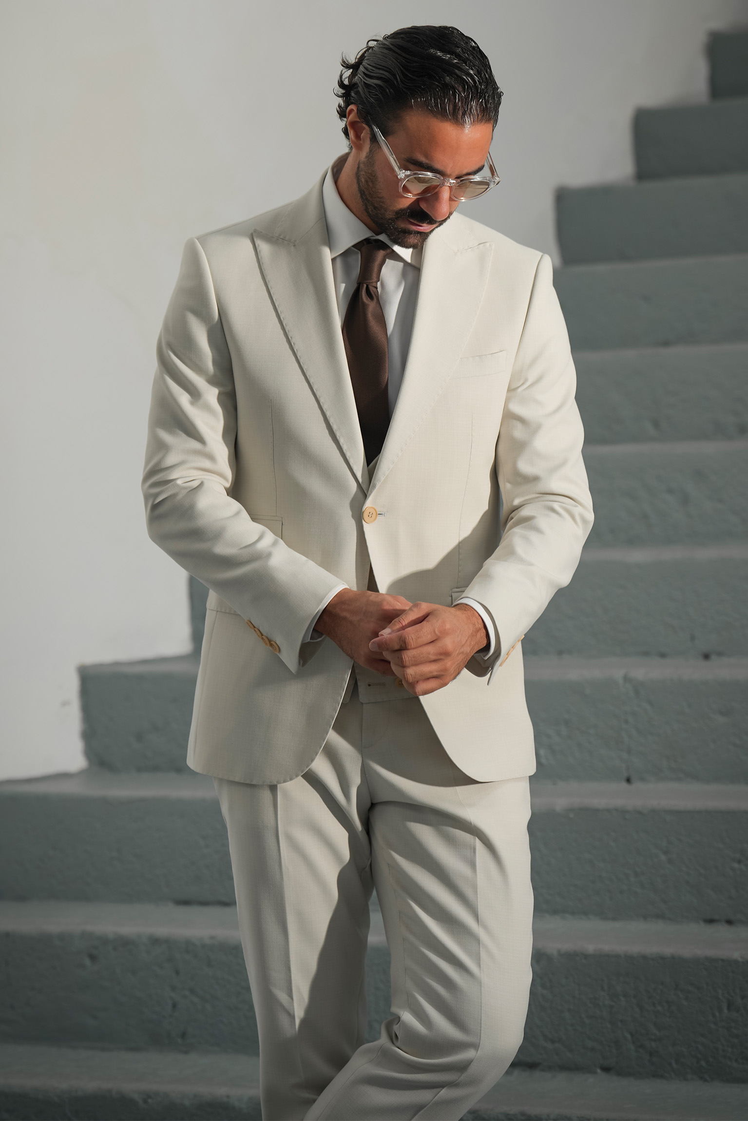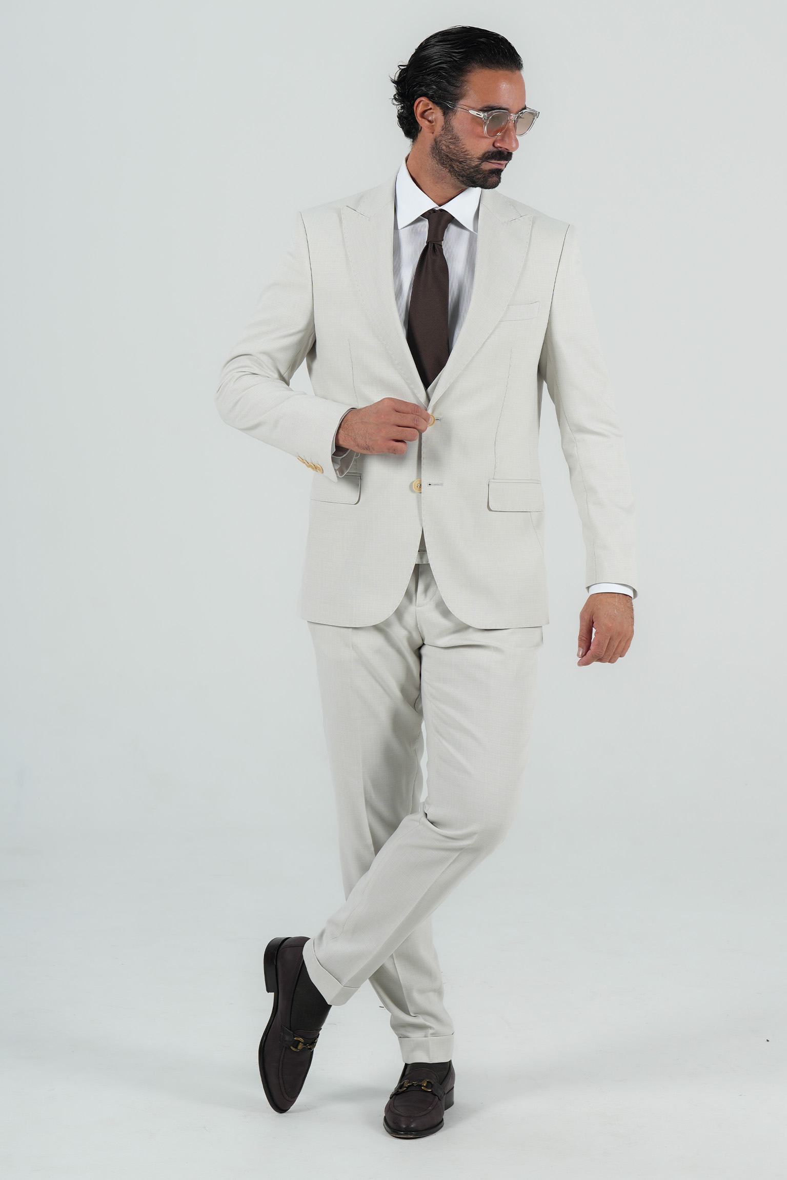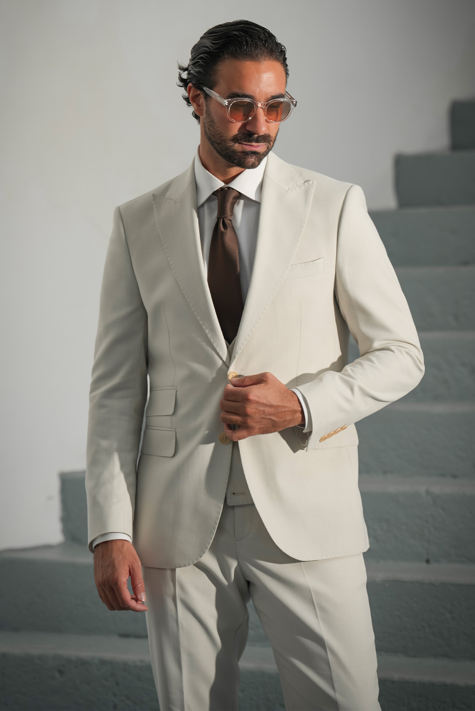Dieser beige, einreihige Anzug bietet einen frischen und eleganten Look, der sich ideal für formelle Anlässe und Veranstaltungen eignet. Hergestellt aus einer Mischung von 64% Mikrofaser, 33% Viskose und 3% Elasthan, vereint dieser Anzug ein leichtes Tragegefühl mit Haltbarkeit und Komfort. Der Schalkragen verleiht dem klassischen Design einen modernen Touch, während der Half Canvas-Aufbau eine perfekte Passform garantiert.
