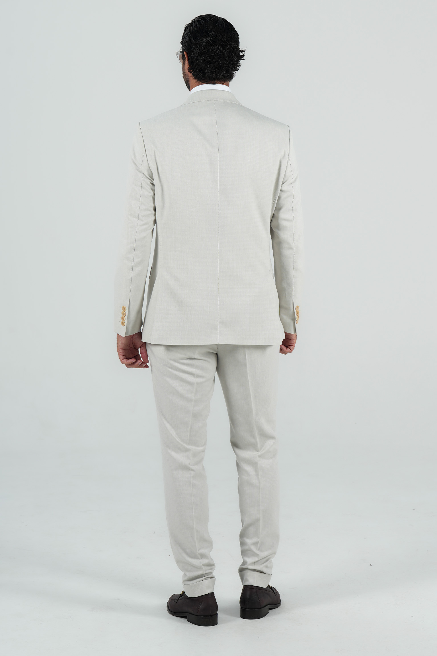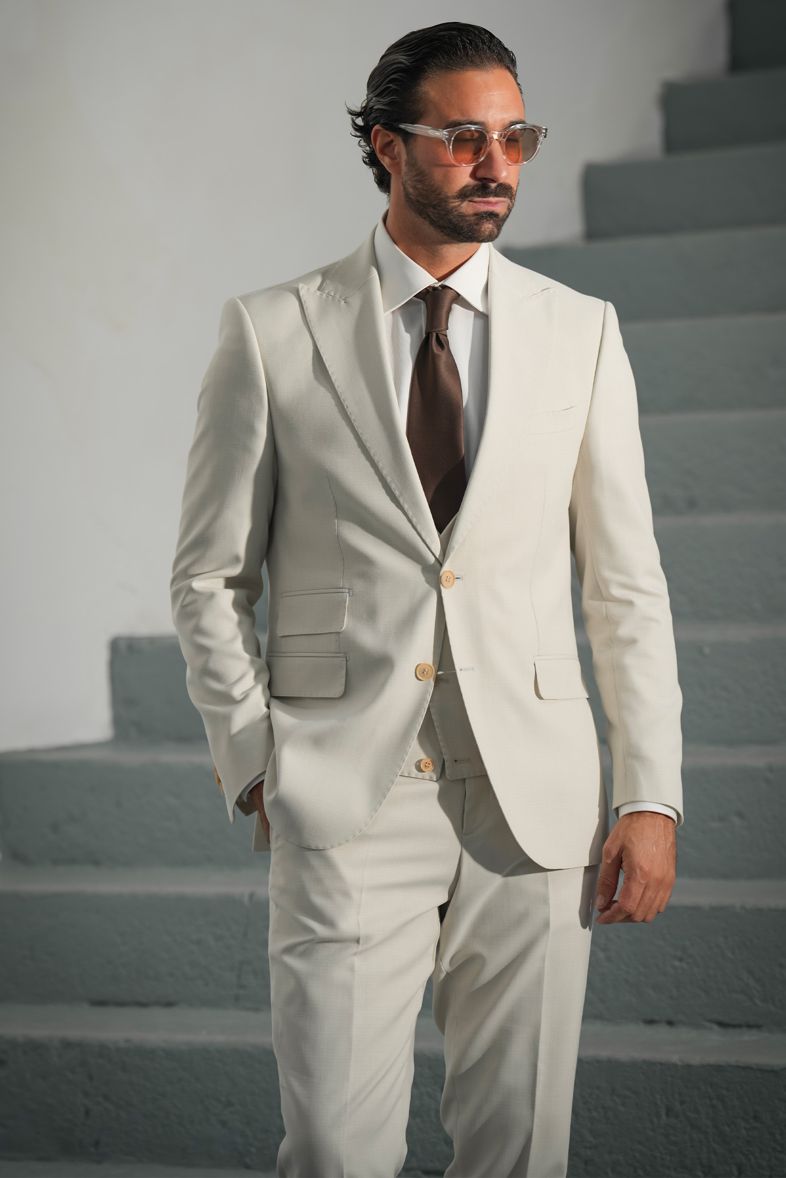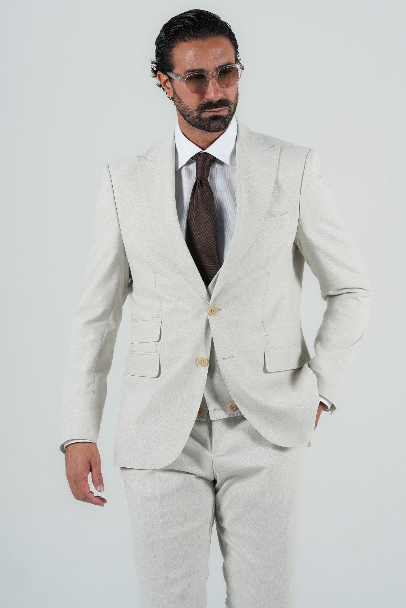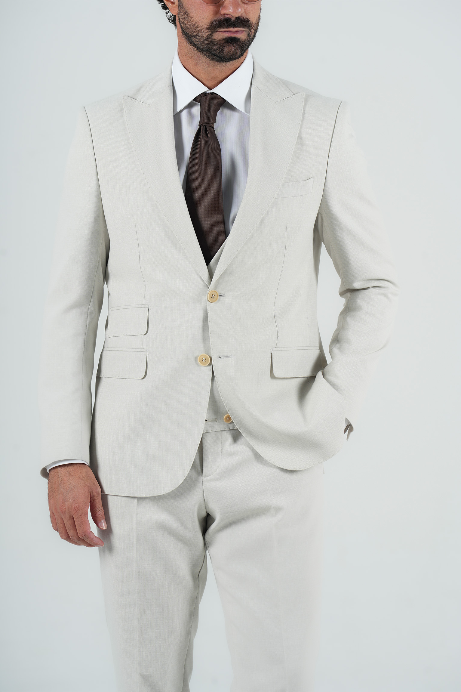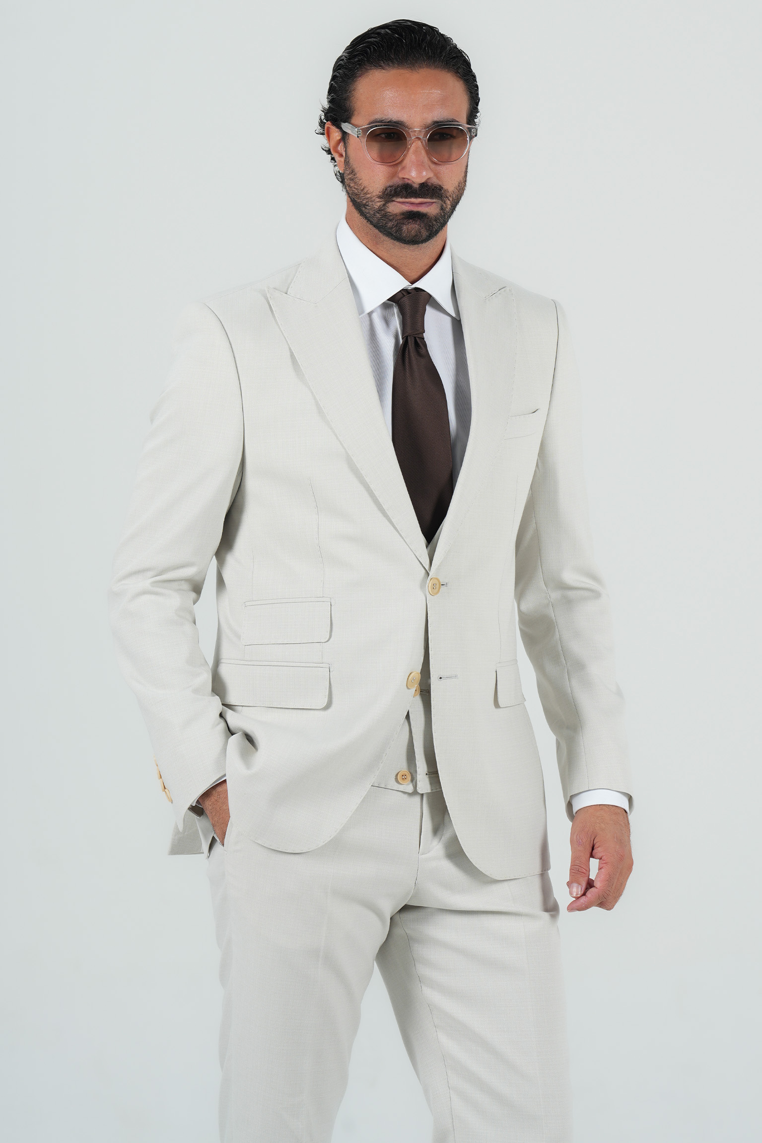 Dieser beige, einreihige Anzug bietet einen frischen und eleganten Look, der sich ideal für formelle Anlässe und Veranstaltungen eignet. Hergestellt aus einer Mischung von 64% Mikrofaser, 33% Viskose und 3% Elasthan, vereint dieser Anzug ein leichtes Tragegefühl mit Haltbarkeit und Komfort. Der Schalkragen verleiht dem klassischen Design einen modernen Touch, während der Half Canvas-Aufbau eine perfekte Passform garantiert.