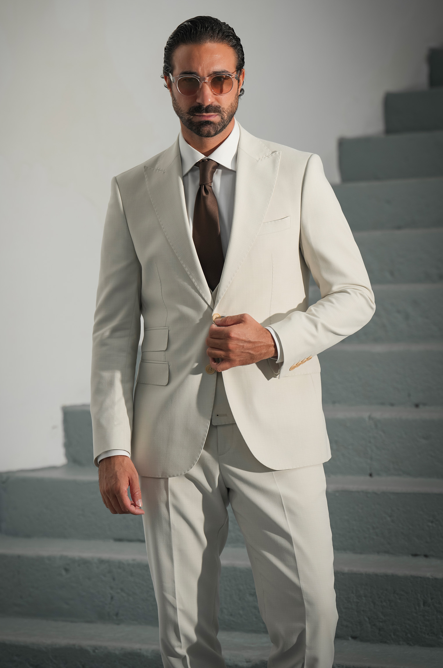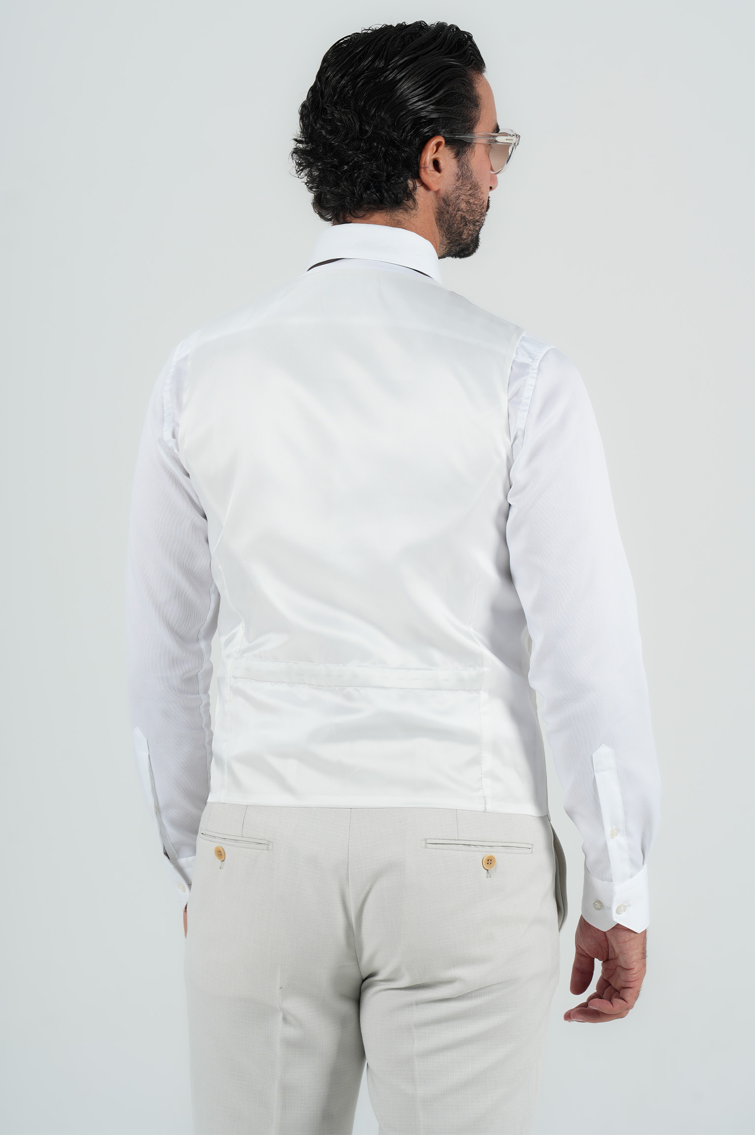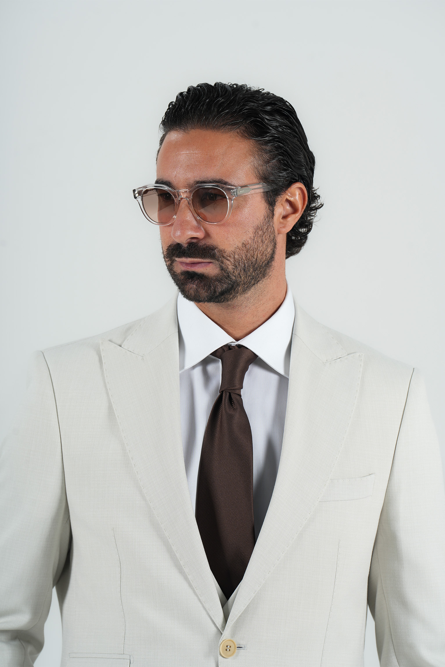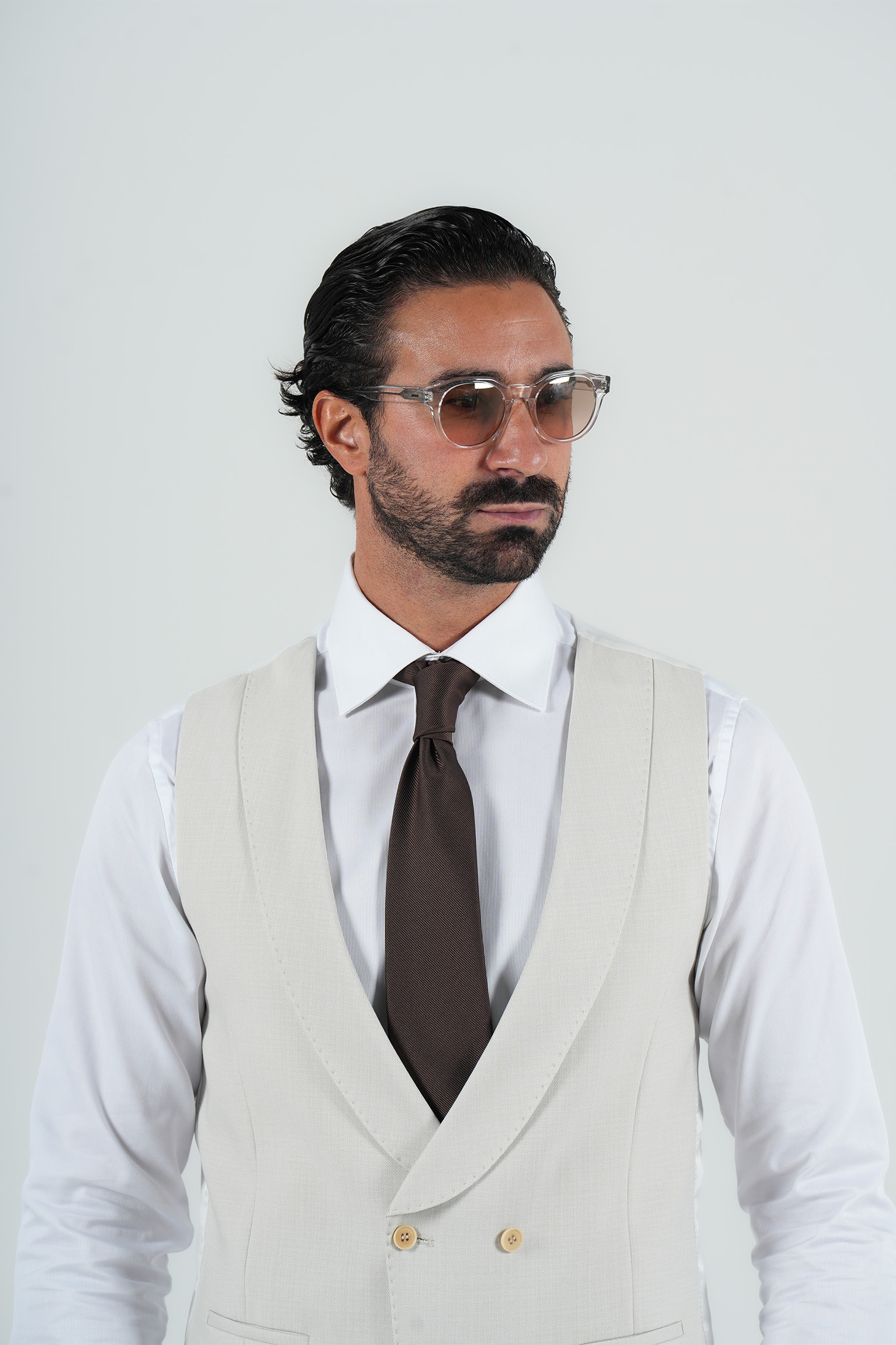 Dieser beige, einreihige Anzug bietet einen frischen und eleganten Look, der sich ideal für formelle Anlässe und Veranstaltungen eignet. Hergestellt aus einer Mischung von 64% Mikrofaser, 33% Viskose und 3% Elasthan, vereint dieser Anzug ein leichtes Tragegefühl mit Haltbarkeit und Komfort. Der Schalkragen verleiht dem klassischen Design einen modernen Touch, während der Half Canvas-Aufbau eine perfekte Passform garantiert.