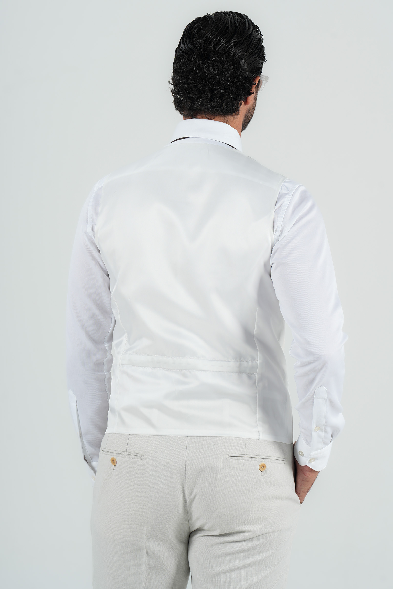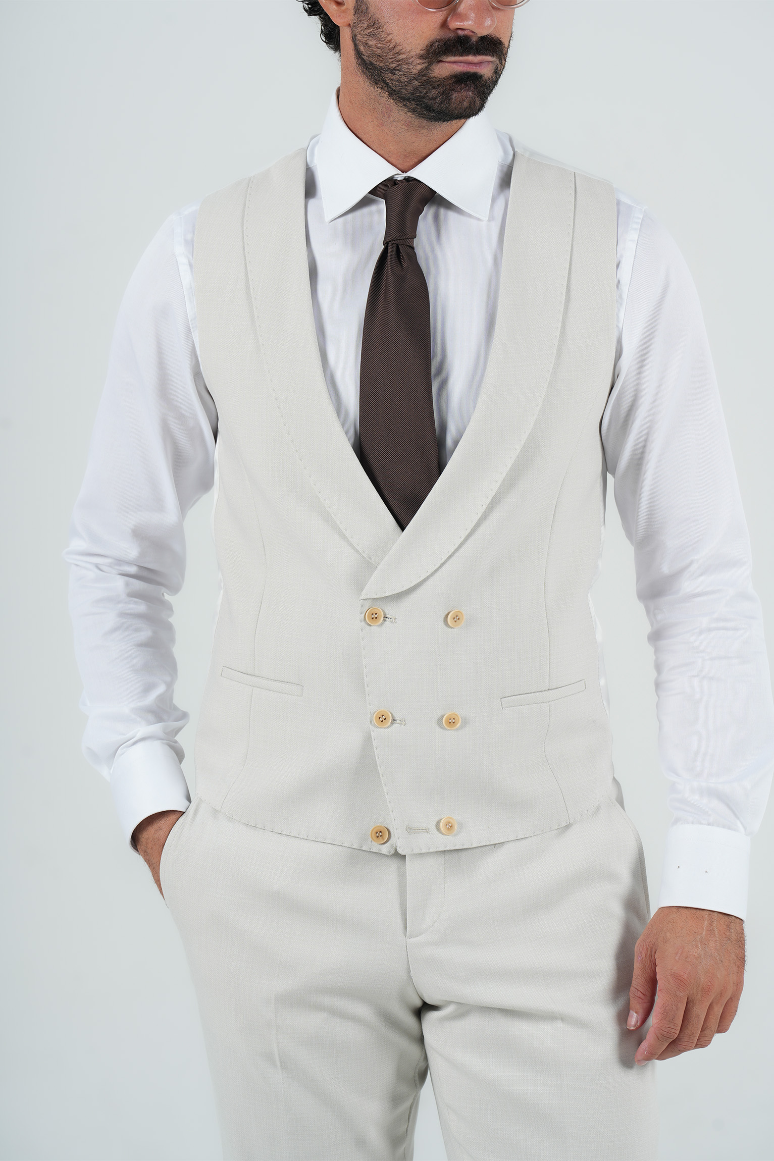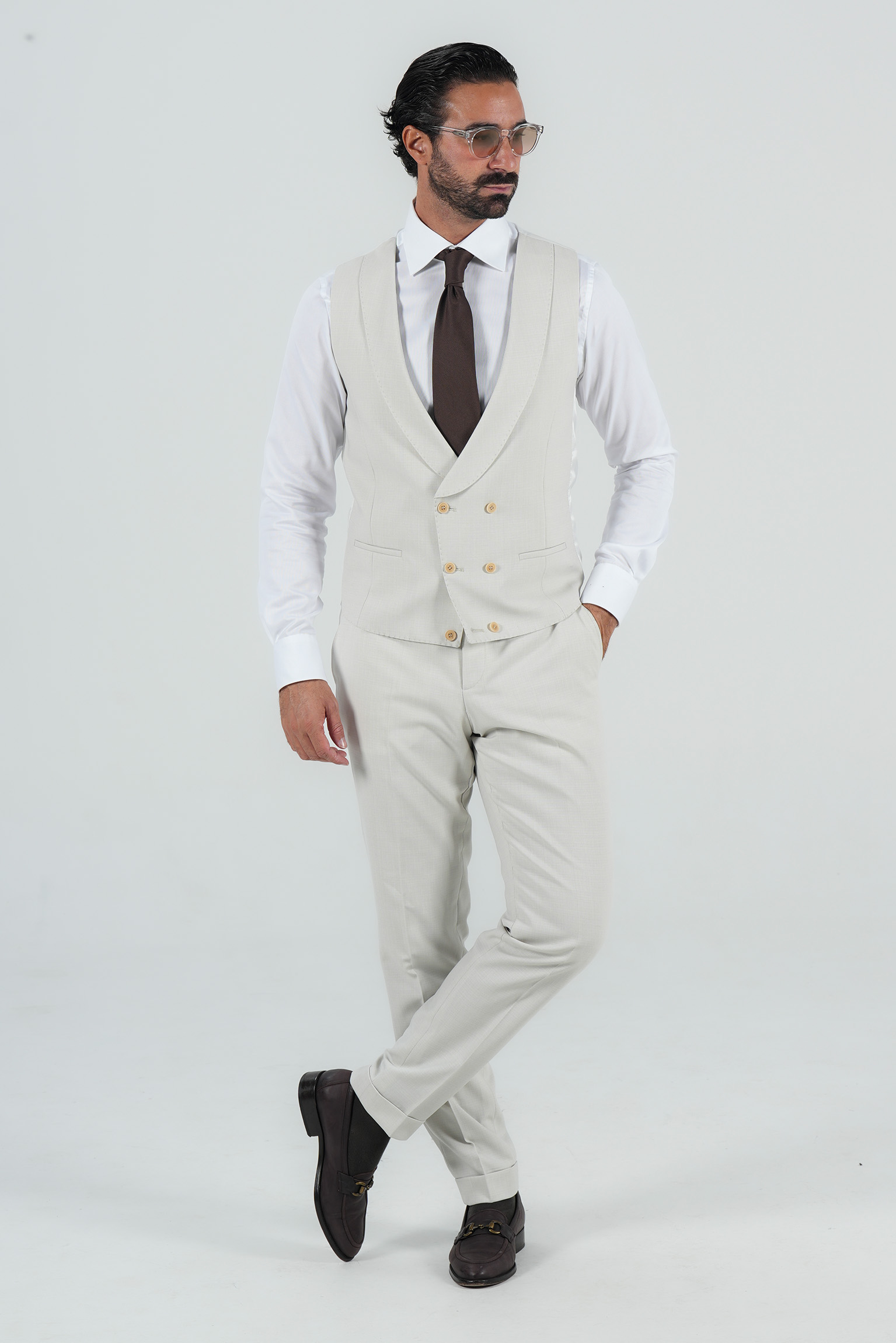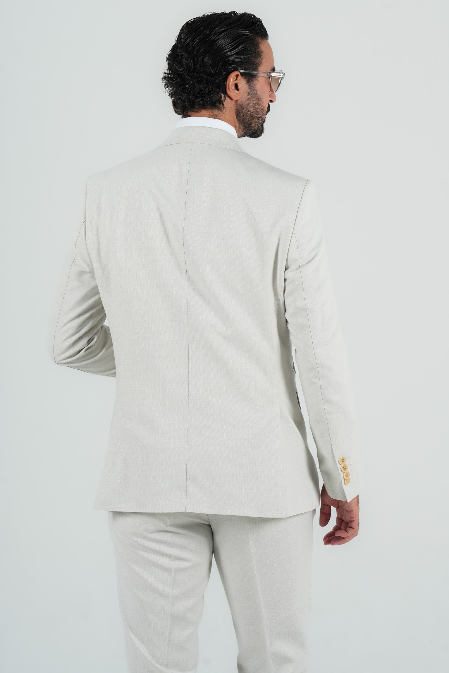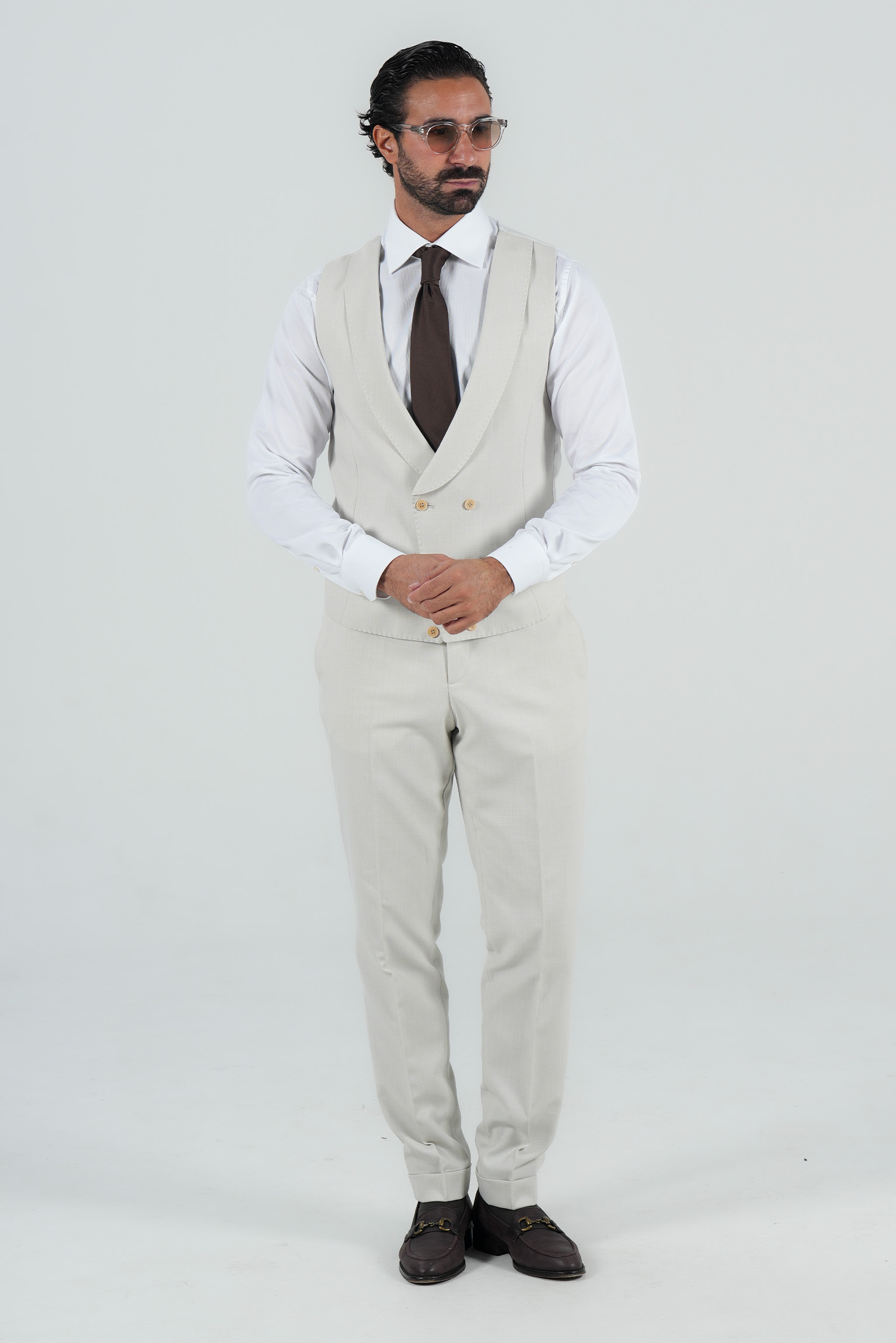 Dieser beige, einreihige Anzug bietet einen frischen und eleganten Look, der sich ideal für formelle Anlässe und Veranstaltungen eignet. Hergestellt aus einer Mischung von 64% Mikrofaser, 33% Viskose und 3% Elasthan, vereint dieser Anzug ein leichtes Tragegefühl mit Haltbarkeit und Komfort. Der Schalkragen verleiht dem klassischen Design einen modernen Touch, während der Half Canvas-Aufbau eine perfekte Passform garantiert.
