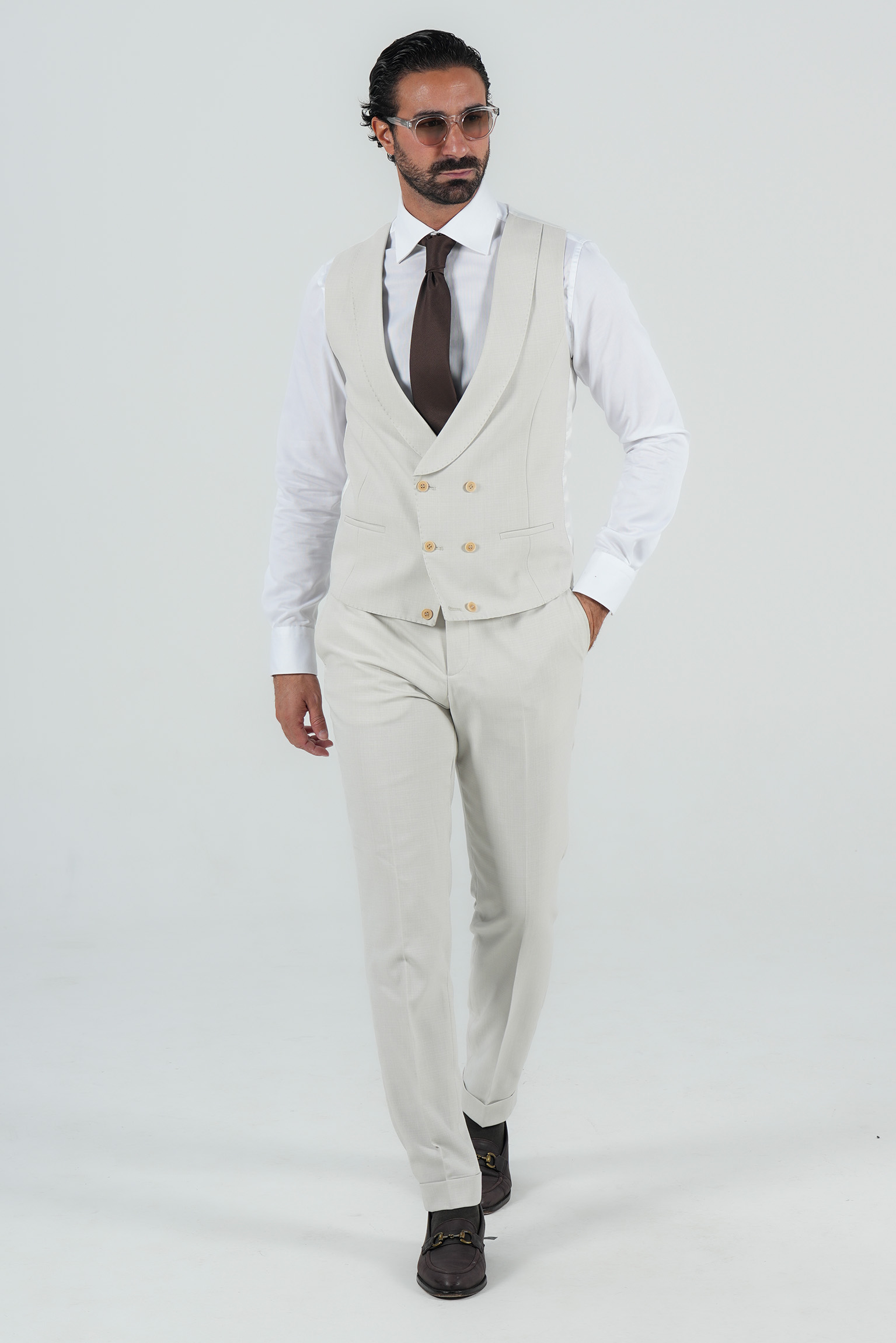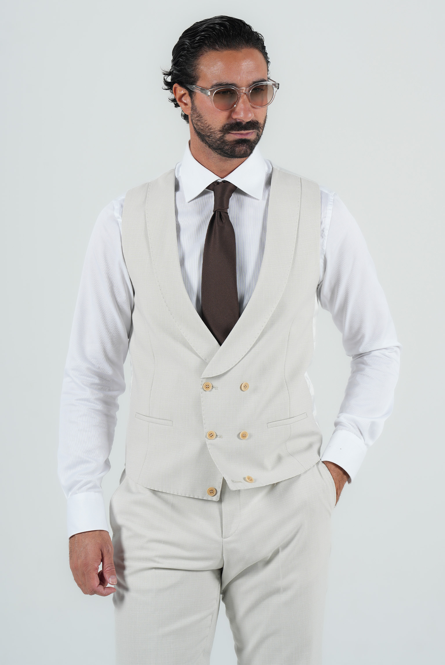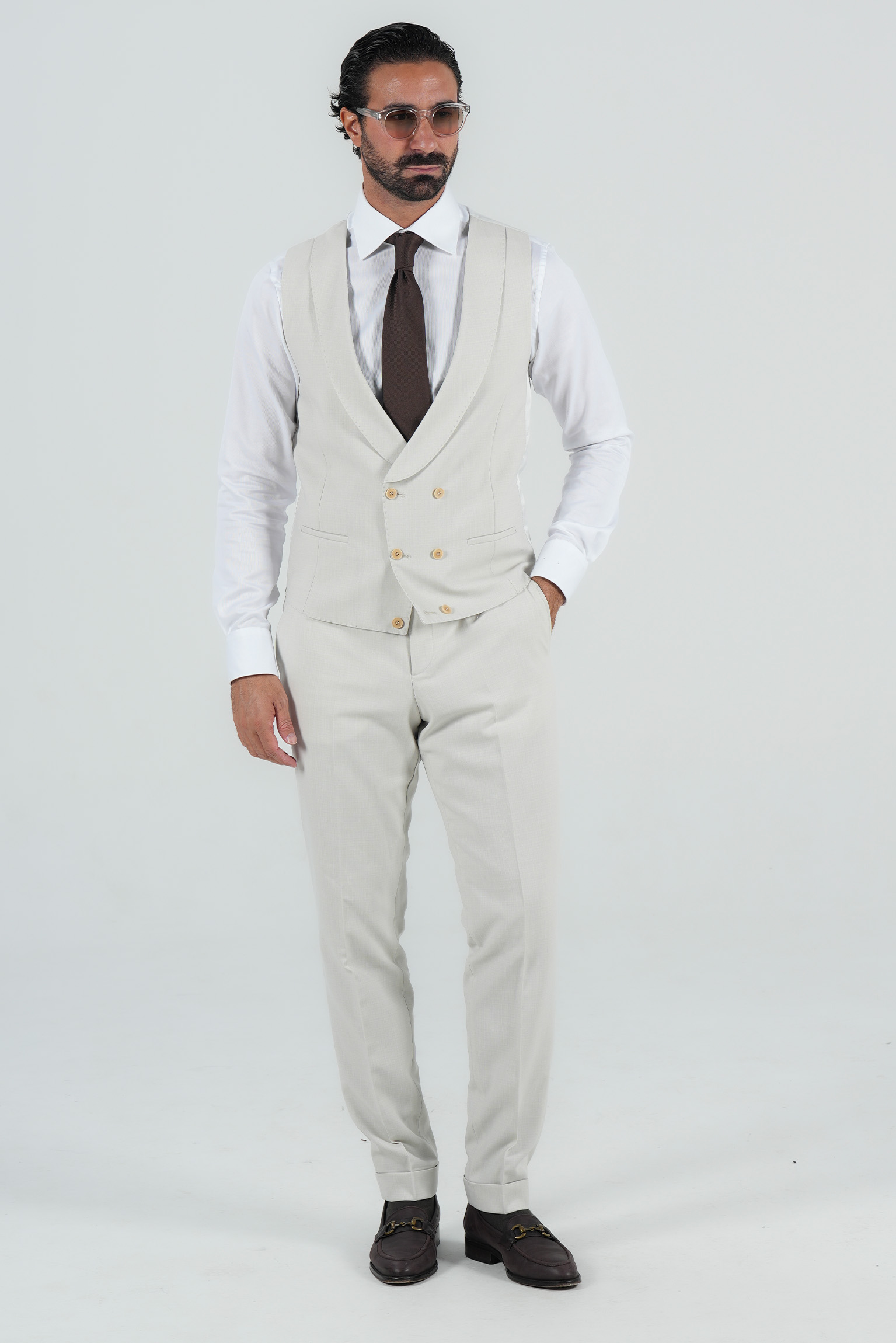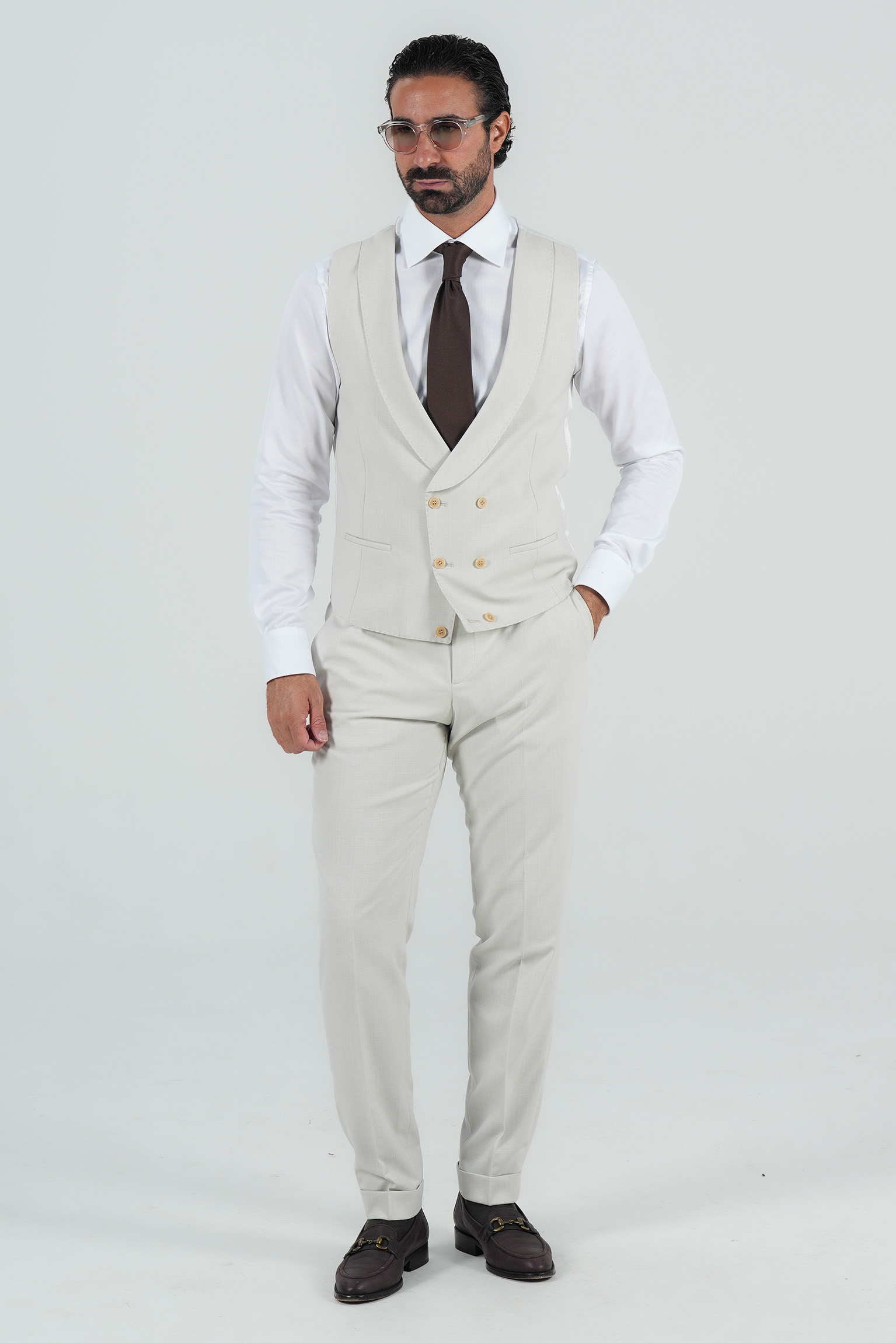 Dieser beige, einreihige Anzug bietet einen frischen und eleganten Look, der sich ideal für formelle Anlässe und Veranstaltungen eignet. Hergestellt aus einer Mischung von 64% Mikrofaser, 33% Viskose und 3% Elasthan, vereint dieser Anzug ein leichtes Tragegefühl mit Haltbarkeit und Komfort. Der Schalkragen verleiht dem klassischen Design einen modernen Touch, während der Half Canvas-Aufbau eine perfekte Passform garantiert.