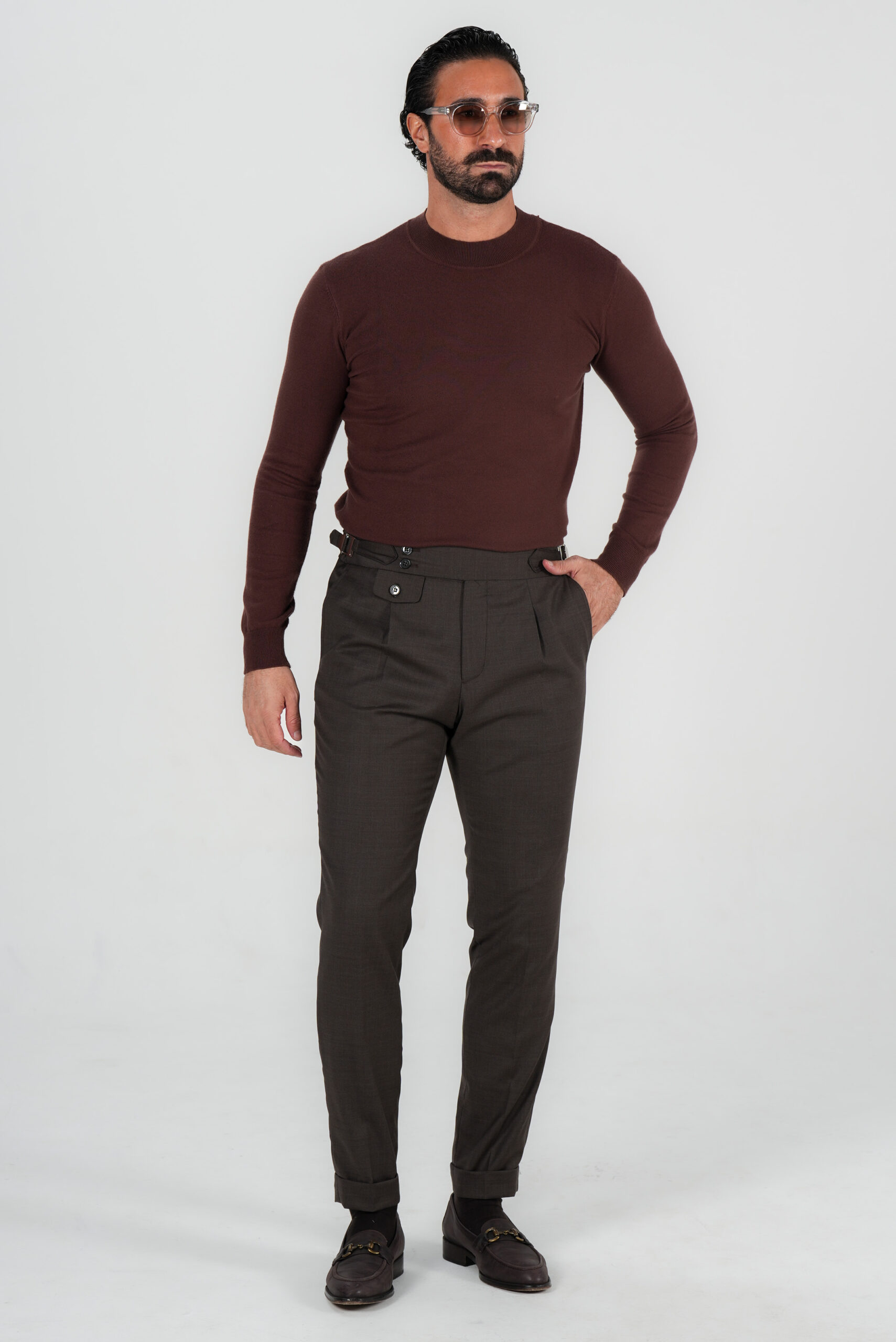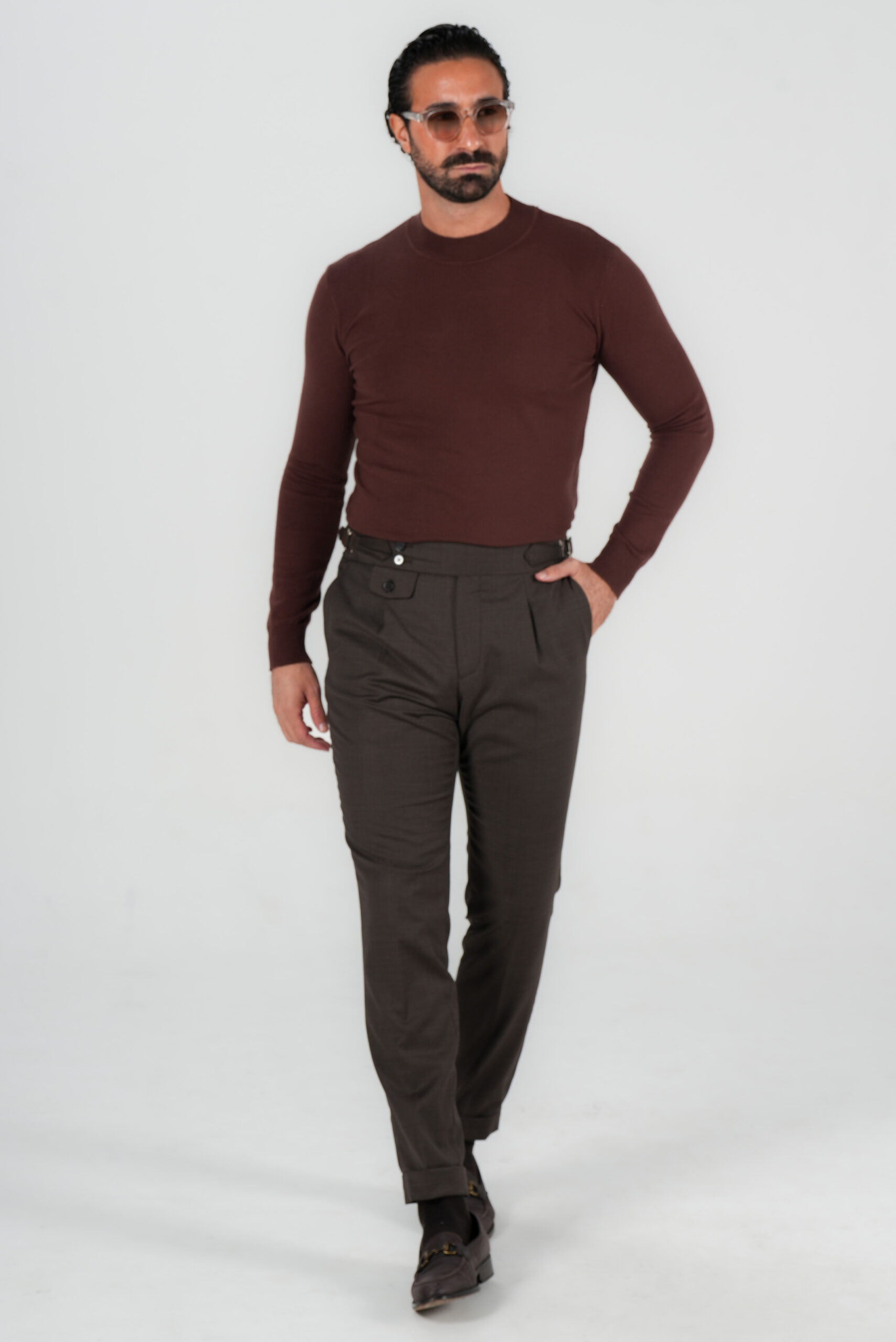 Diese braune Hose ist aus 100% Wolle Super 150s – Vitale Barberis Canonico gefertigt und bietet eine feine Textur, einen eleganten Fall und natuerliche Atmungsaktivitaet. Im klassischen italienischen Stil gefertigt, verfuegt sie ueber eine Bundfalte, einen Knopfverschluss mit Seitenspangen und verstellbare Seitenriegel, die eine praezise Passform ohne Guertel ermoeglichen.
