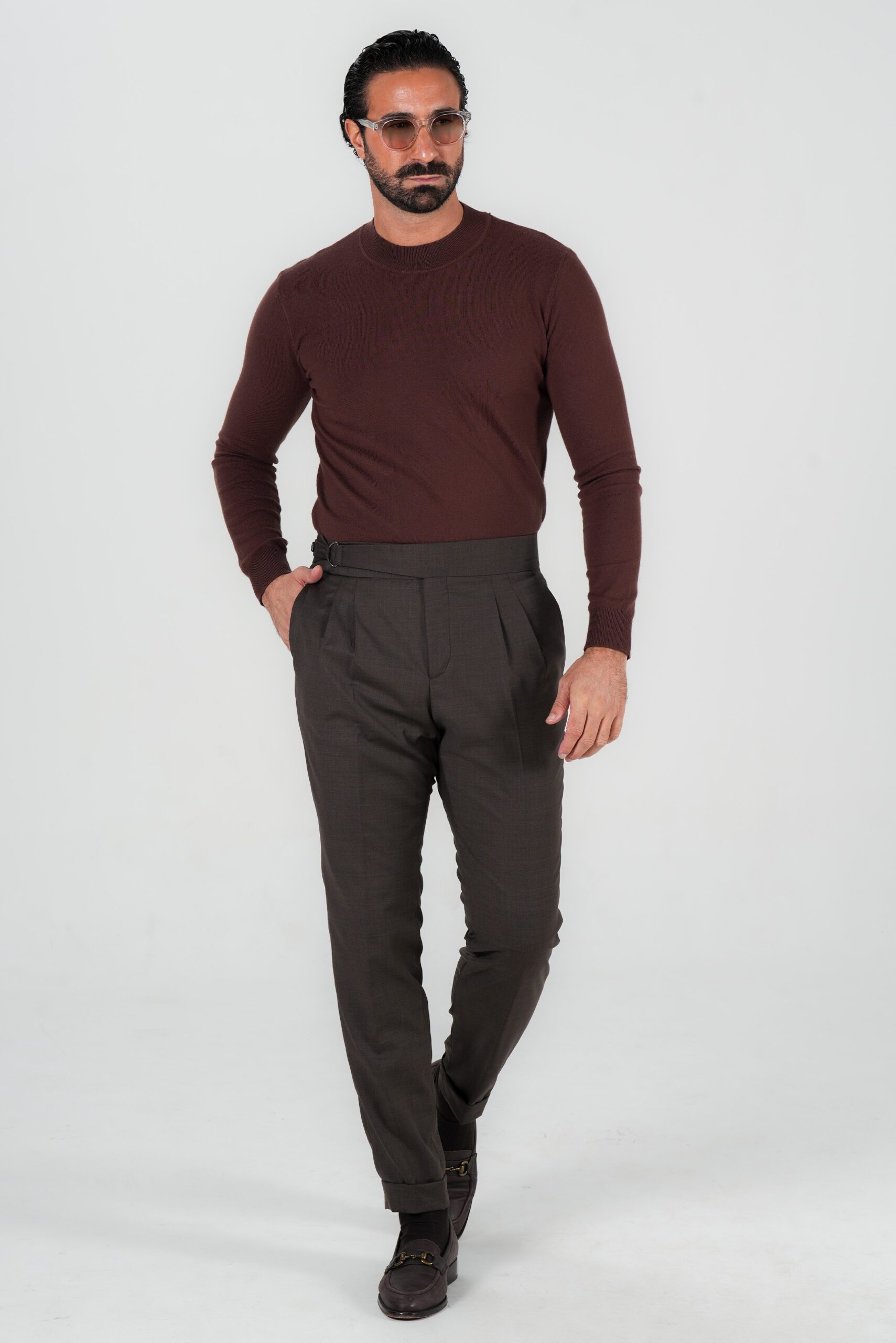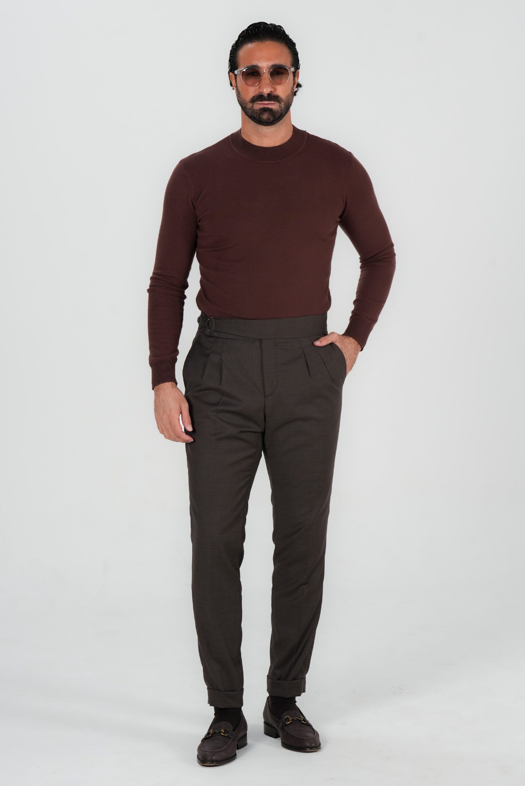 Diese braune Hose ist aus 100% Wolle Super 150s – Vitale Barberis Canonico gefertigt und bietet eine glatte Textur und einen eleganten Fall mit hervorragender Atmungsaktivitaet. Im klassischen italienischen Stil gestaltet, verfuegt sie ueber zwei Bundfalte und verstellbare Seitenspangen, die eine elegante Passform ohne Guertel ermoeglichen.
