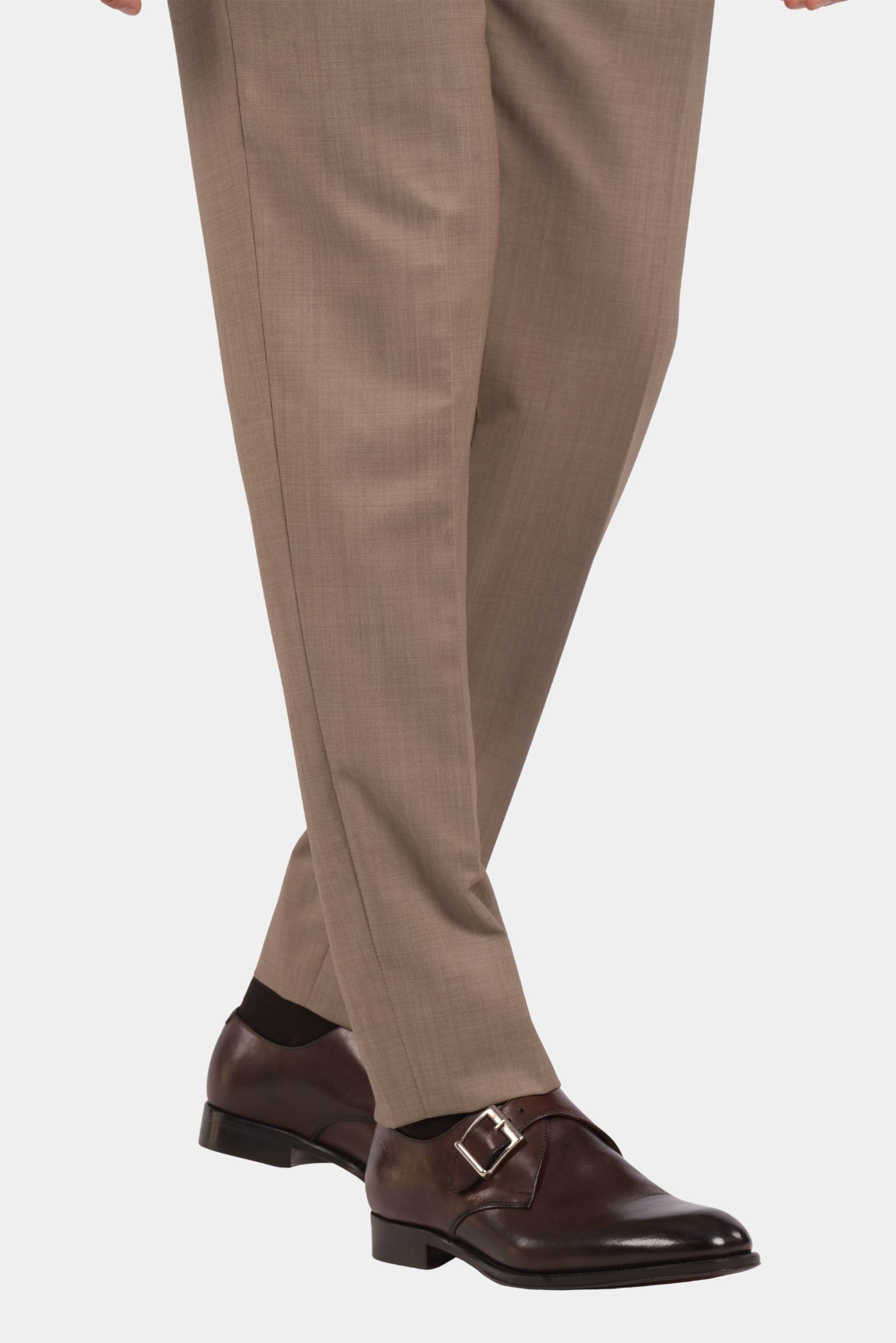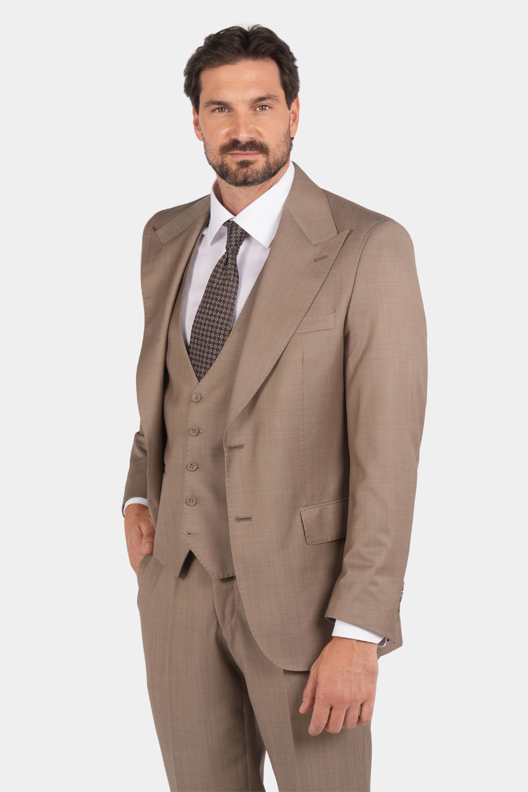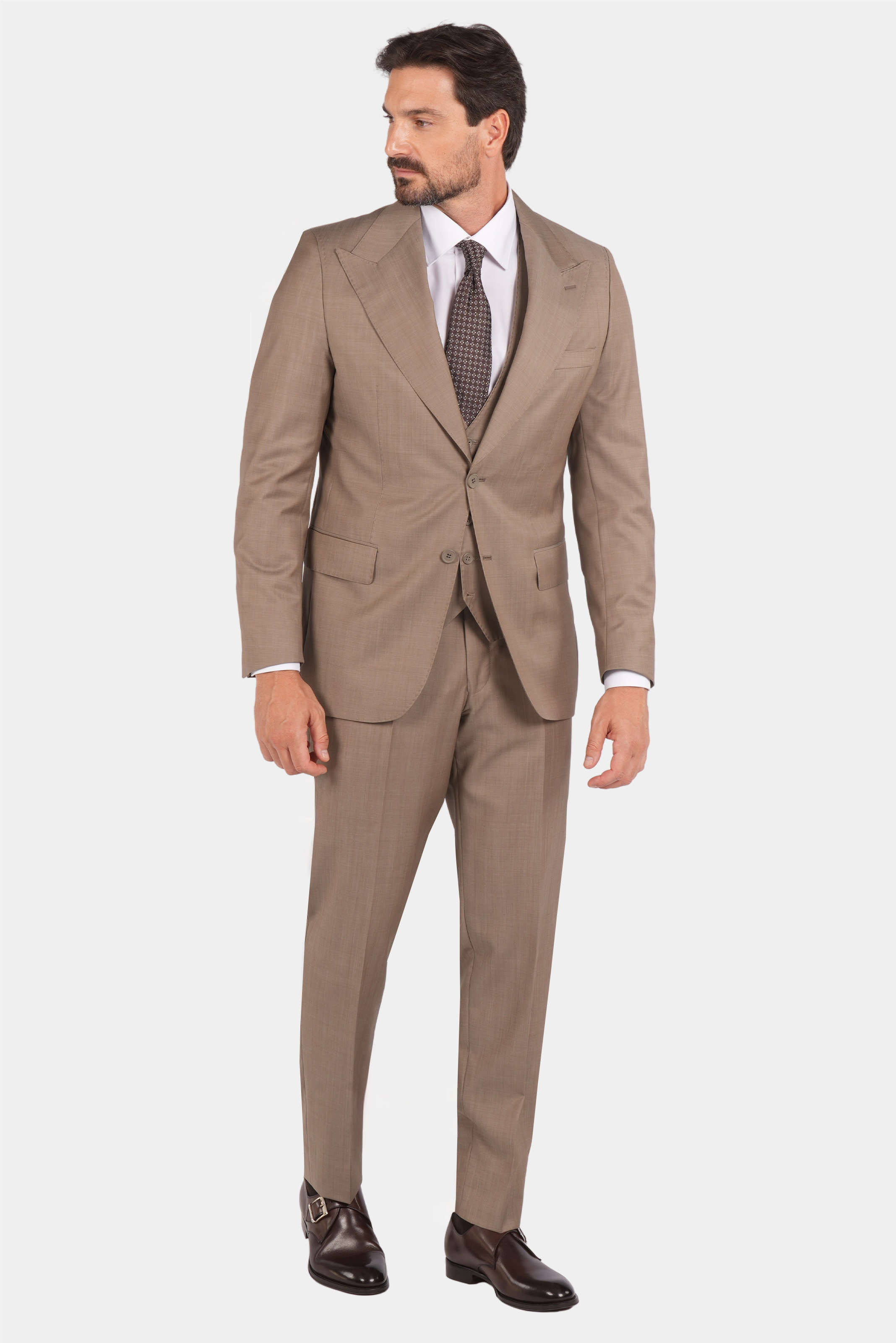 Dieser cremefarbene, einreihige Anzug strahlt Eleganz und Stil aus und ist perfekt für formelle Anlässe und anspruchsvolle Zusammenkünfte. Hergestellt aus hochwertiger Super 160S Wolle von Vitale Barberis Canonico, vereint er Luxus mit Langlebigkeit. Der Schalkragen verleiht dem modernen Design eine klassische Note, während der Half Canvas-Aufbau eine maßgeschneiderte Passform und Komfort gewährleistet. Der Anzug ist vollständig mit Viskose gefüttert, was für ein glattes, luxuriöses Gefühl sorgt. Eine Innentasche bietet zusätzliche Praktikabilität.