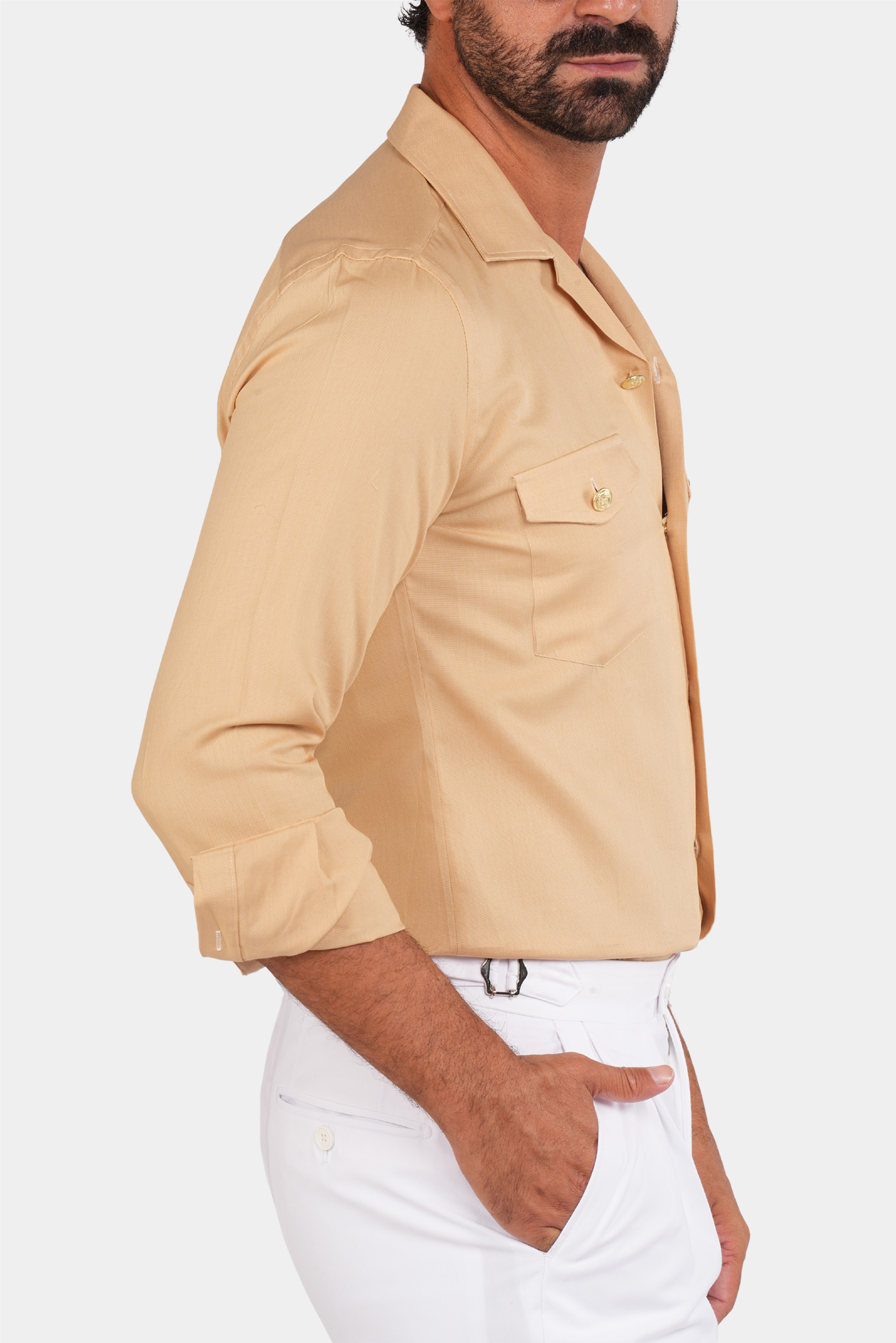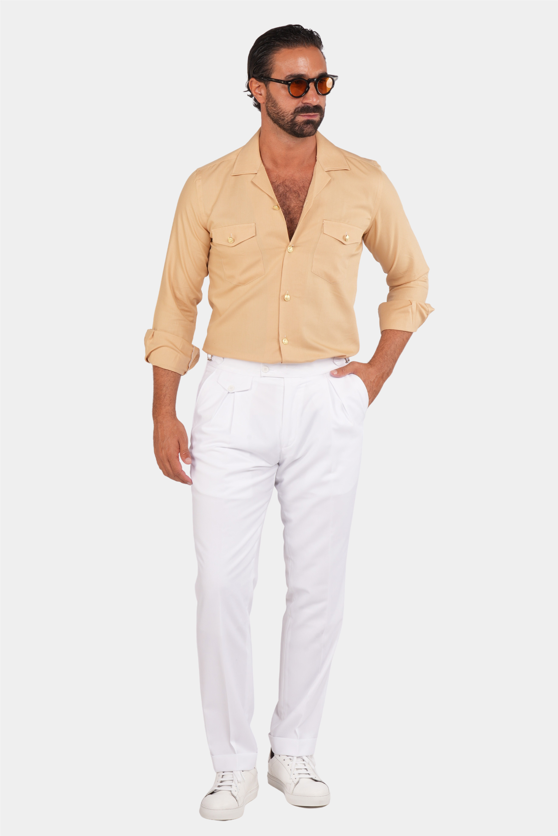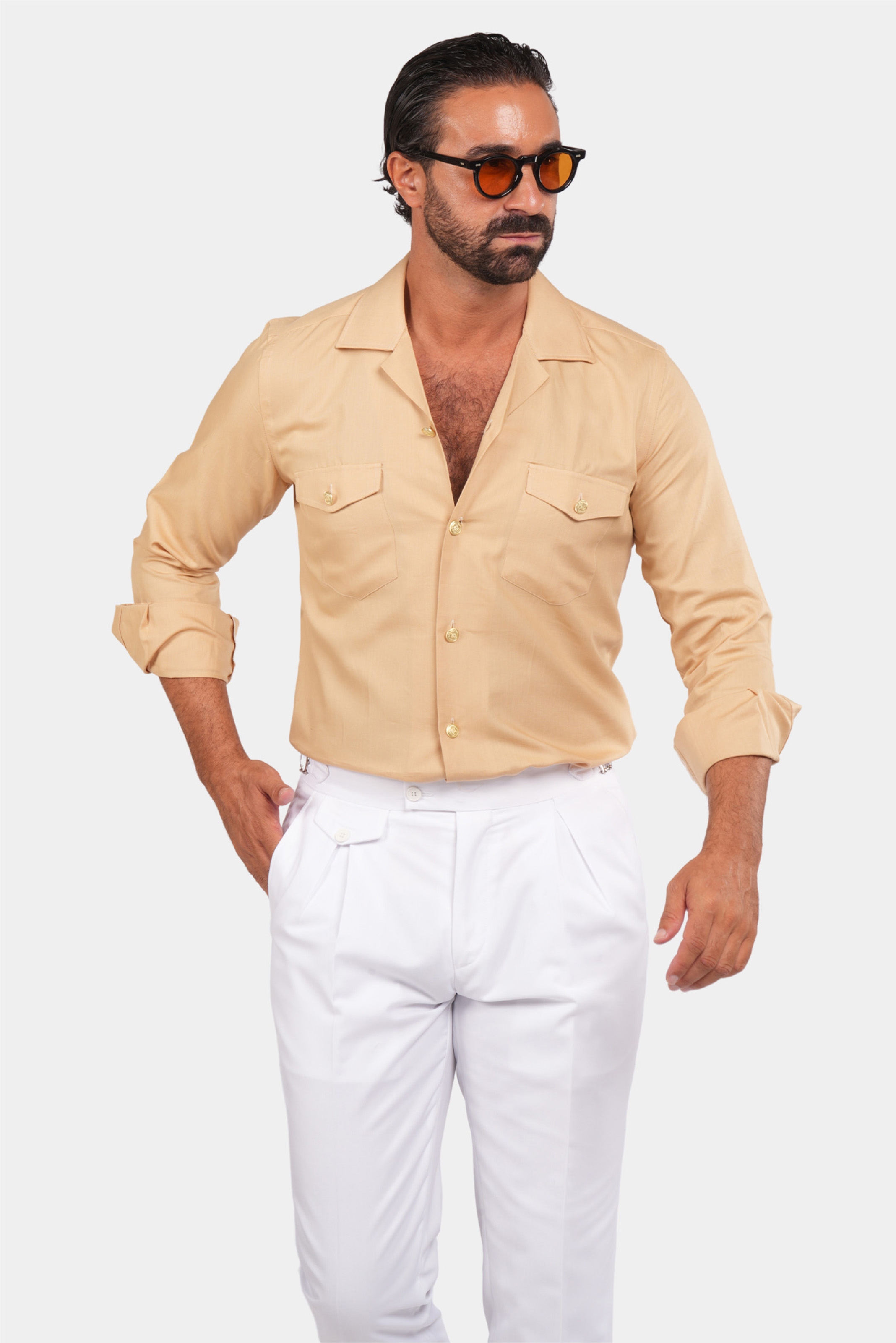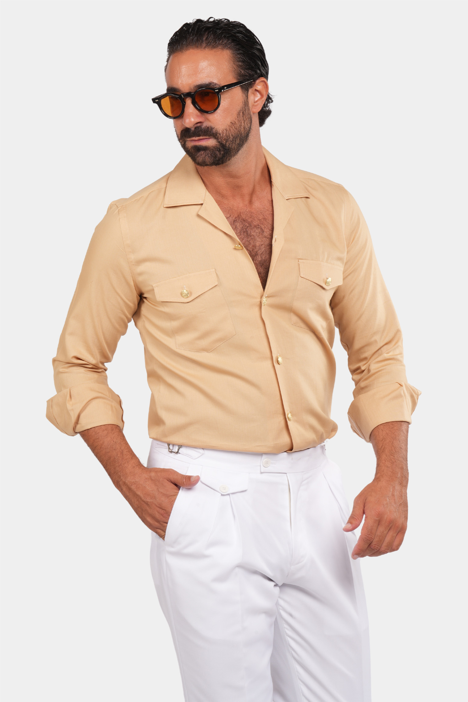 Dieses cremefarbene Safarihemd verkörpert mühelose Eleganz und entspannte Raffinesse. Gefertigt in Italien aus 100 % hochwertiger Baumwolle, bietet es außergewöhnliche Atmungsaktivität und Tragekomfort – ideal für stilvolle Outfits bei warmem Wetter. Der offene Camp-Kragen und die aufgesetzten Brusttaschen mit Patte spiegeln den authentischen Safari-Stil wider, während die leichte Stoffstruktur einen legeren, aber gepflegten Look ermöglicht.