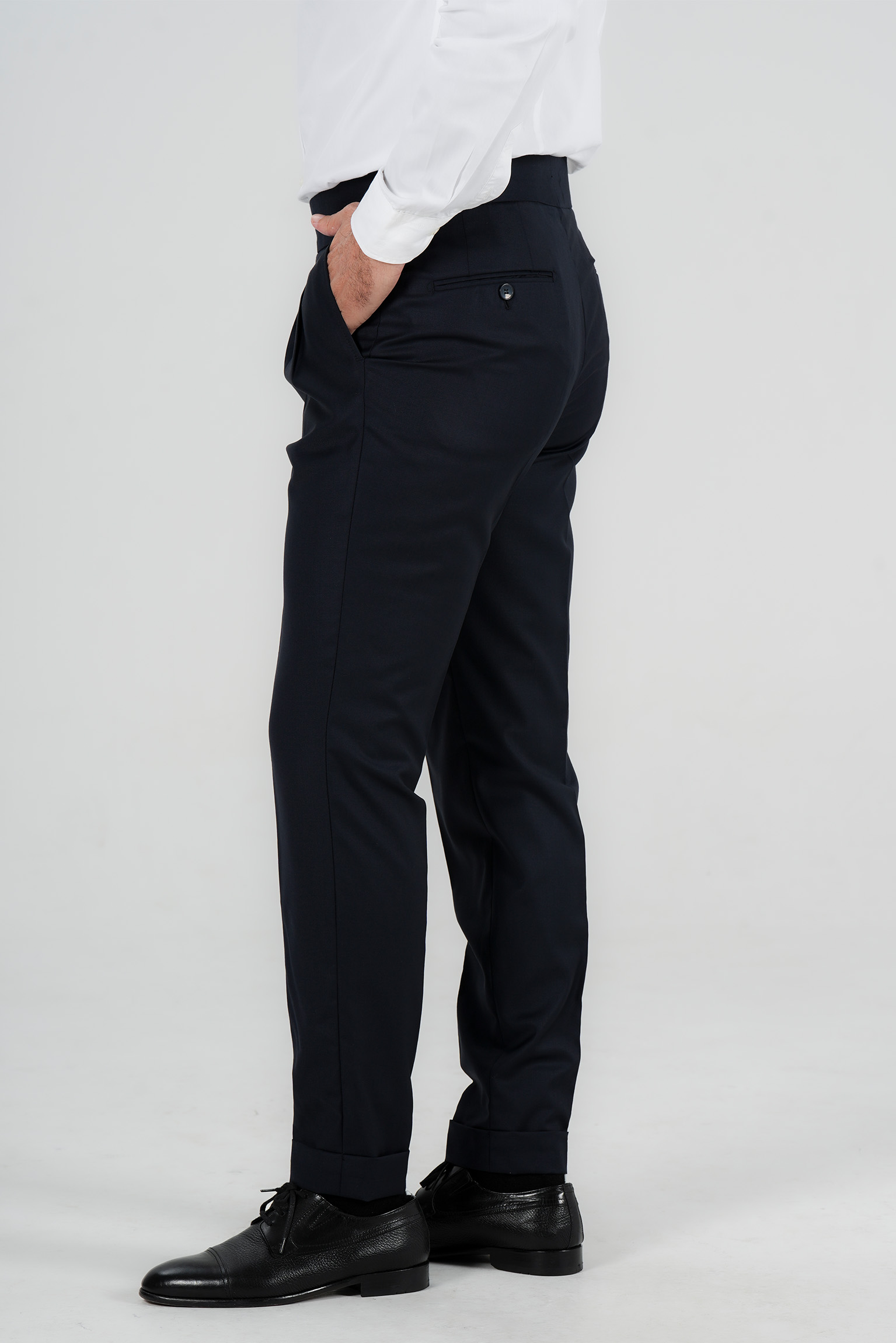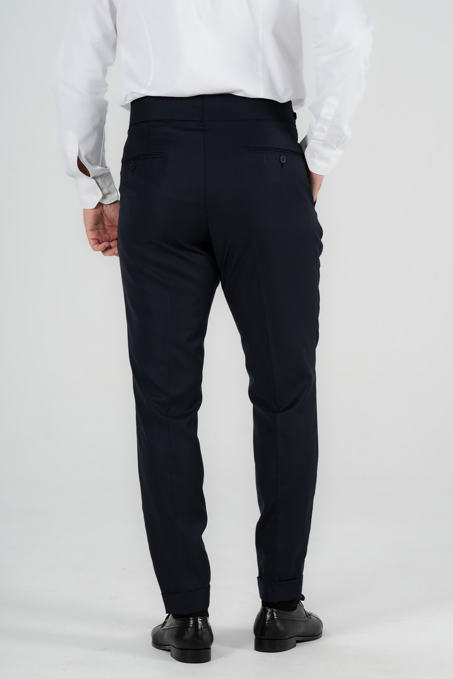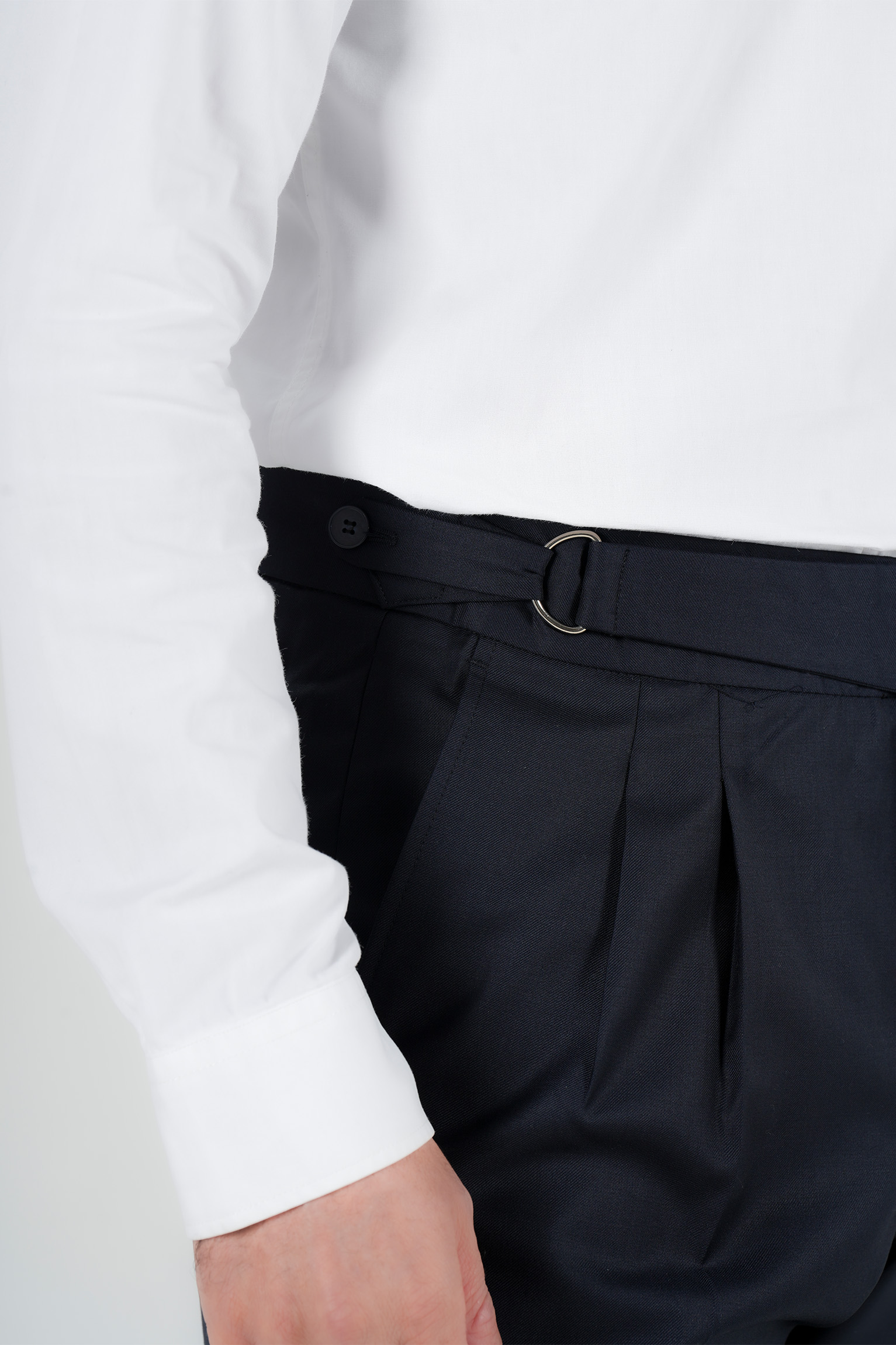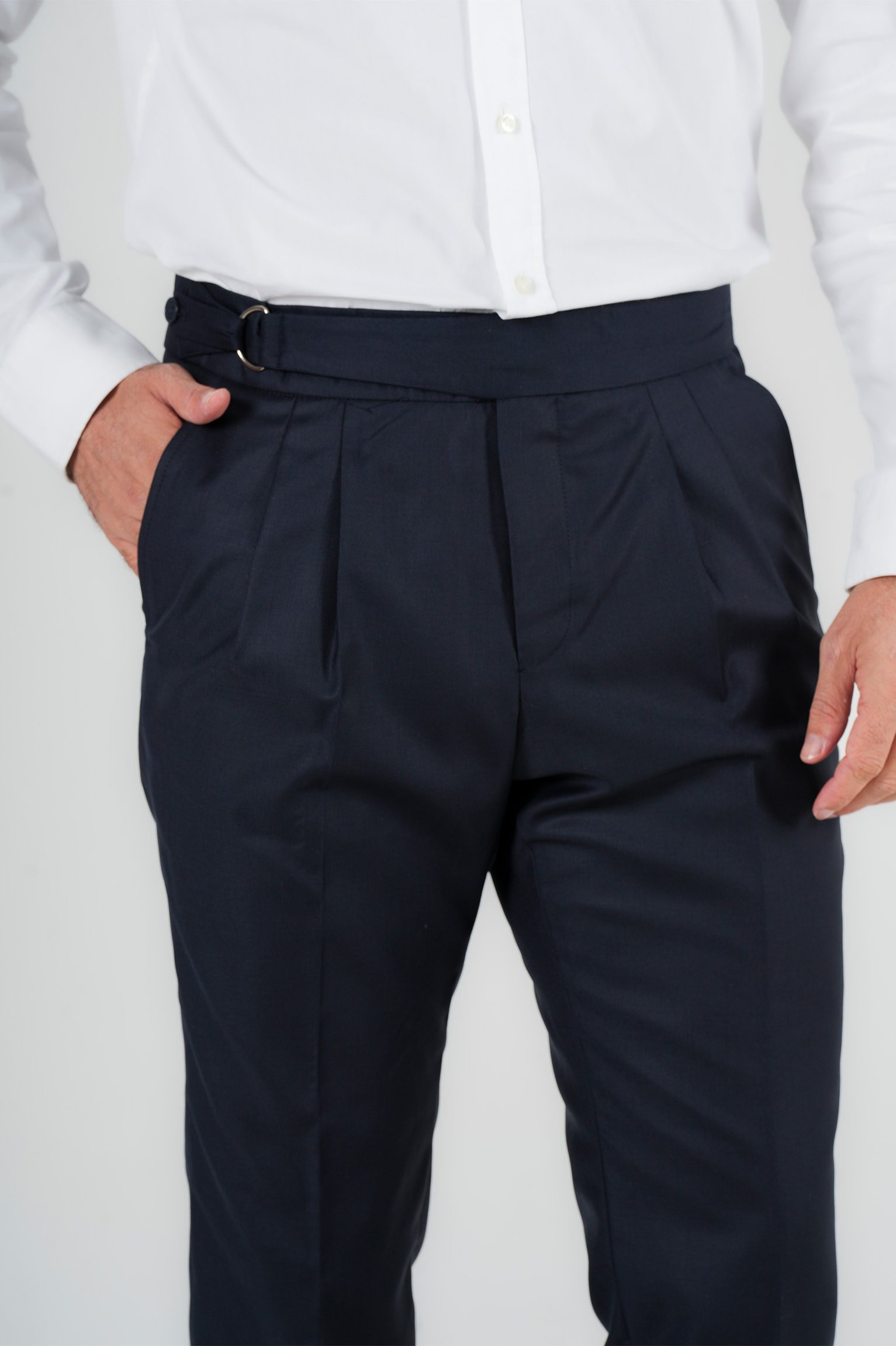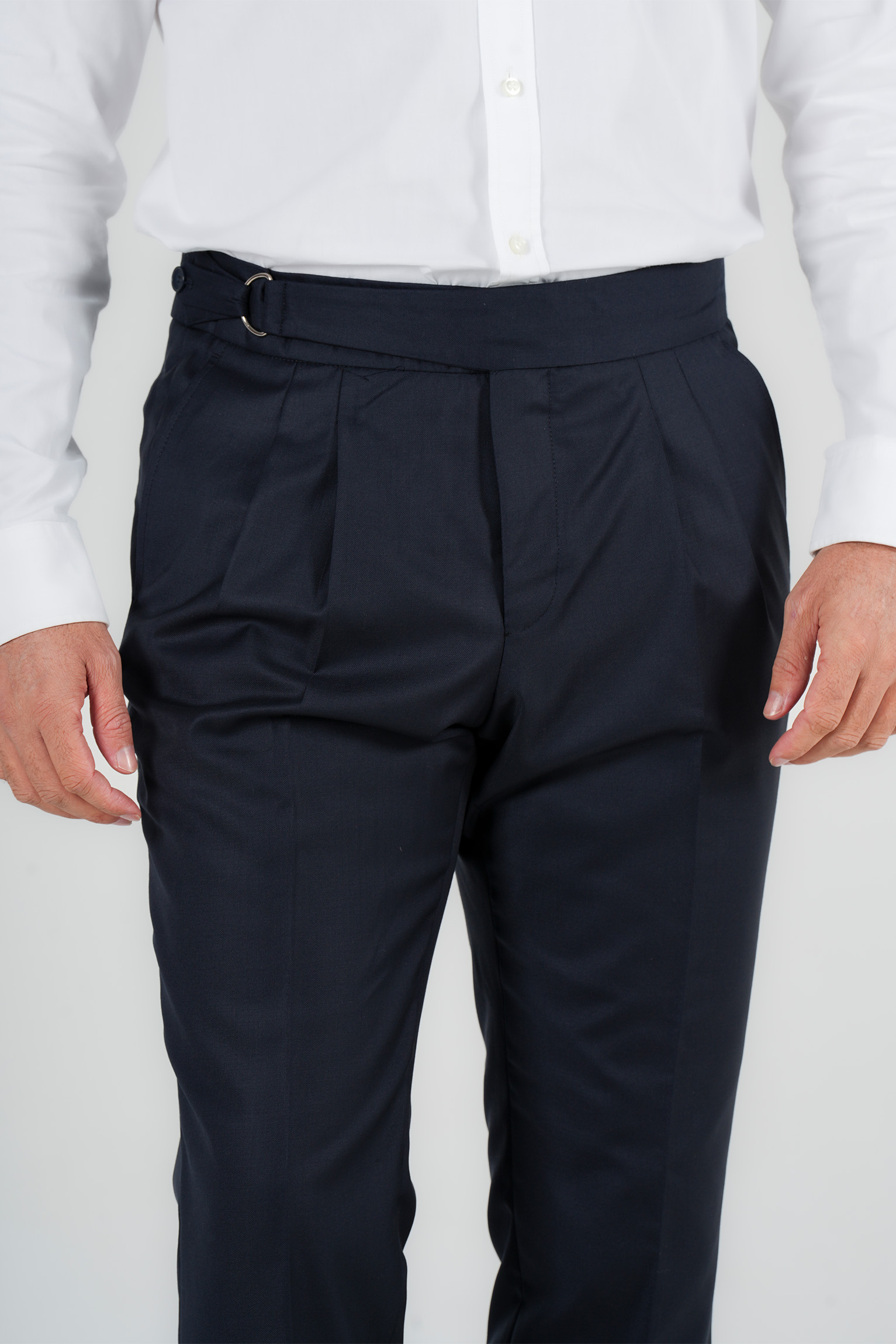 Mit ihrem klassischen italienischen Schnitt verfuegt diese Hose ueber zwei Bundfalten und verstellbare Seitenspangen, die eine perfekte, bequeme Passform ohne Guertel ermoeglichen. Der tiefe Dunkelblauton verleiht dezente Exklusivitaet und macht sie zur idealen Wahl fuer formelle Anlaesse, Business-Looks oder elegante Freizeitoutfits.