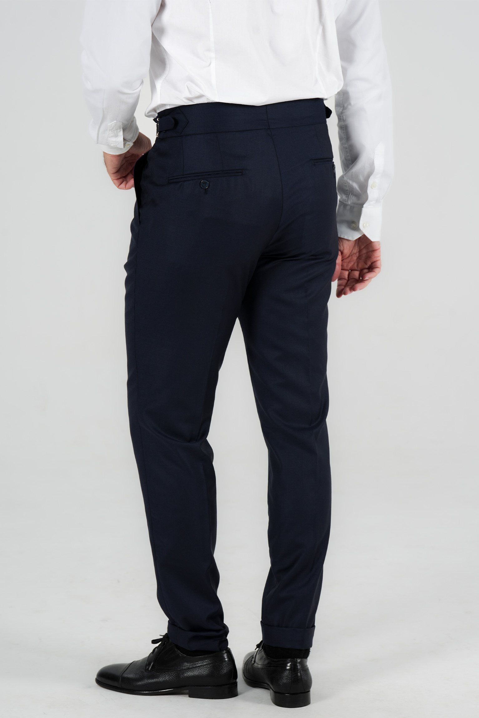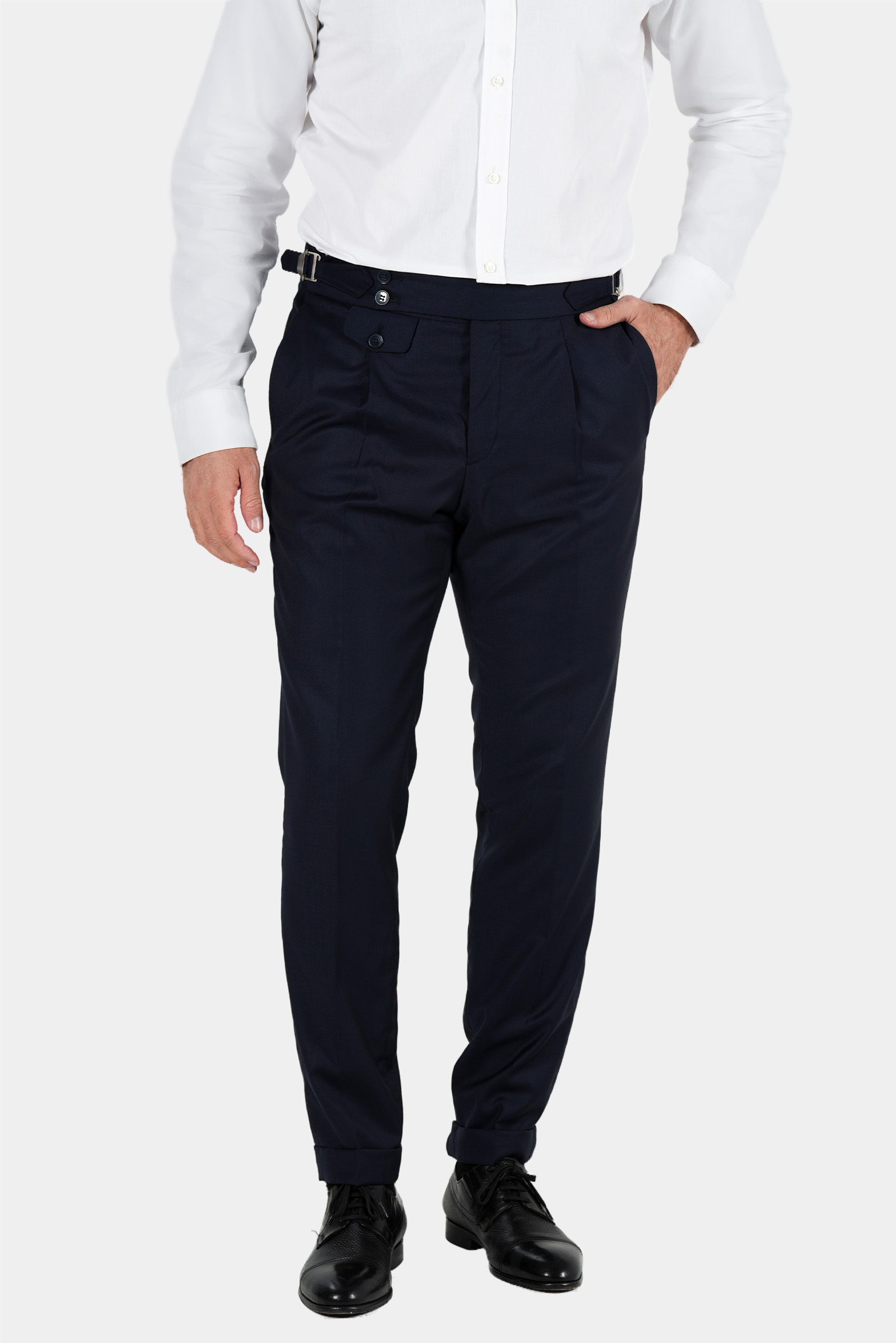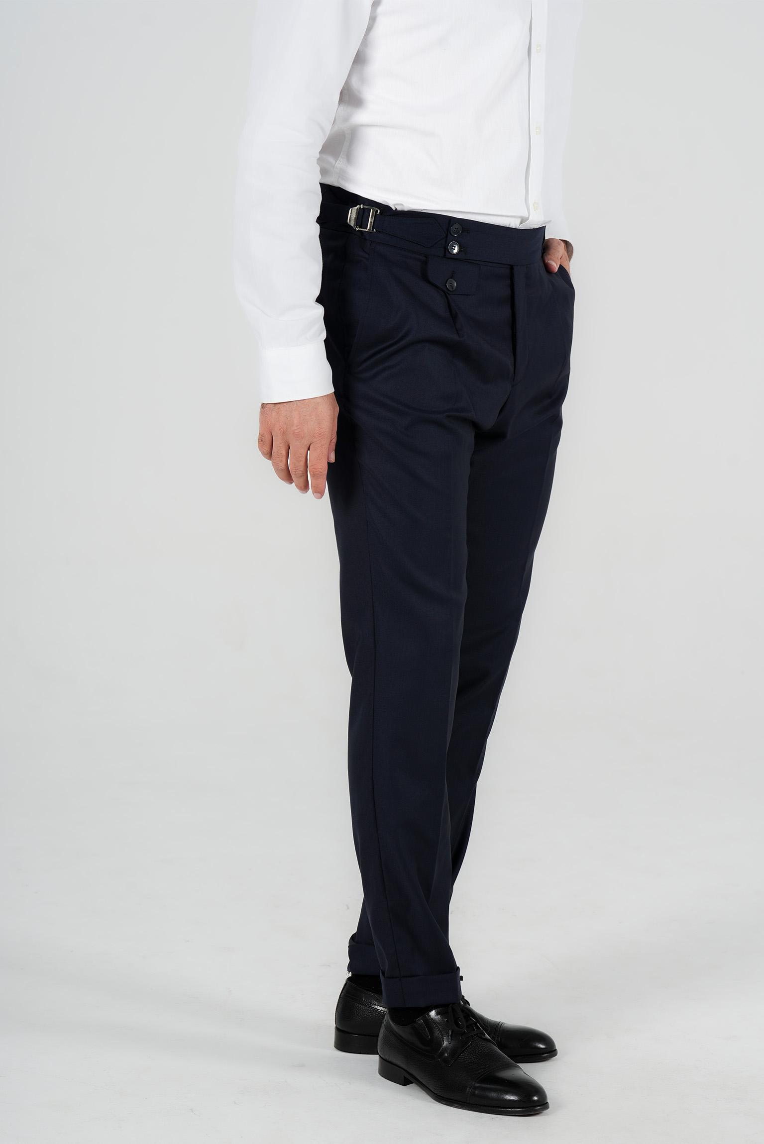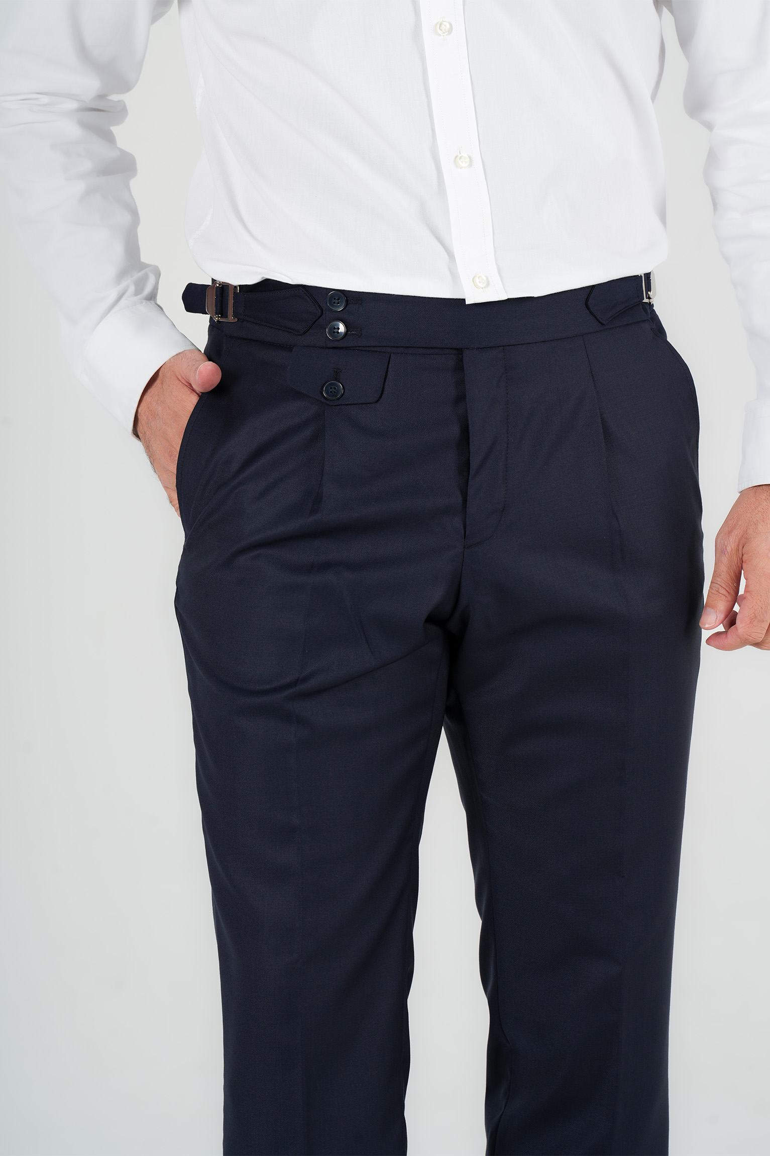Im klassischen italienischen Stil gestaltet, verfuegt sie ueber eine Bundfalte und verstellbare Seitenspangen, die eine praezise und elegante Passform ohne Guertel ermoeglichen. Der edle Dunkelblauton macht sie zu einem vielseitigen Bestandteil jeder Garderobe – ideal fuer formelle Anlaesse und gepflegte Alltagslooks.