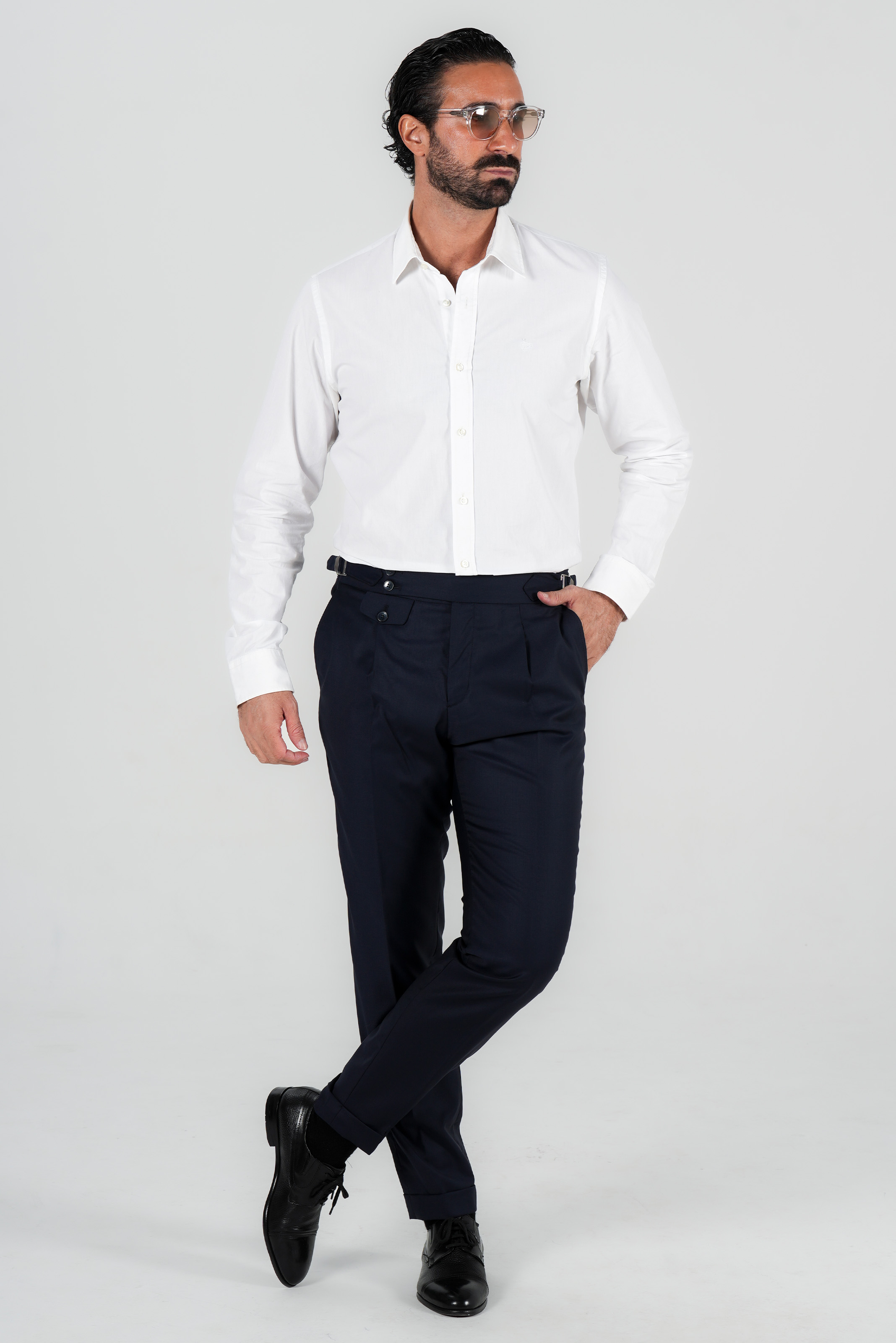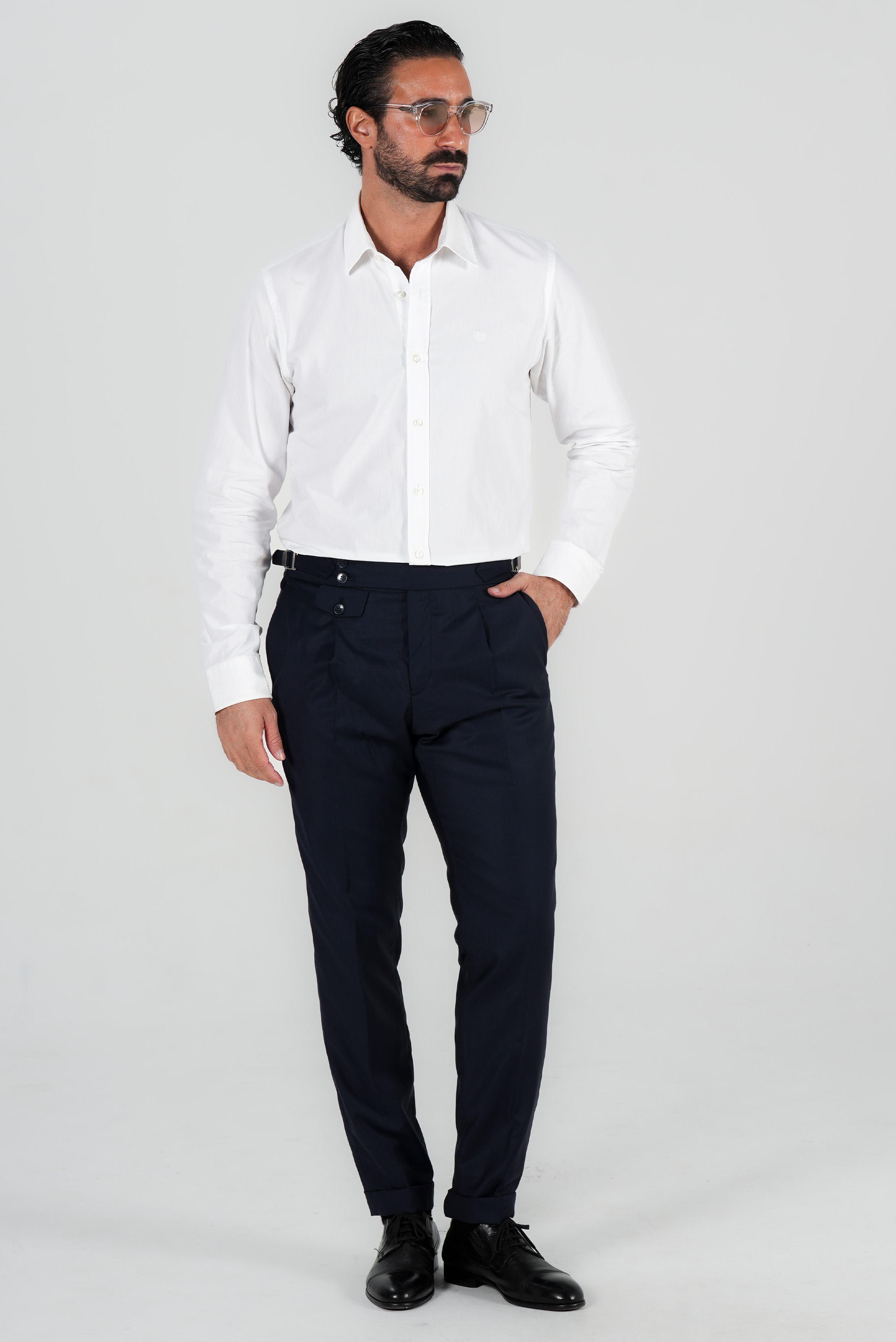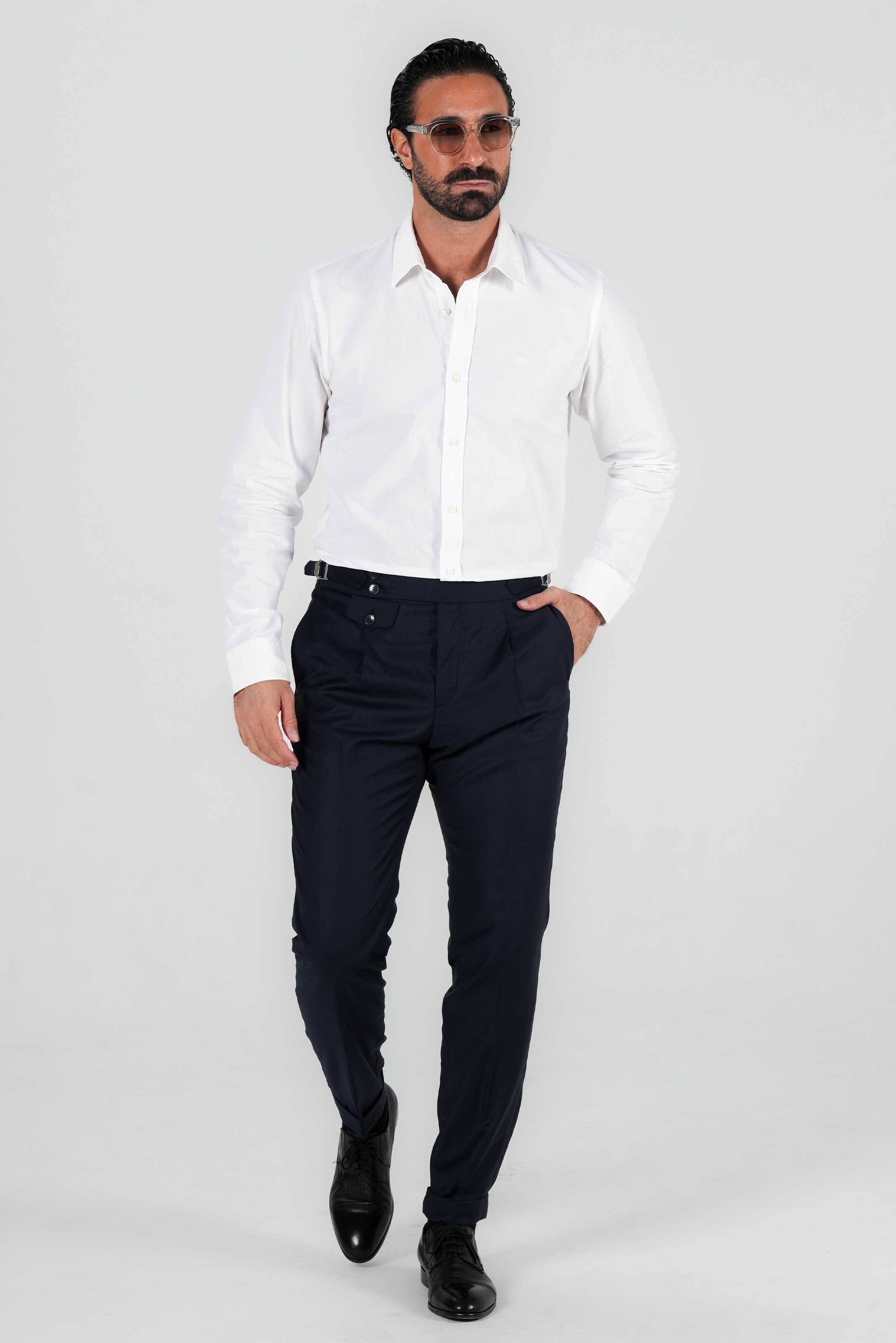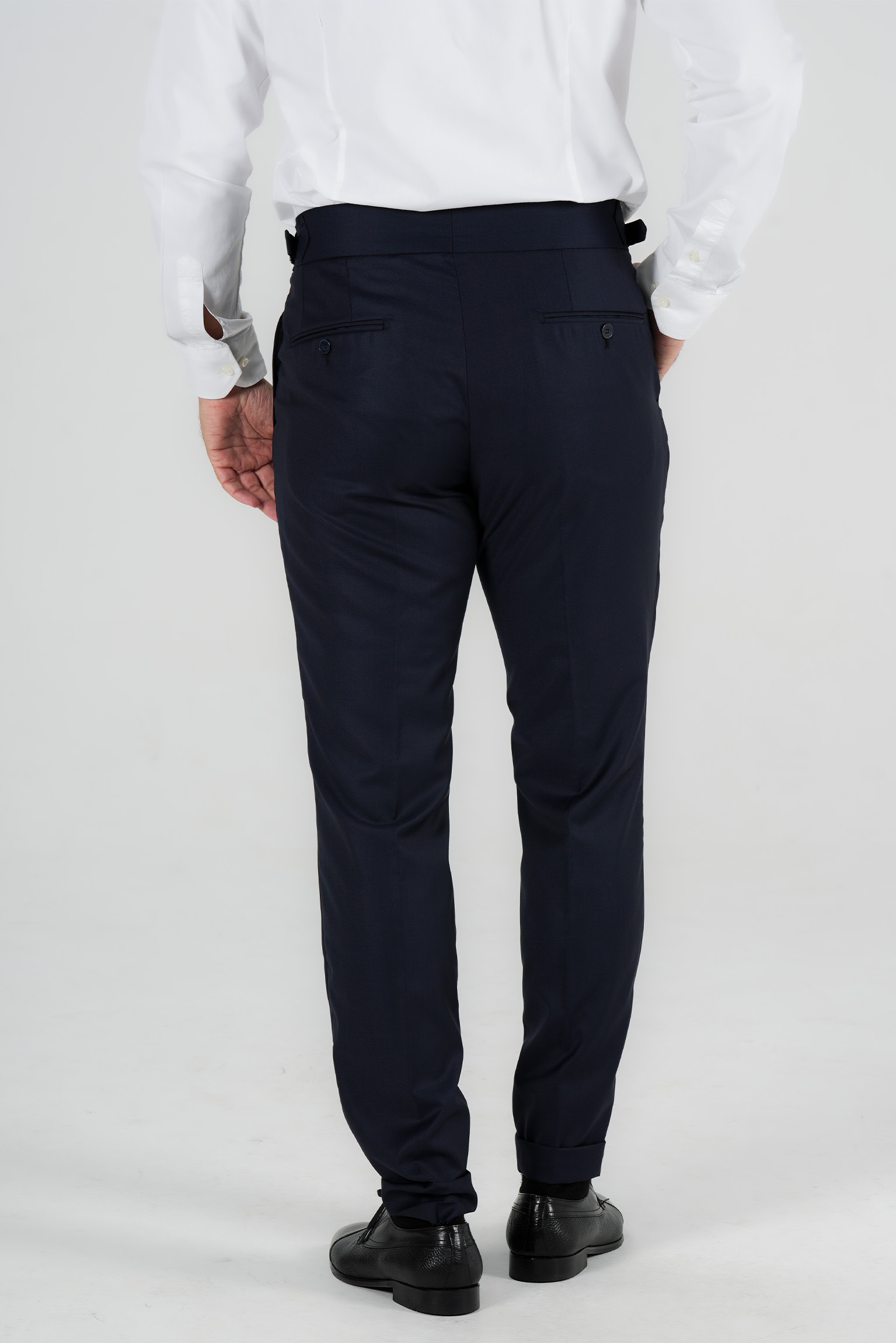 Im klassischen italienischen Stil gestaltet, verfuegt sie ueber eine Bundfalte und verstellbare Seitenspangen, die eine praezise und elegante Passform ohne Guertel ermoeglichen. Der edle Dunkelblauton macht sie zu einem vielseitigen Bestandteil jeder Garderobe – ideal fuer formelle Anlaesse und gepflegte Alltagslooks.