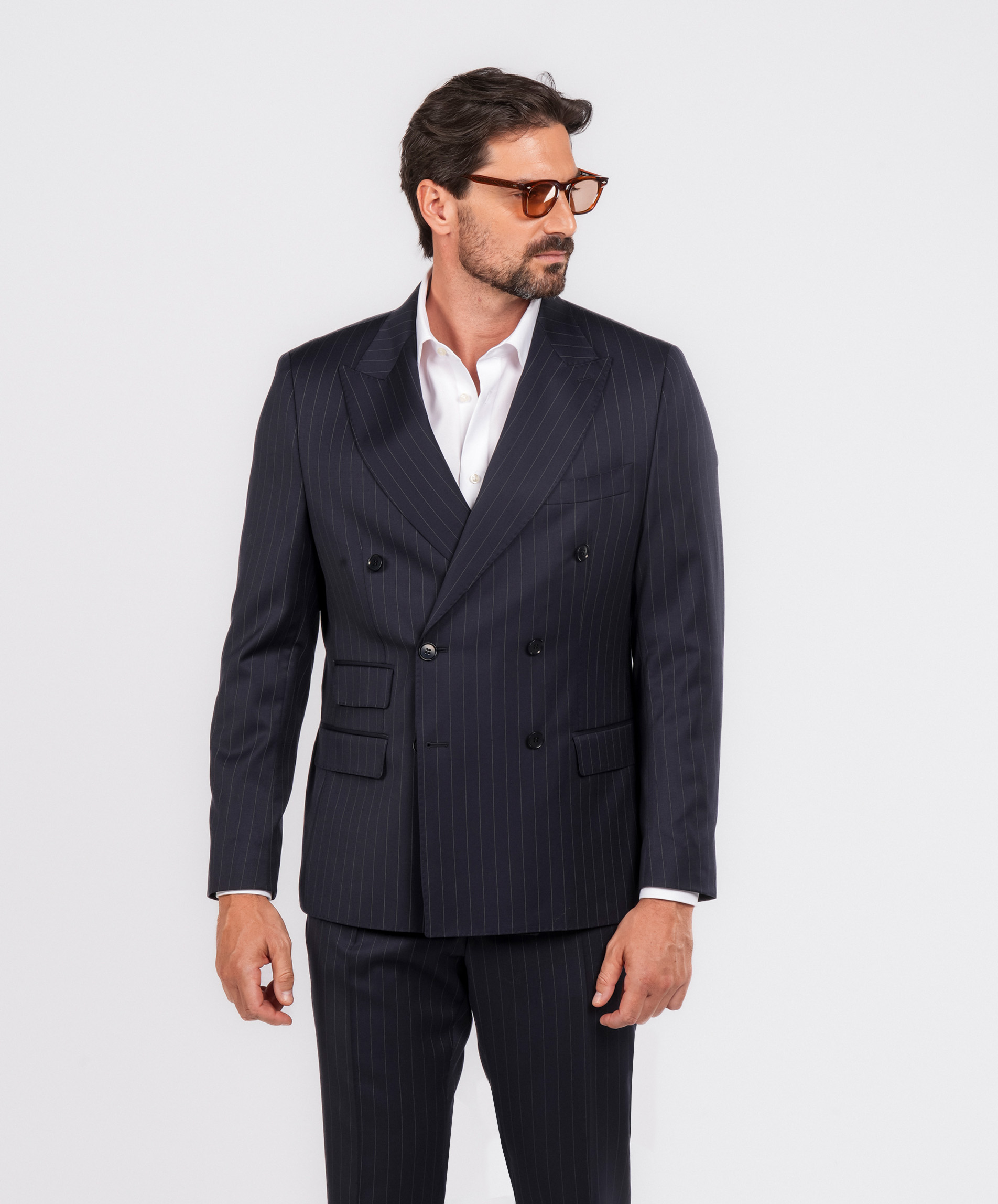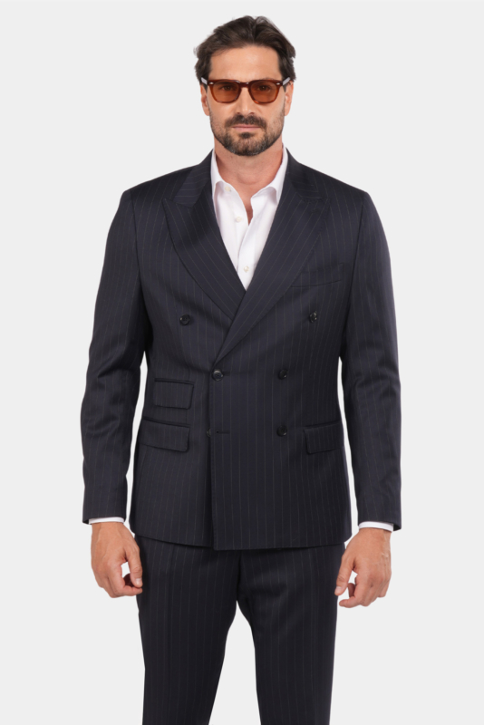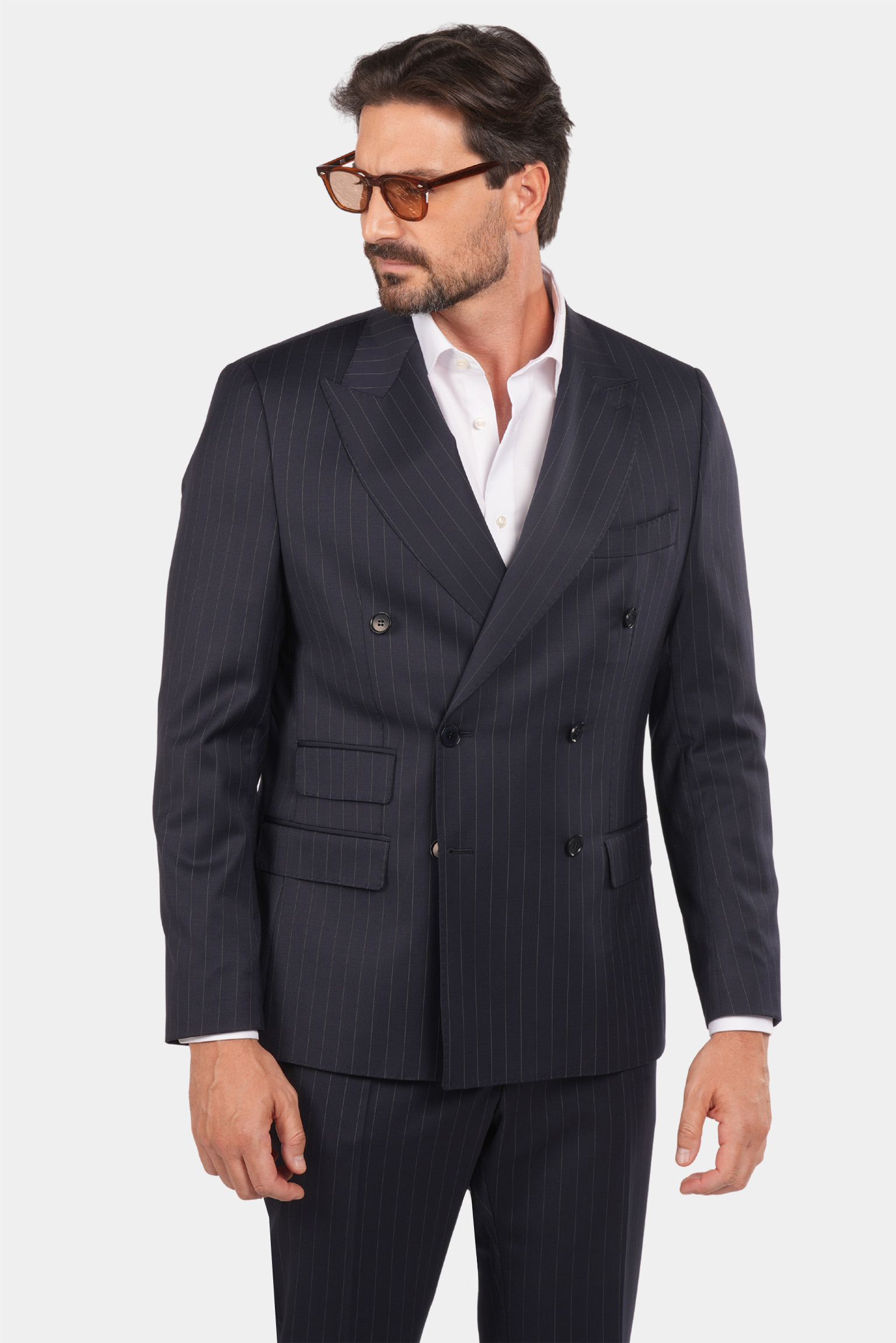 Dieser dunkelblaue Slim-Fit-Zweireiher mit feinem Nadelstreifen vereint moderne italienische Raffinesse mit zeitloser Schneiderkunst. Gefertigt aus 100 % Super 120s-Wolle von Vitale Barberis Canonico, bietet er eine glatte Textur, natürlichen Fall und höchsten Tragekomfort. Das steigende Spitzrevers betont die scharfe, strukturierte Silhouette, während die Halb-Canvas-Konstruktion hervorragende Haltbarkeit und eine natürliche Passform gewährleistet. Vollständig mit Viskose gefüttert, ist dieser Anzug ideal für Business-, Abend- und festliche Anlässe – ein Ausdruck von Stil, Eleganz und Qualität.