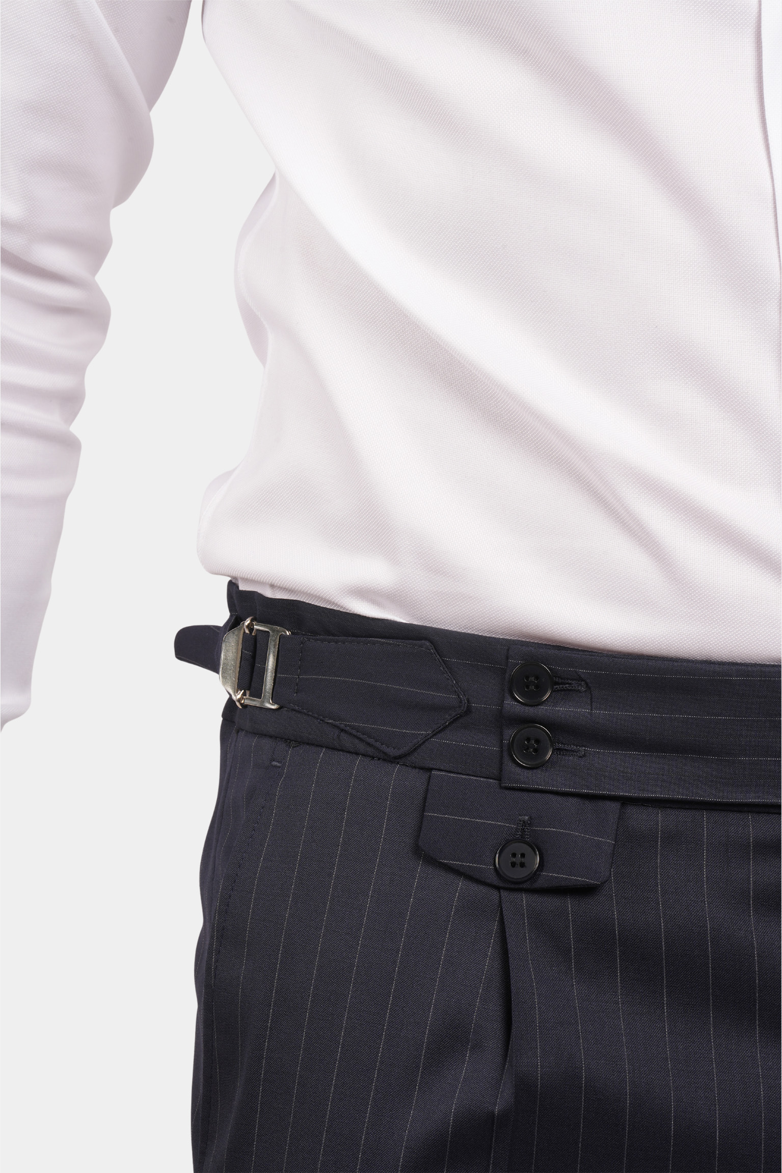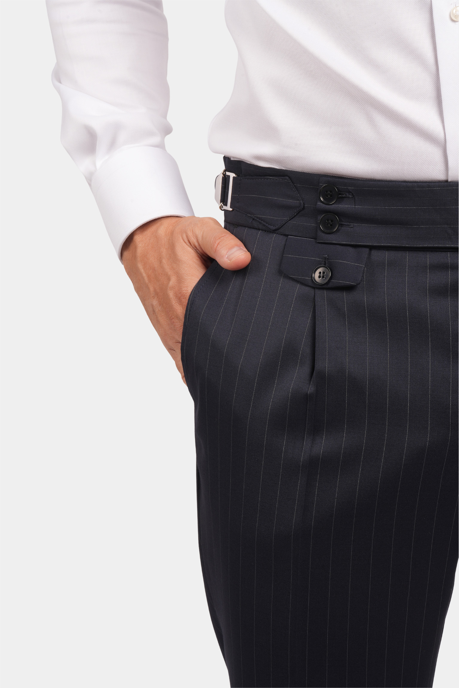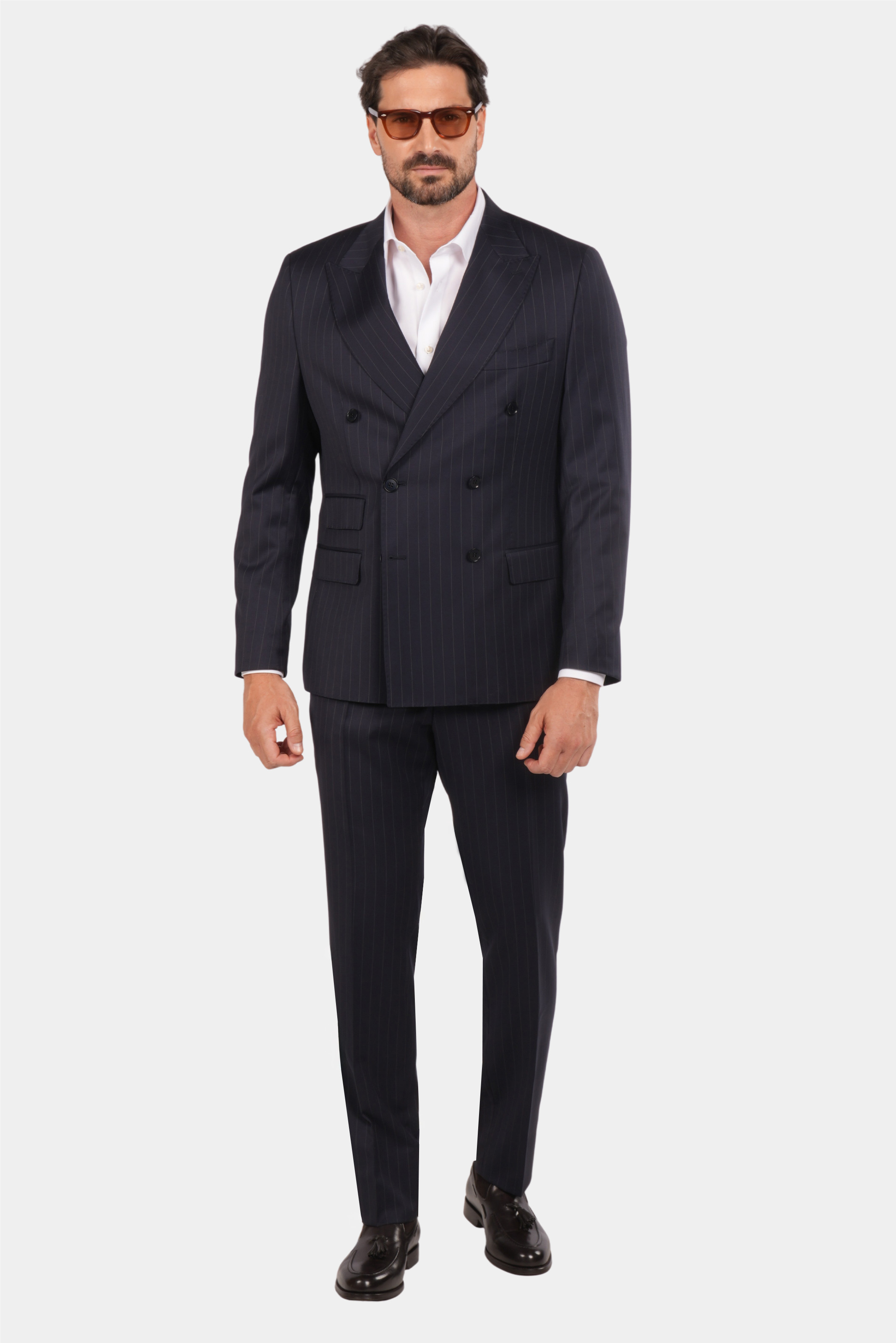 Dieser dunkelblaue Slim-Fit-Zweireiher mit feinem Nadelstreifen vereint moderne italienische Raffinesse mit zeitloser Schneiderkunst. Gefertigt aus 100 % Super 120s-Wolle von Vitale Barberis Canonico, bietet er eine glatte Textur, natürlichen Fall und höchsten Tragekomfort. Das steigende Spitzrevers betont die scharfe, strukturierte Silhouette, während die Halb-Canvas-Konstruktion hervorragende Haltbarkeit und eine natürliche Passform gewährleistet. Vollständig mit Viskose gefüttert, ist dieser Anzug ideal für Business-, Abend- und festliche Anlässe – ein Ausdruck von Stil, Eleganz und Qualität.