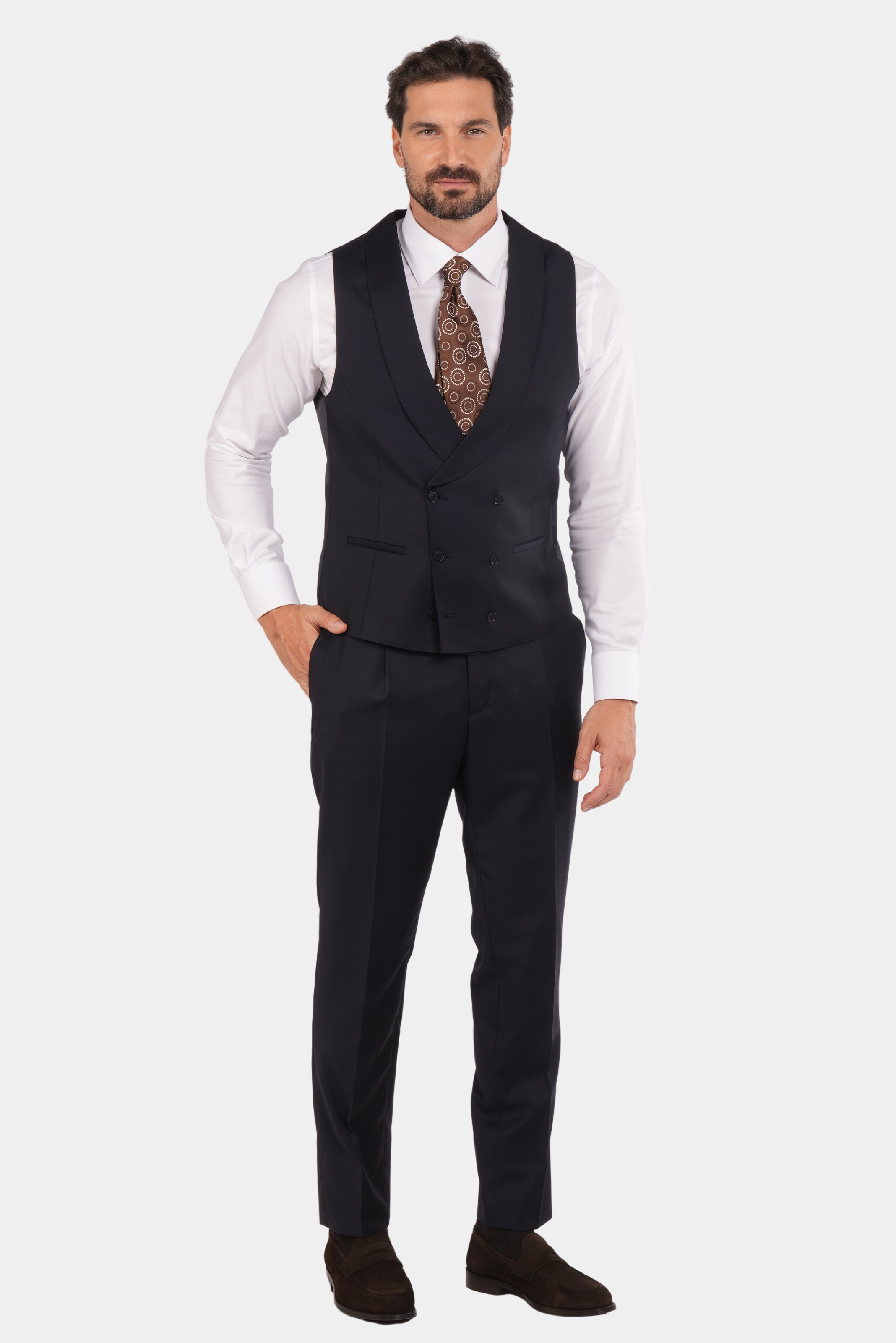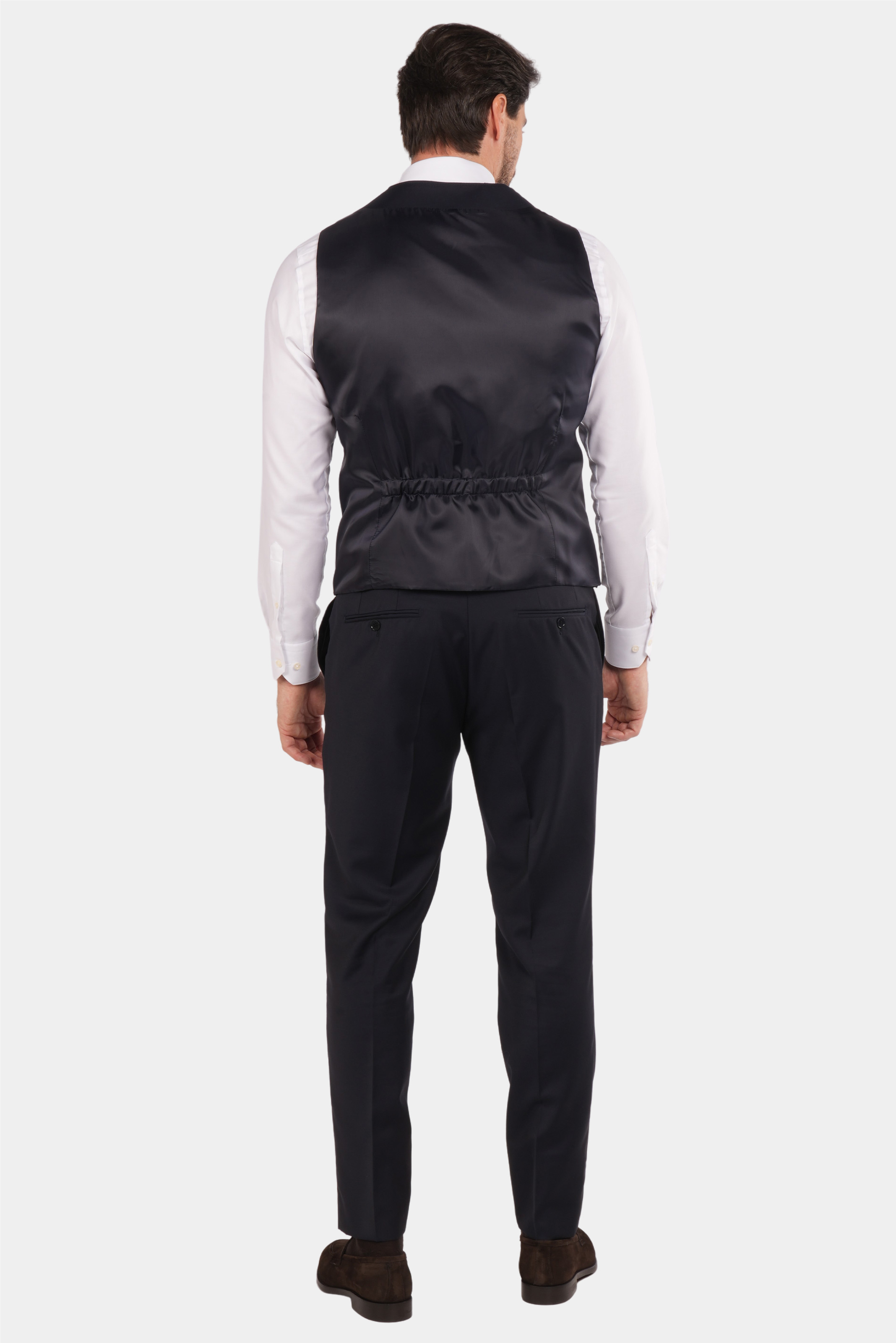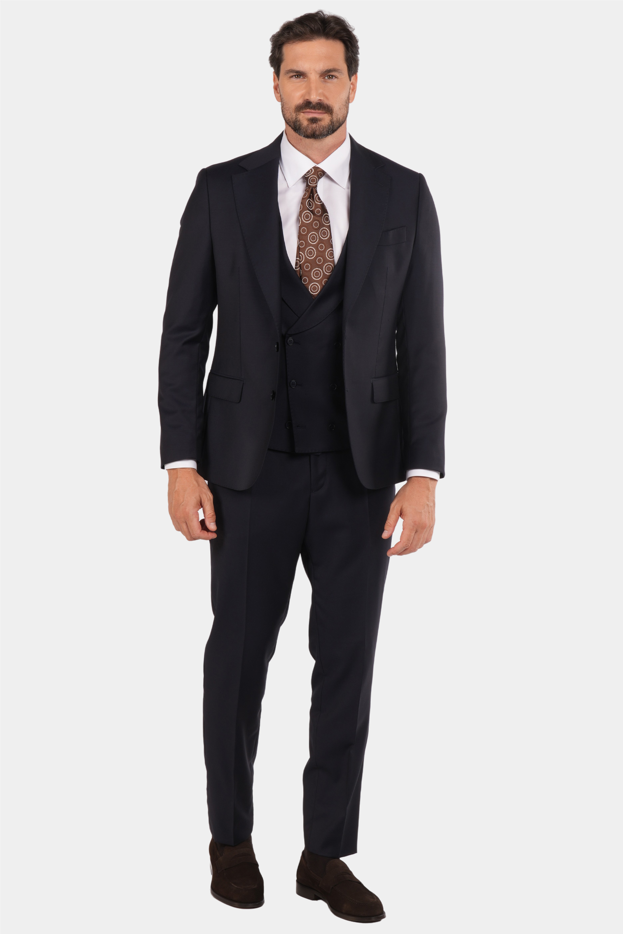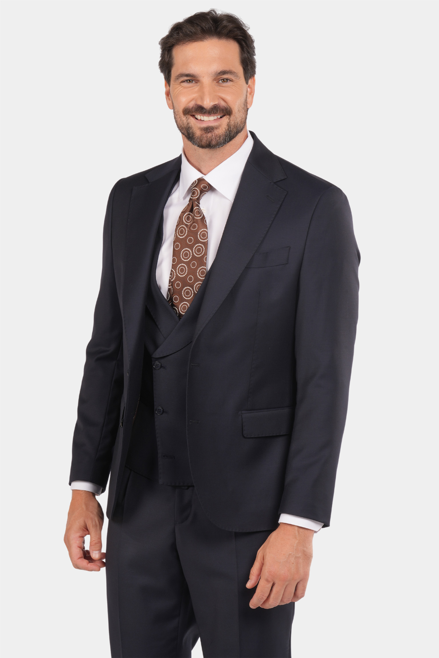 Dieser dunkelblaue Slim-Fit-Dreiteiler verkörpert dezente italienische Eleganz mit einem modernen Touch. Meisterhaft gefertigt aus 100 % Super 120s-Wolle von Vitale Barberis Canonico, überzeugt er durch eine glatte Textur und natürliche Elastizität. Das steigende Spitzrevers verleiht dem Design einen Hauch von Raffinesse, während die Halb-Canvas-Konstruktion für Formbeständigkeit, Struktur und angenehmen Tragekomfort sorgt. Vollständig mit Viskose gefüttert, lässt sich dieser Anzug mühelos von Business-Meetings bis zu formellen Anlässen tragen – zeitlos, elegant und authentisch italienisch.