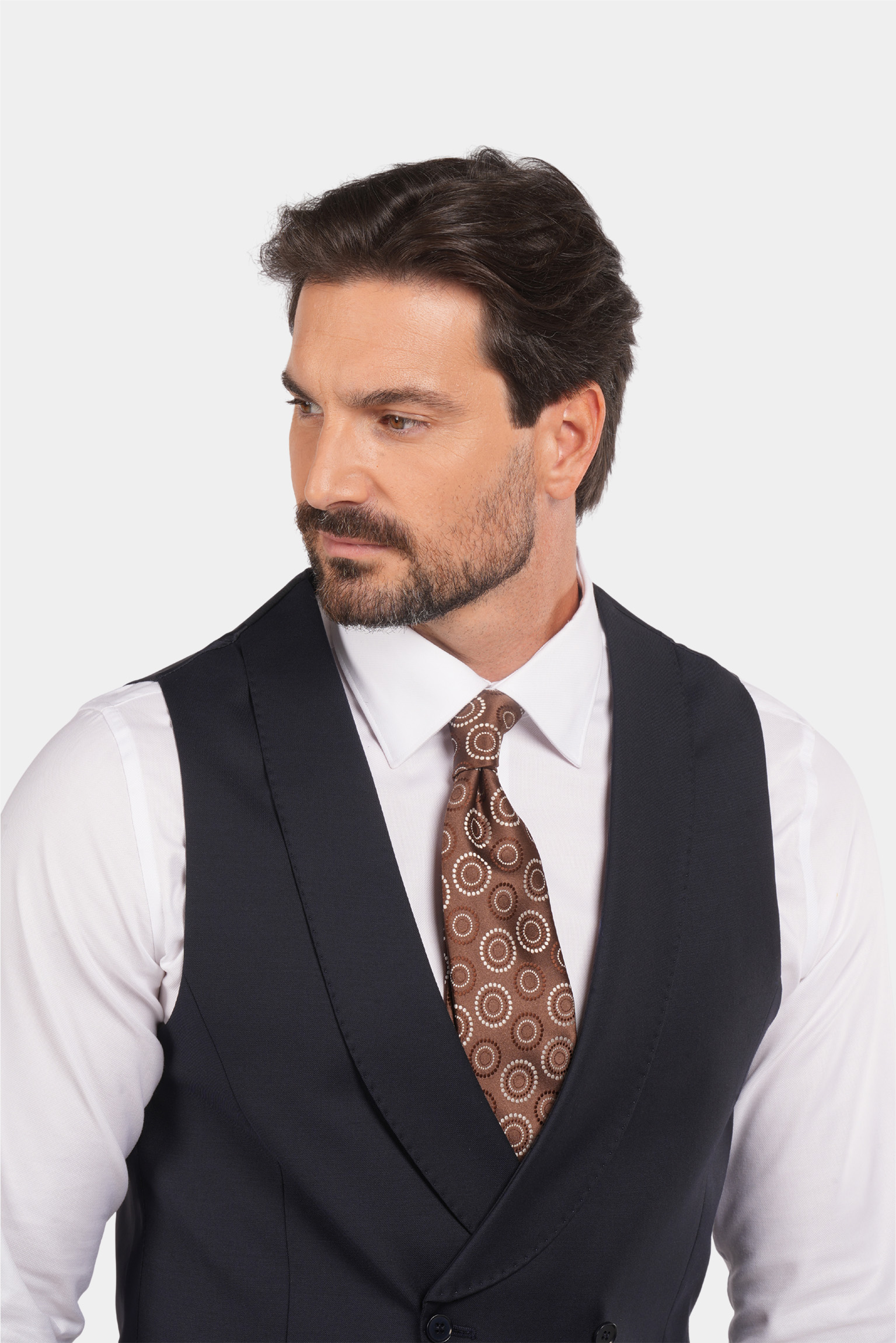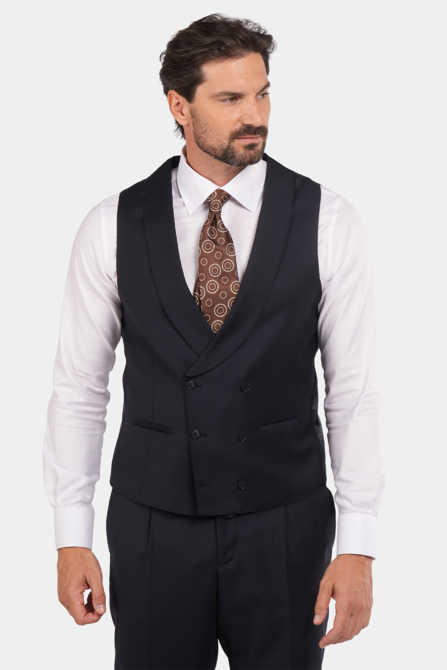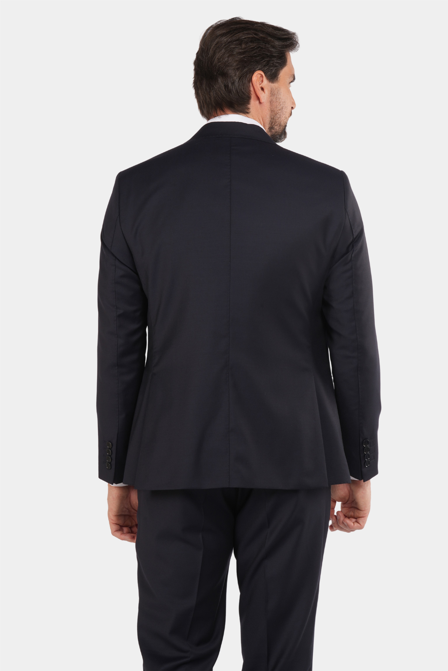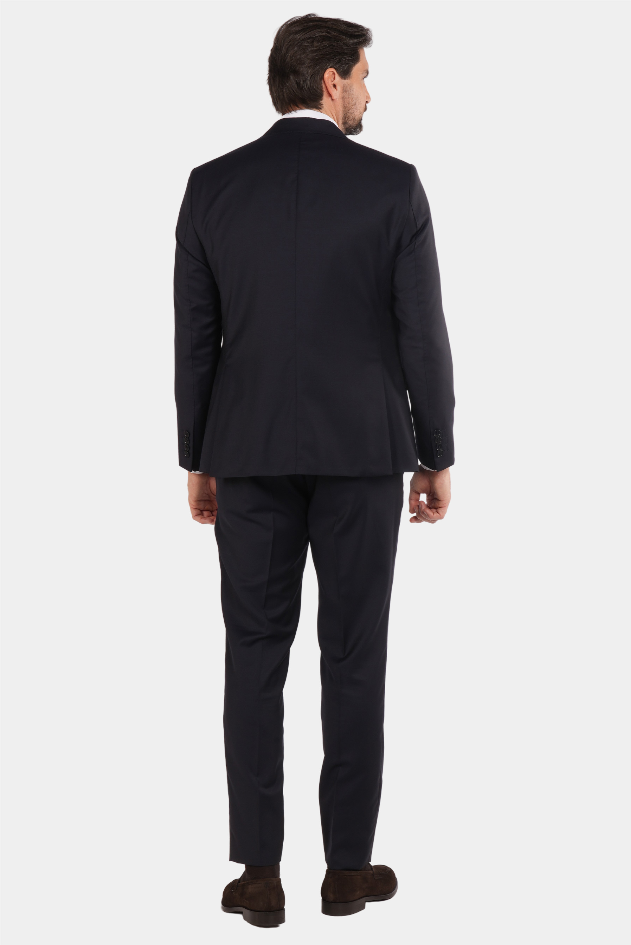 Dieser dunkelblaue Slim-Fit-Dreiteiler verkörpert dezente italienische Eleganz mit einem modernen Touch. Meisterhaft gefertigt aus 100 % Super 120s-Wolle von Vitale Barberis Canonico, überzeugt er durch eine glatte Textur und natürliche Elastizität. Das steigende Spitzrevers verleiht dem Design einen Hauch von Raffinesse, während die Halb-Canvas-Konstruktion für Formbeständigkeit, Struktur und angenehmen Tragekomfort sorgt. Vollständig mit Viskose gefüttert, lässt sich dieser Anzug mühelos von Business-Meetings bis zu formellen Anlässen tragen – zeitlos, elegant und authentisch italienisch.