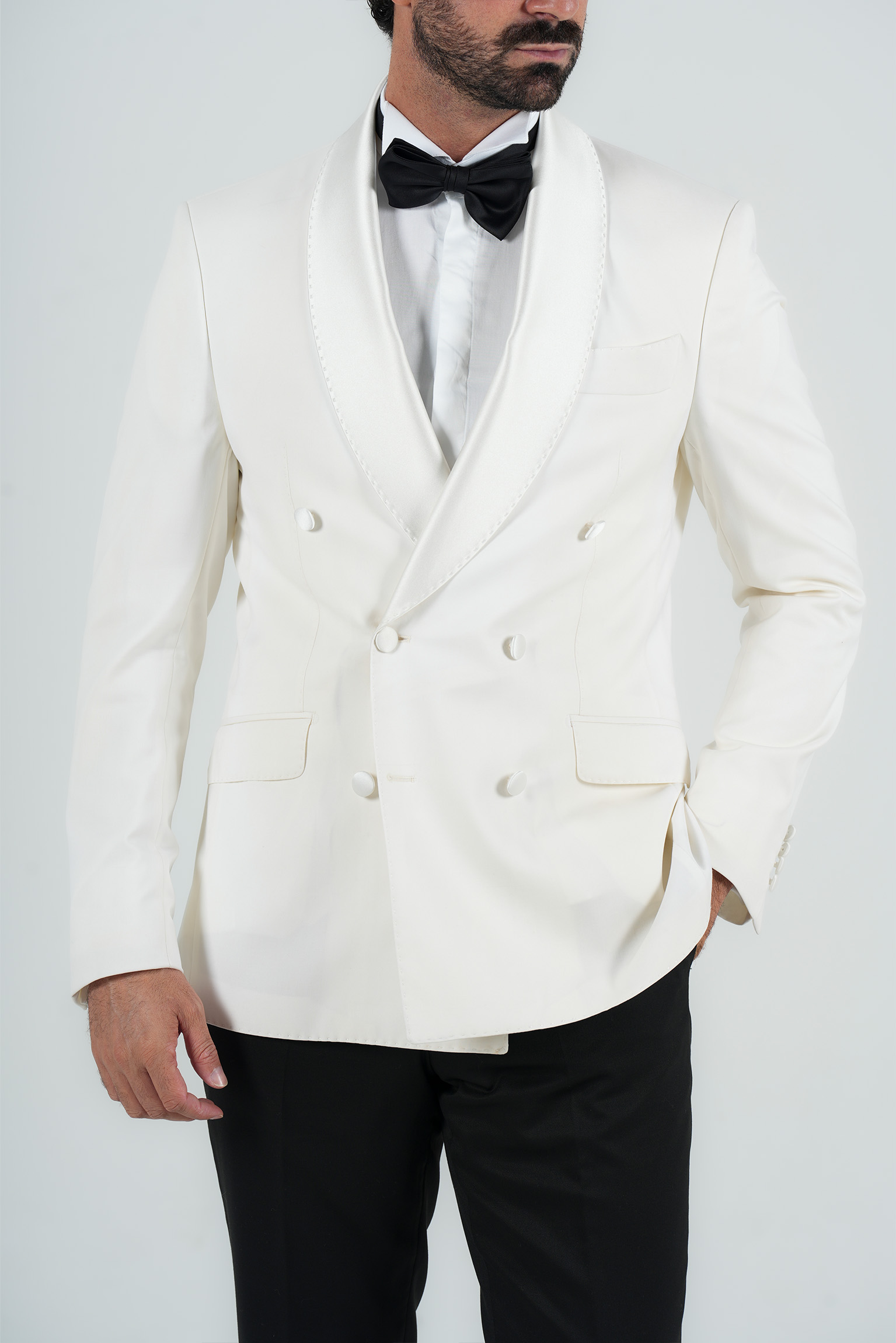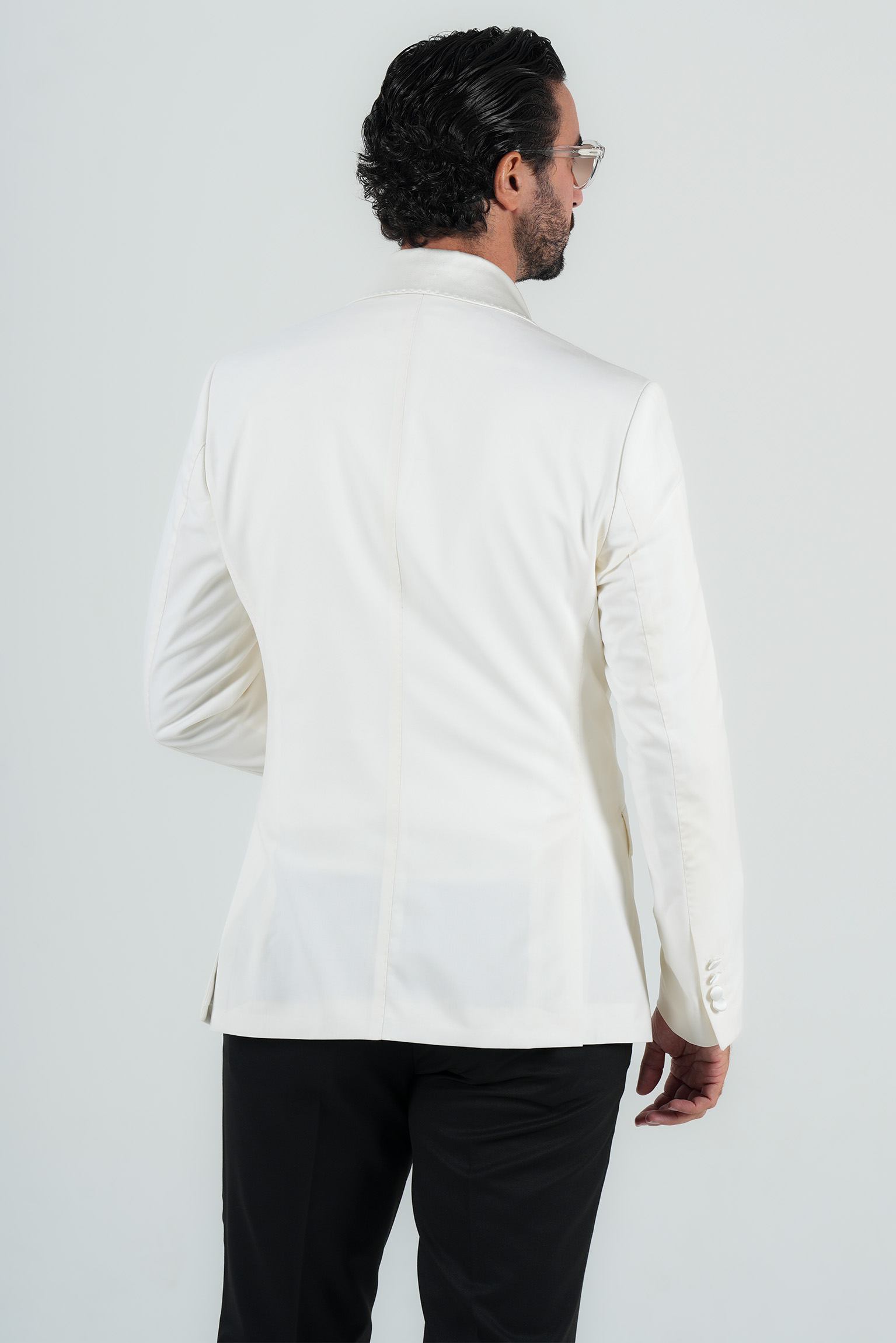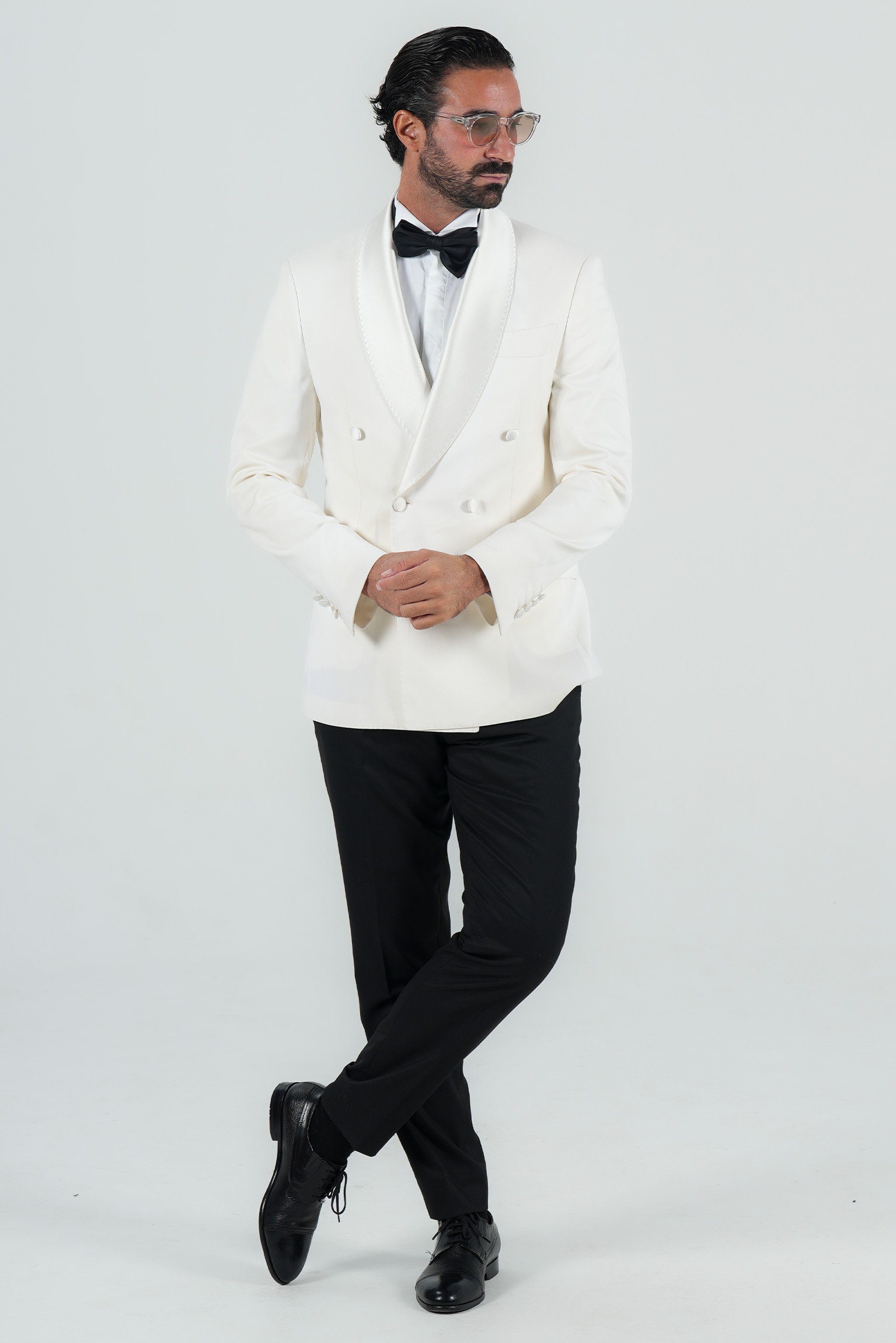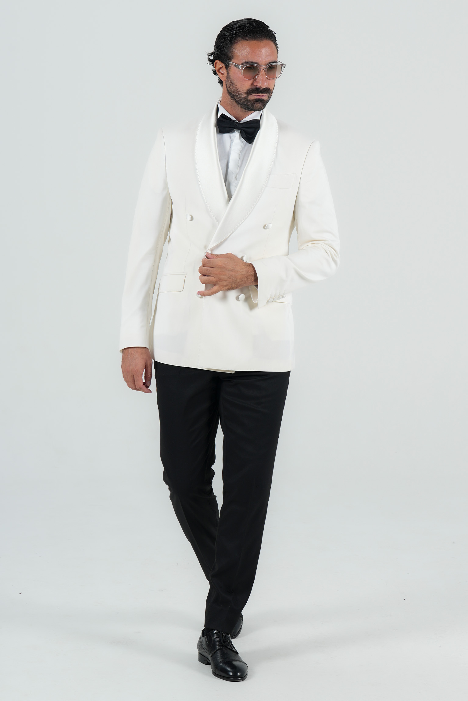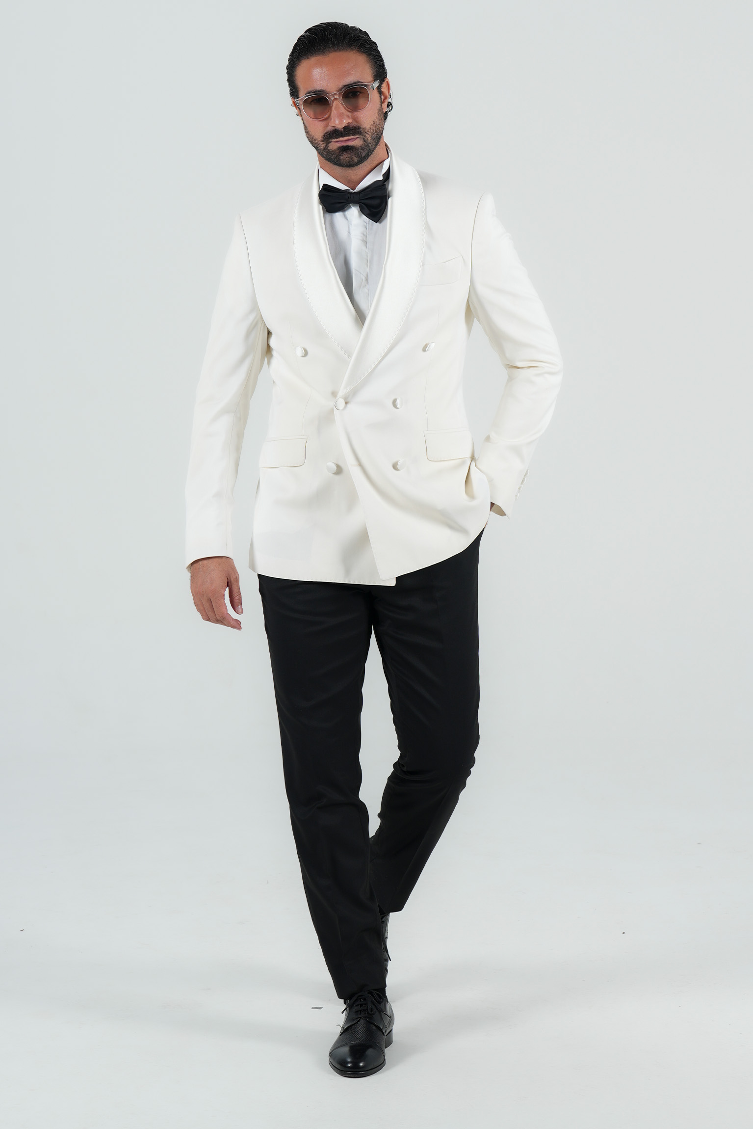 Dieser elegante cremefarbene Zweiteilige Smokinganzug zeichnet sich durch ein stilvolles Design aus hochwertigem Stoff mit einem Satin-Schalkragen aus. Perfekt für formelle Anlässe, Abendpartys oder besondere Gelegenheiten, unterstreicht dieser Anzug Ihren Charme und Ihre Eleganz.