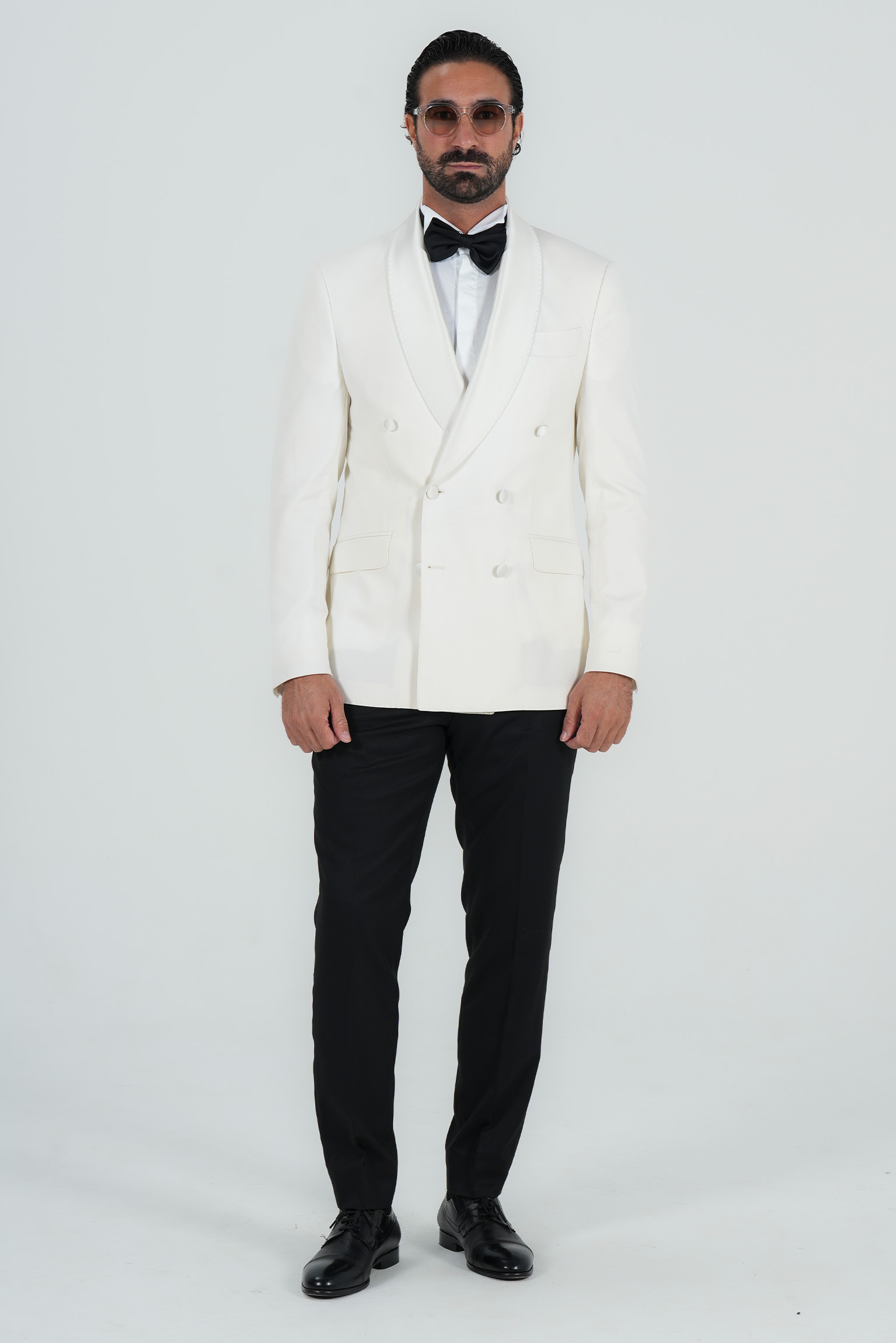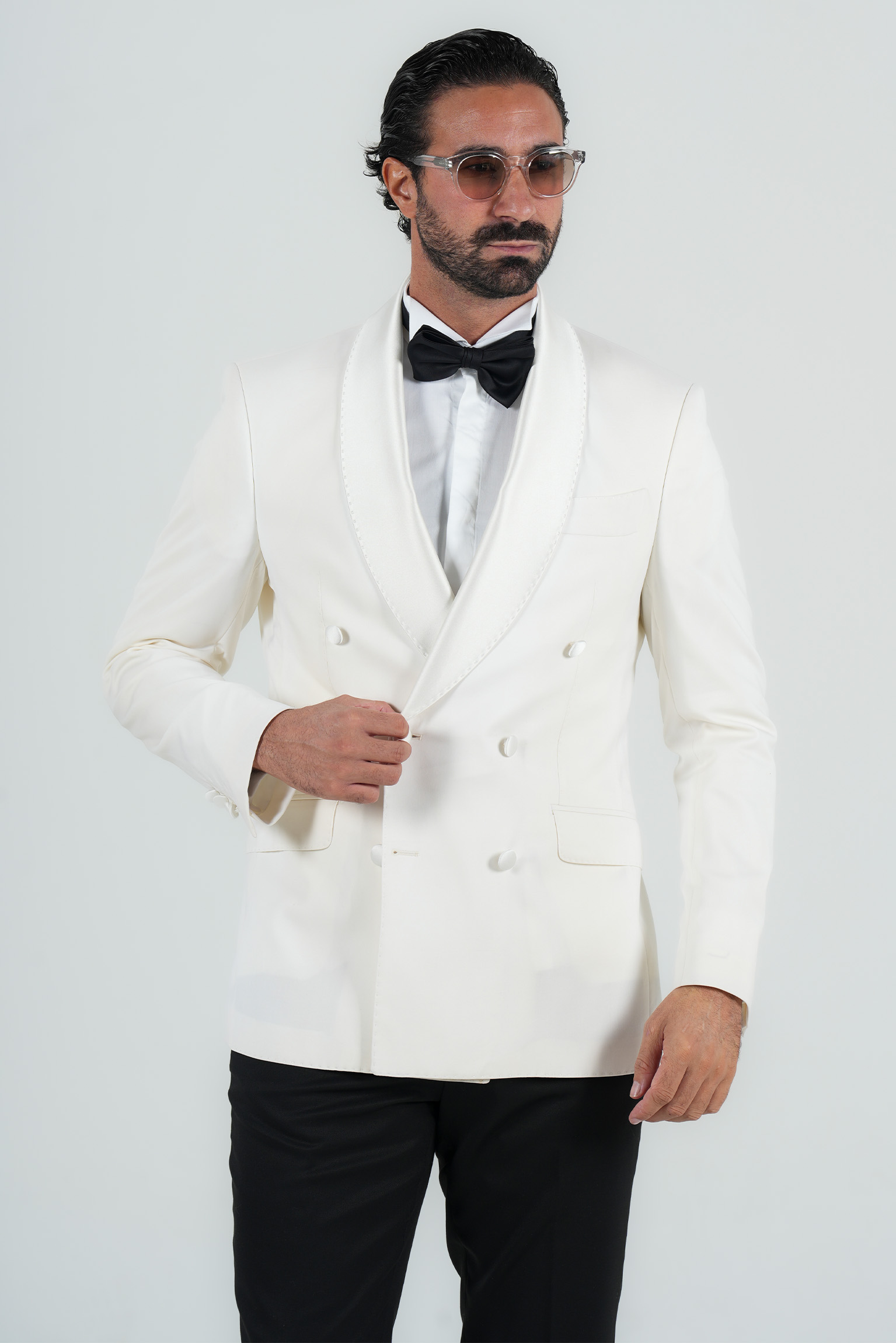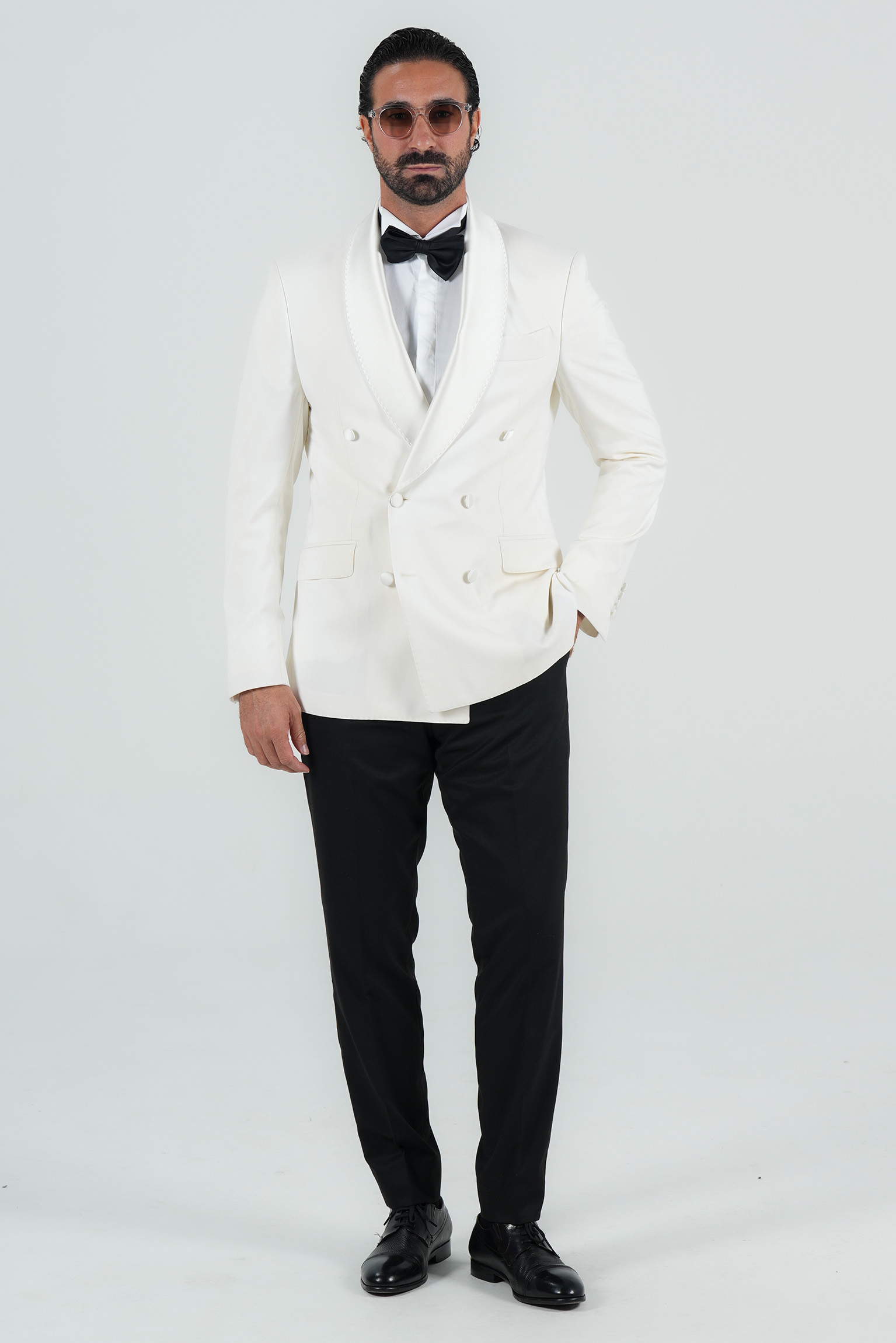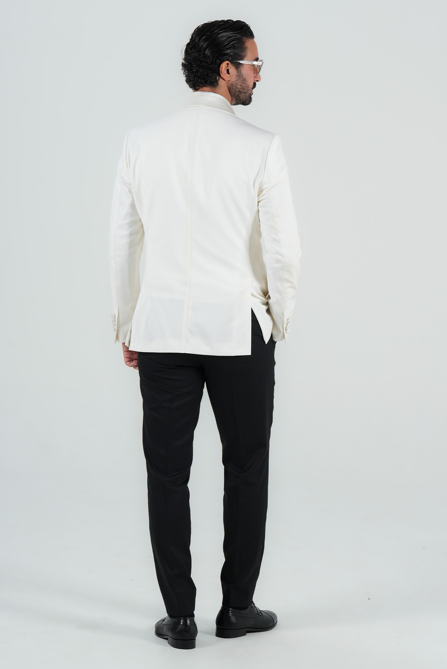 Dieser elegante cremefarbene Zweiteilige Smokinganzug zeichnet sich durch ein stilvolles Design aus hochwertigem Stoff mit einem Satin-Schalkragen aus. Perfekt für formelle Anlässe, Abendpartys oder besondere Gelegenheiten, unterstreicht dieser Anzug Ihren Charme und Ihre Eleganz.