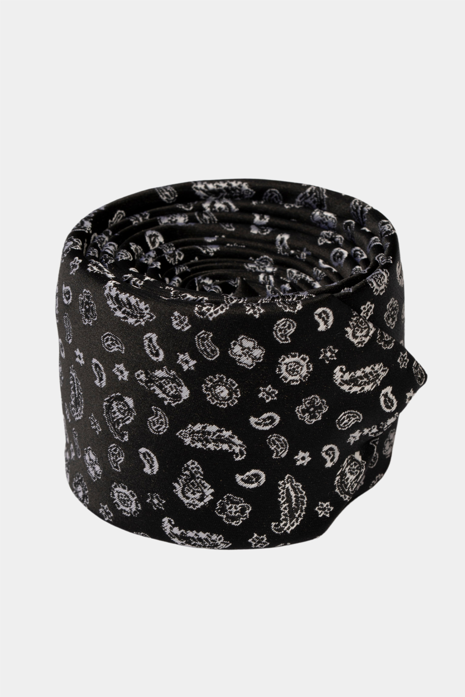 This black tie with an intricate paisley pattern brings a timeless sense of elegance and sophistication. Made in Turkey from 100% premium microfiber, it features a deep black base highlighted with refined silver paisley details. The smooth texture and slight sheen make it a versatile piece, ideal for both formal and evening occasions.