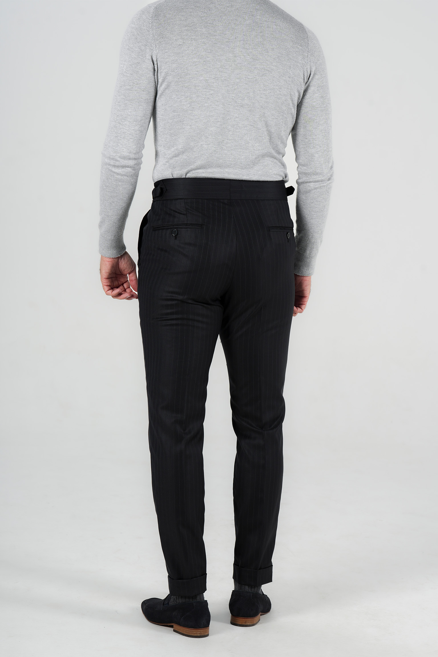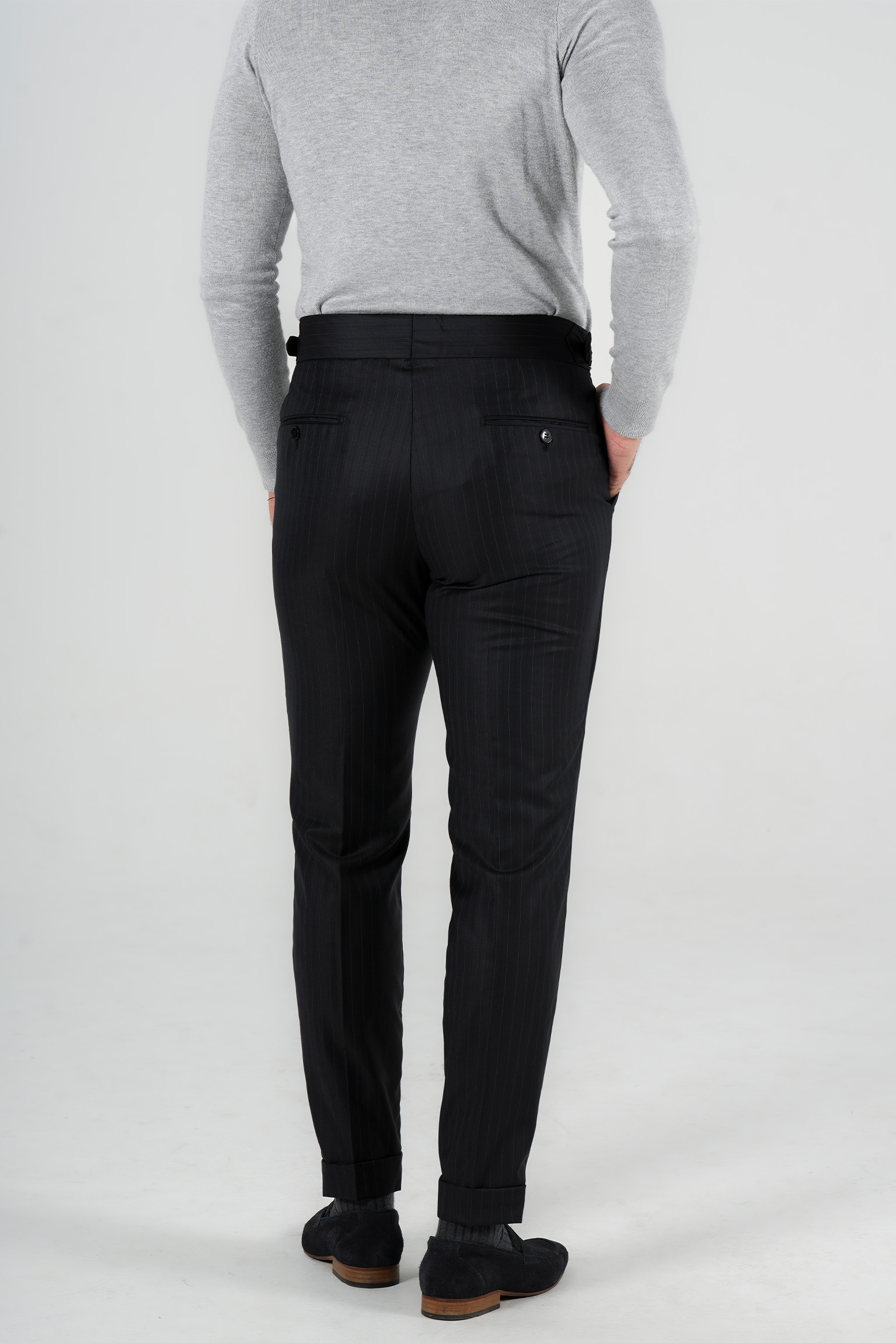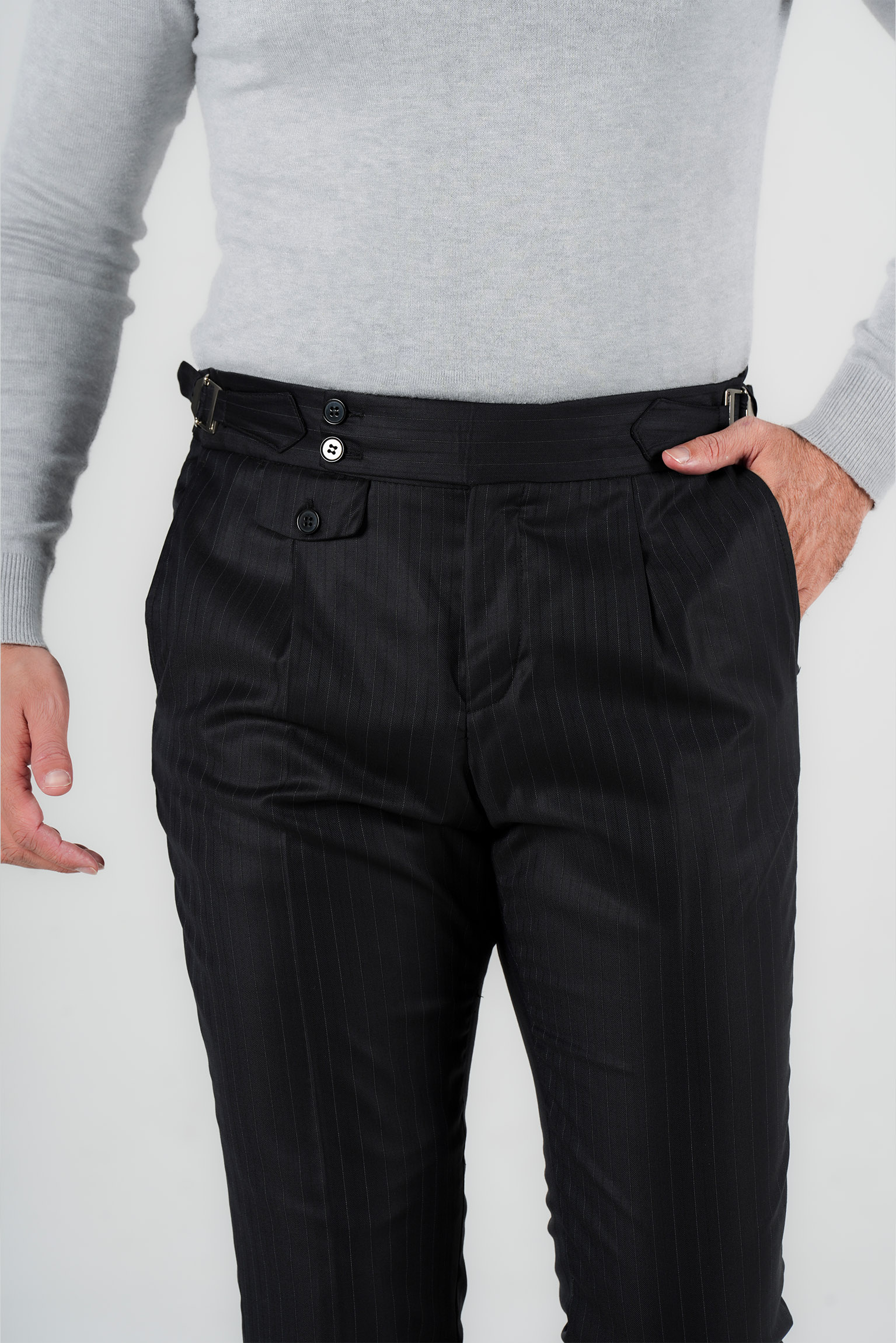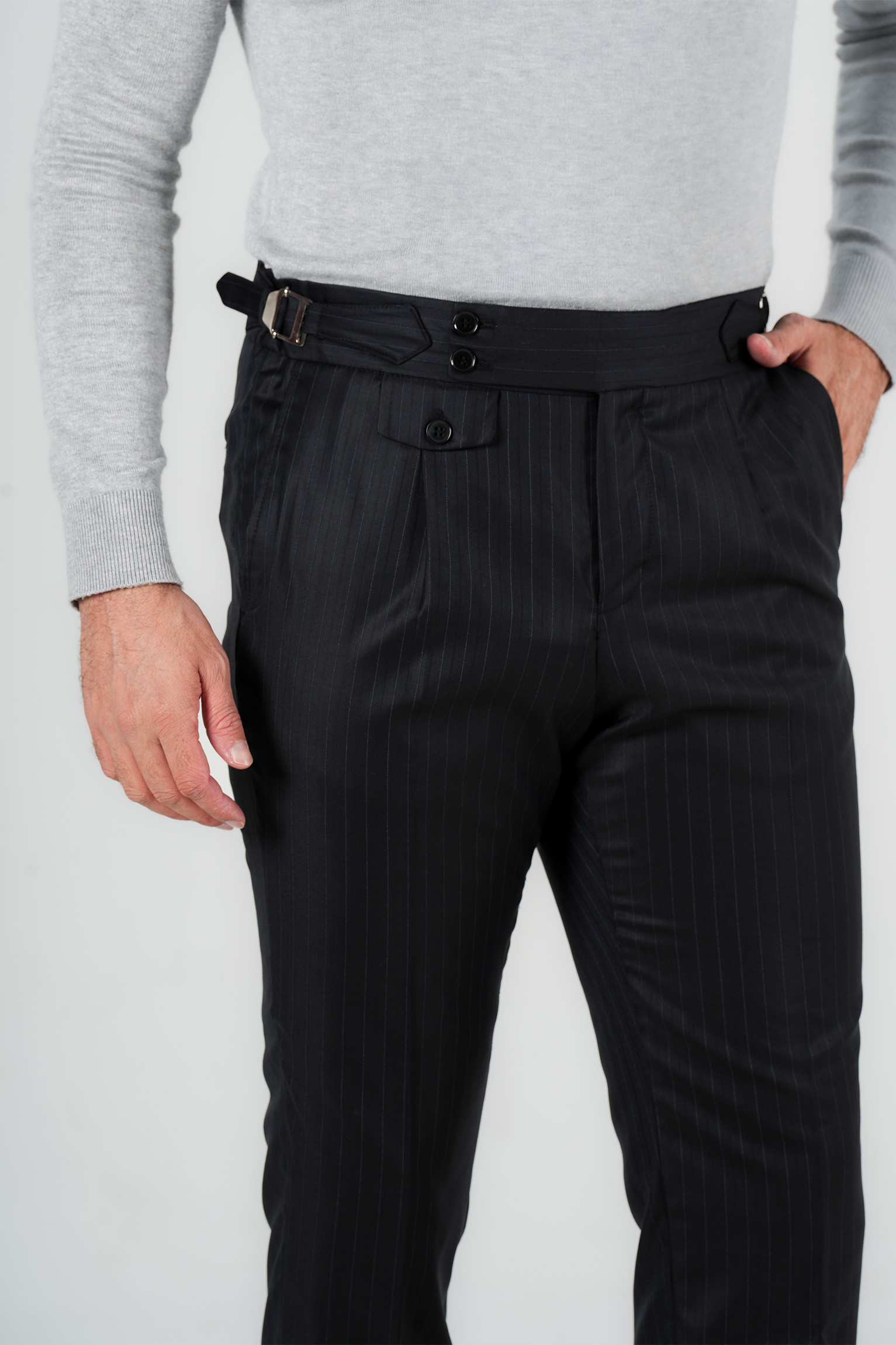 These black pinstripe trousers are meticulously crafted from 100% Super 150s wool, offering a luxurious hand-feel with exceptional breathability and natural drape. Designed in the classic Italian style, they feature a pleated front and adjustable side straps, providing a refined tailored fit without the need for a belt.