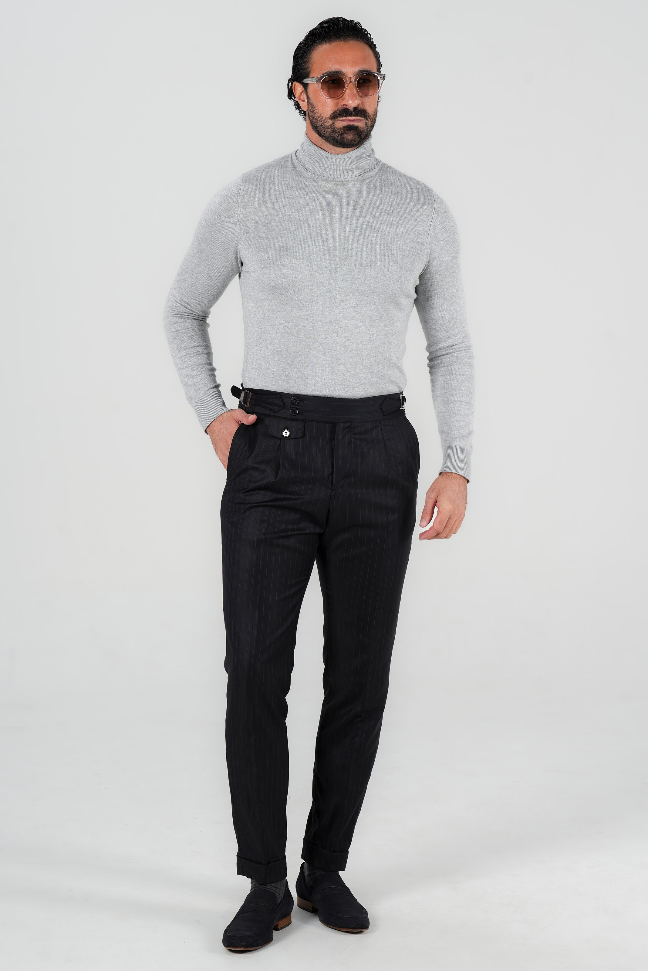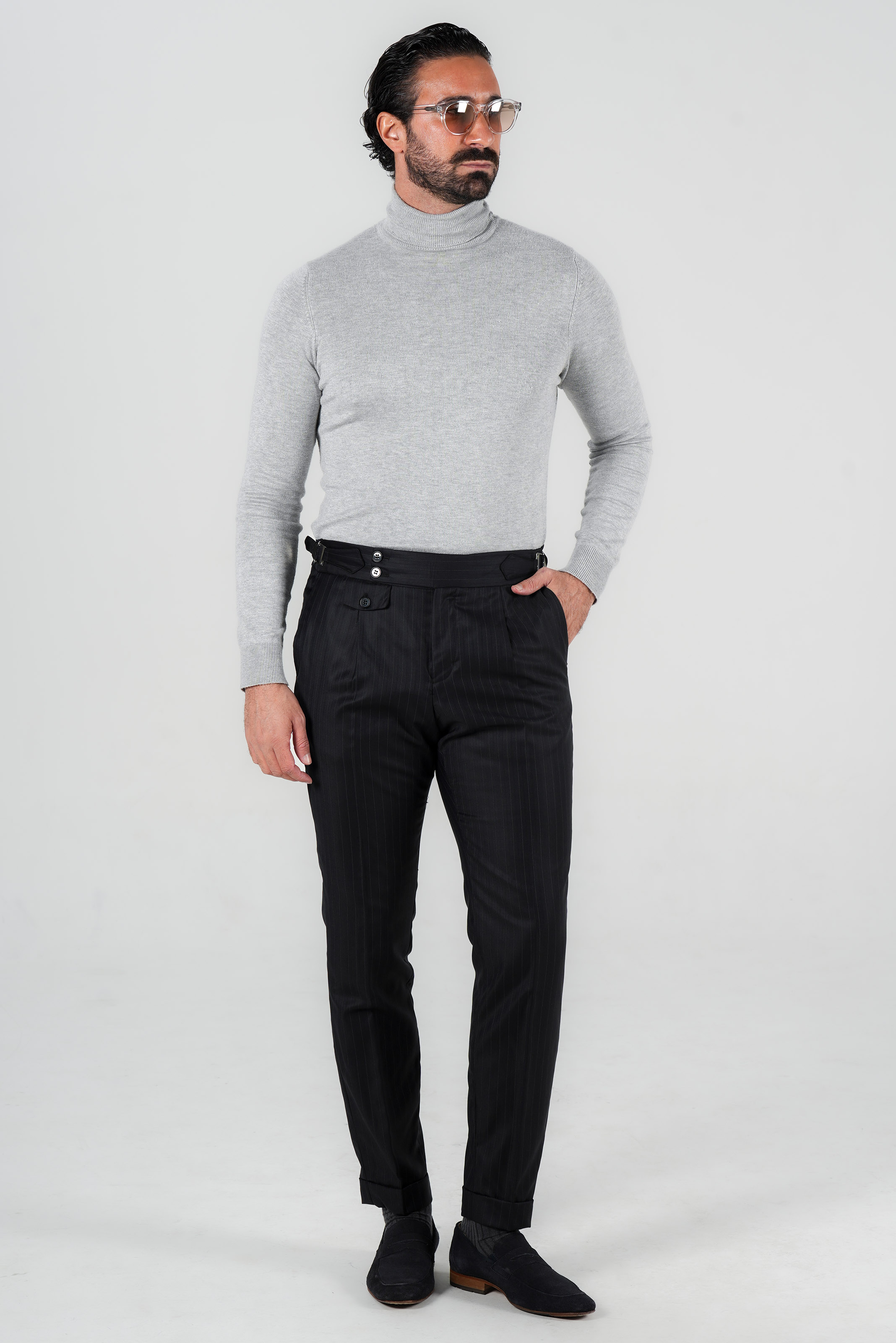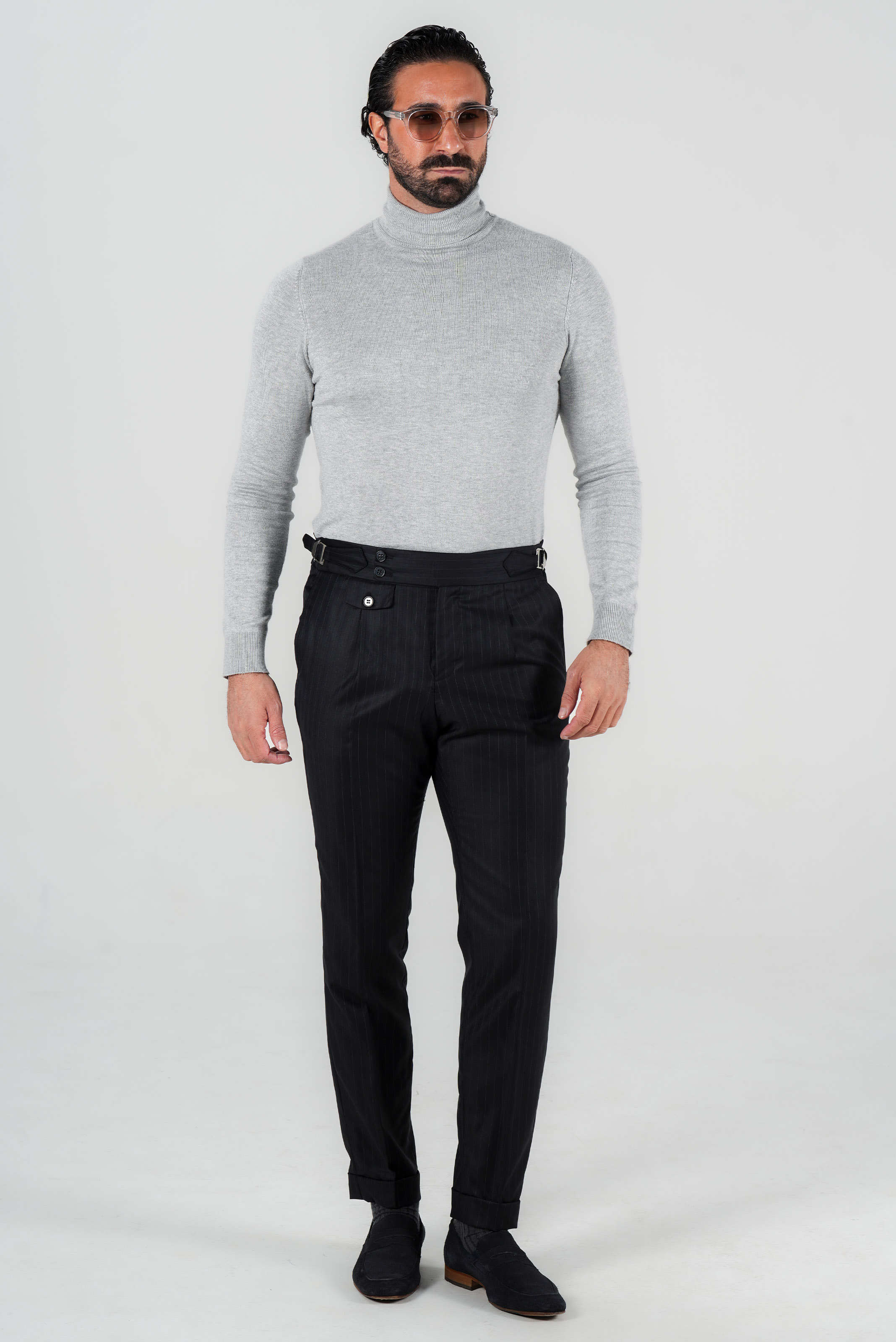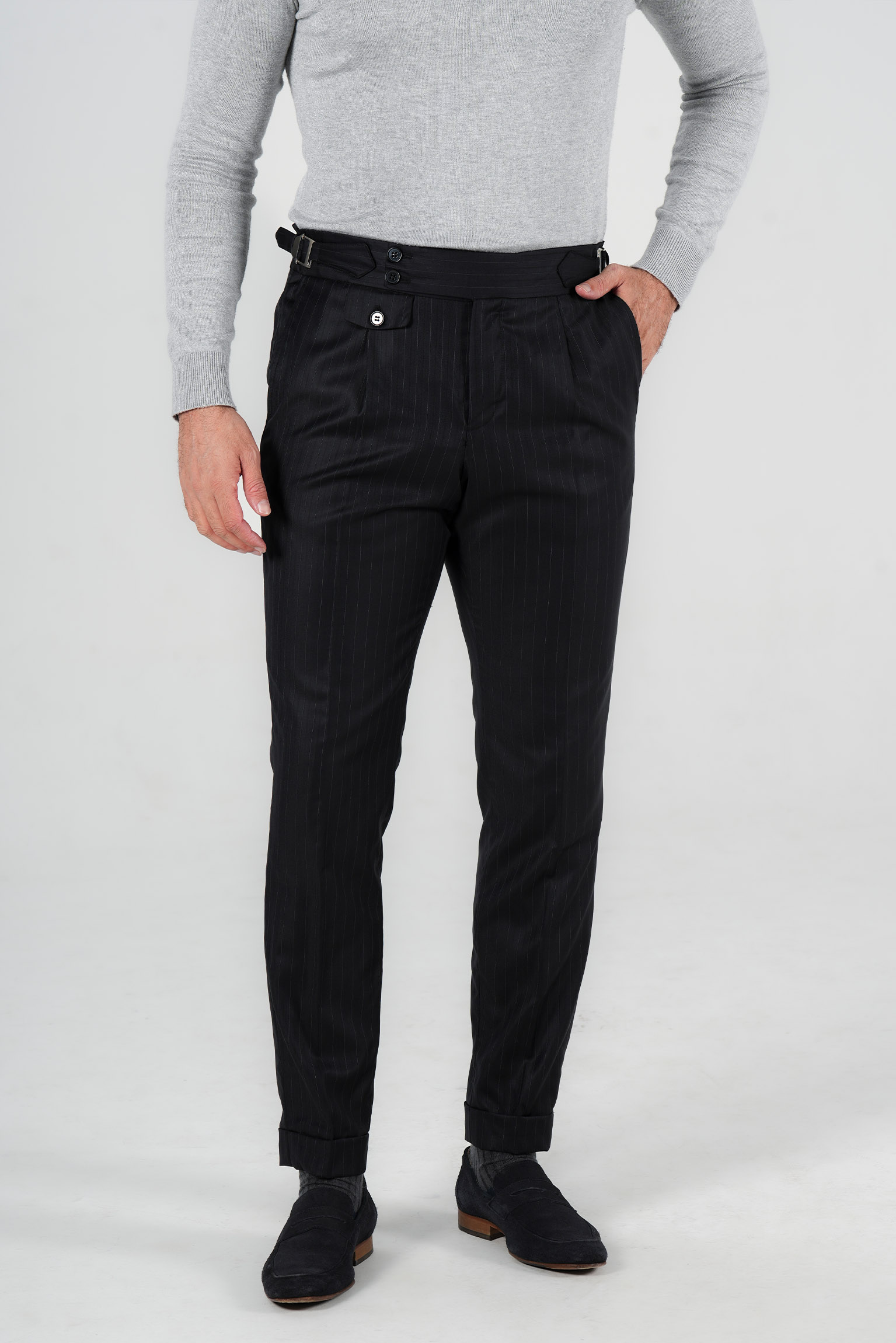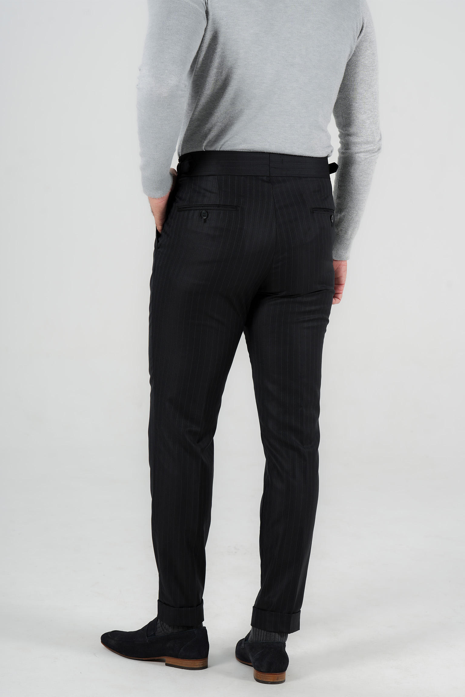 These black pinstripe trousers are meticulously crafted from 100% Super 150s wool, offering a luxurious hand-feel with exceptional breathability and natural drape. Designed in the classic Italian style, they feature a pleated front and adjustable side straps, providing a refined tailored fit without the need for a belt.