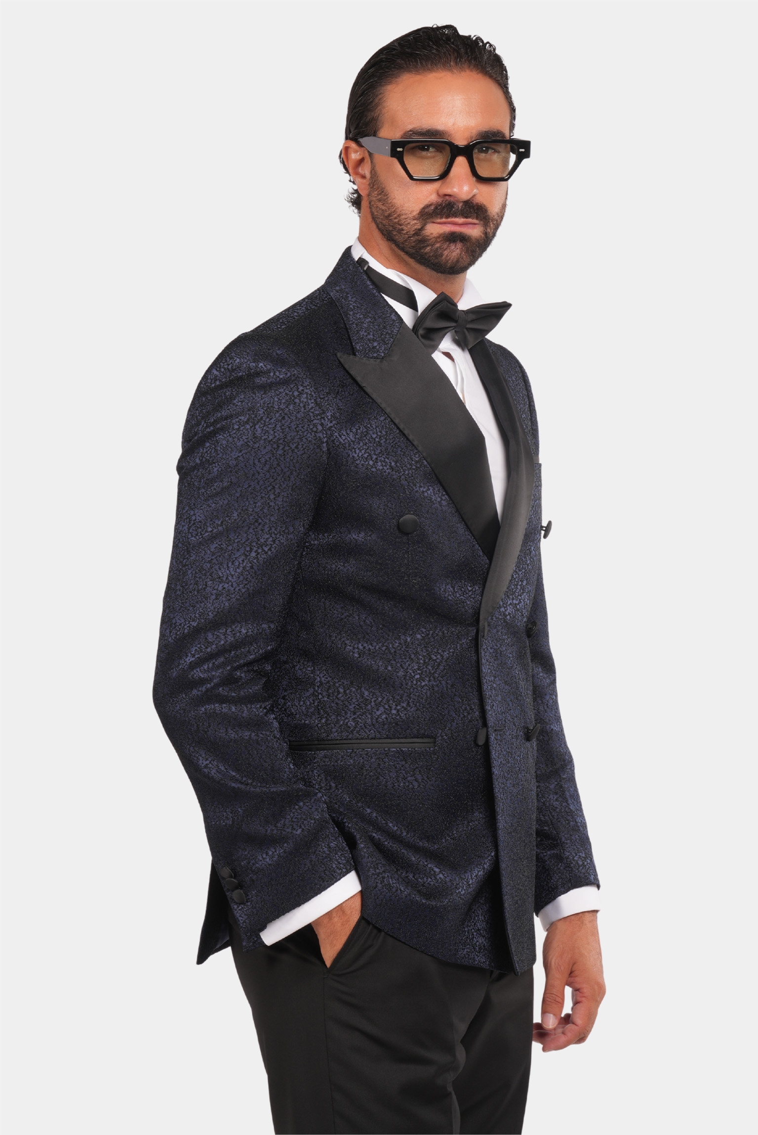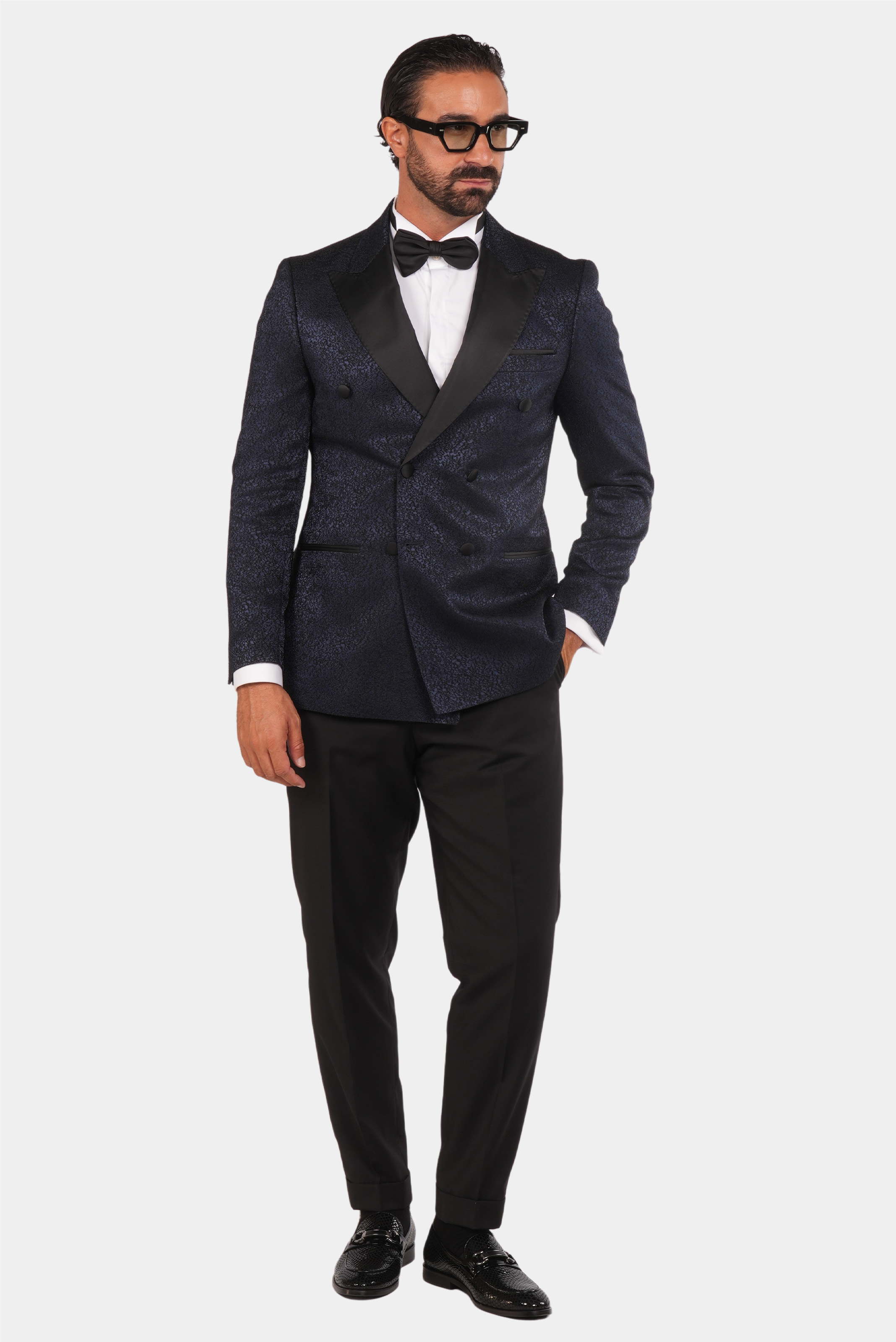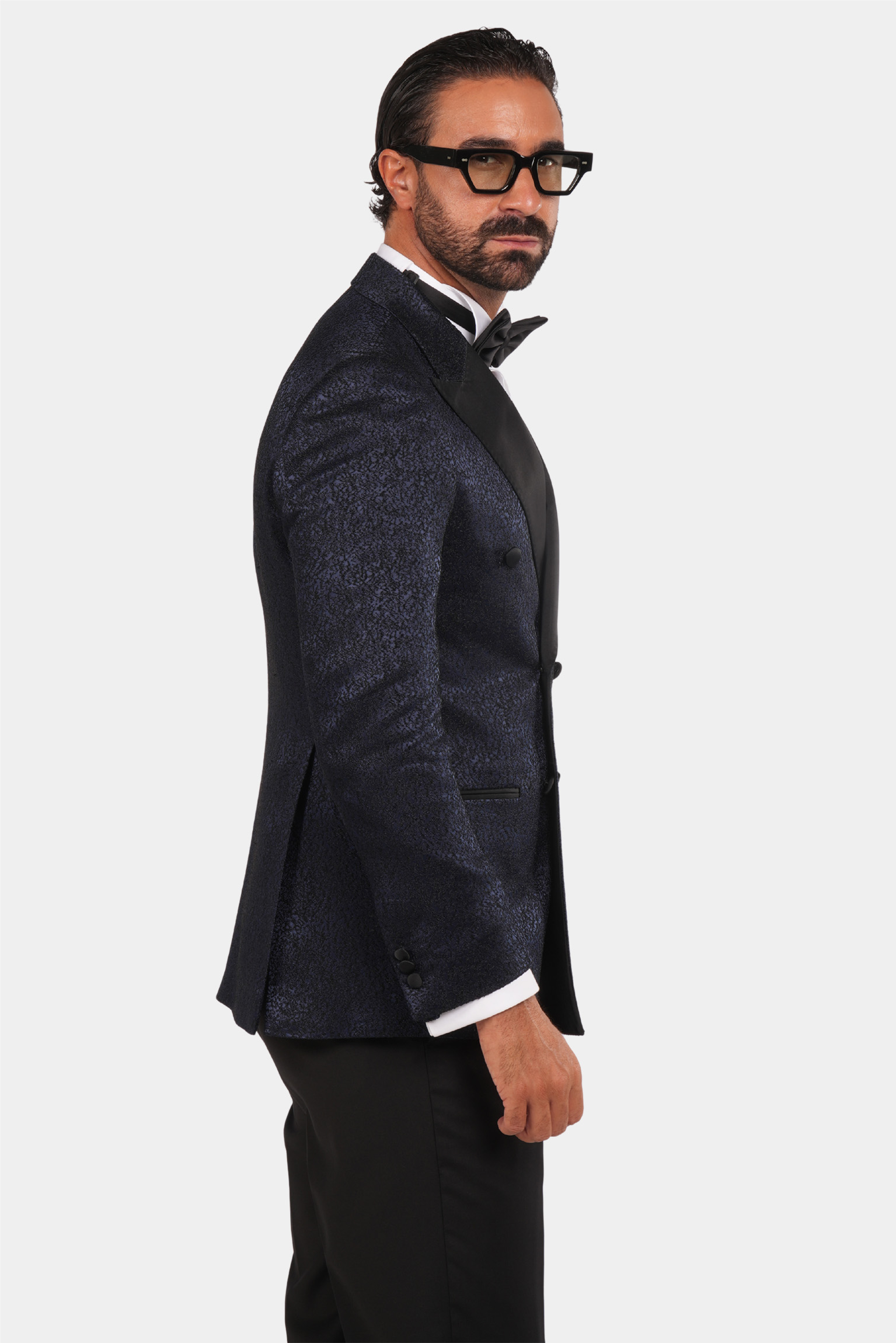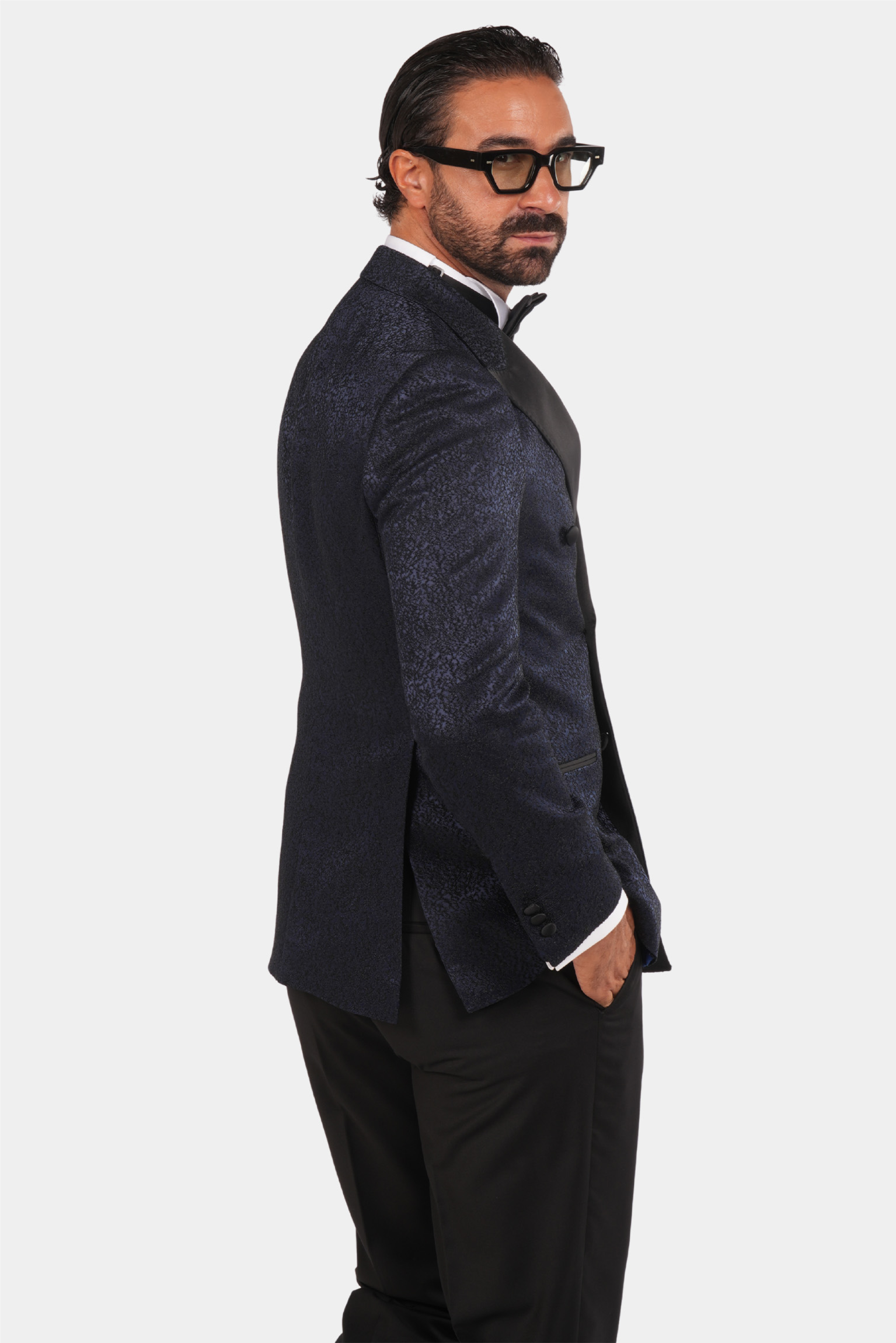 This dark blue tuxedo suit with patterned fabric and a combination of black satin on the collar, buttons and pockets creates a beautiful combination that will make your style unique and elegant.