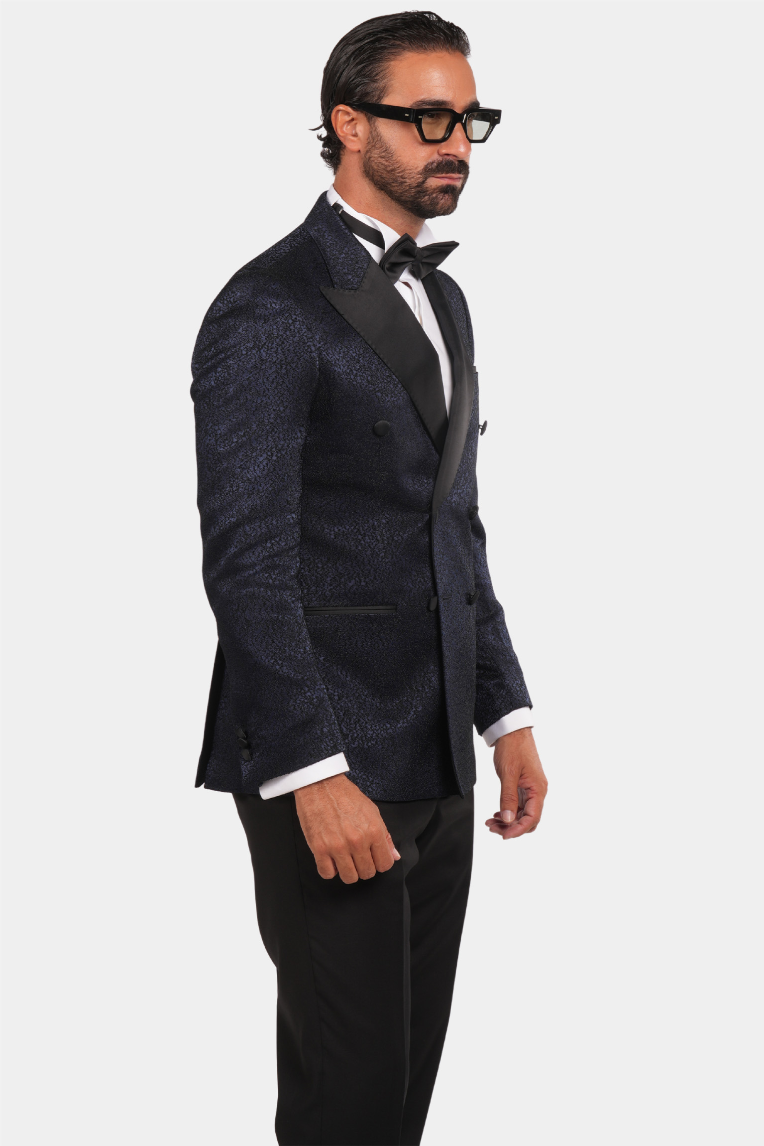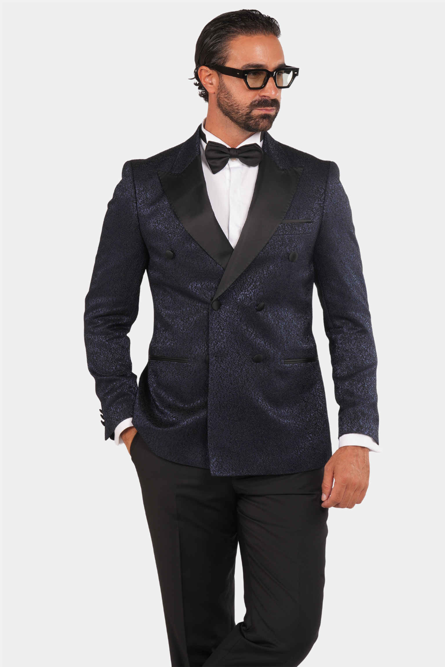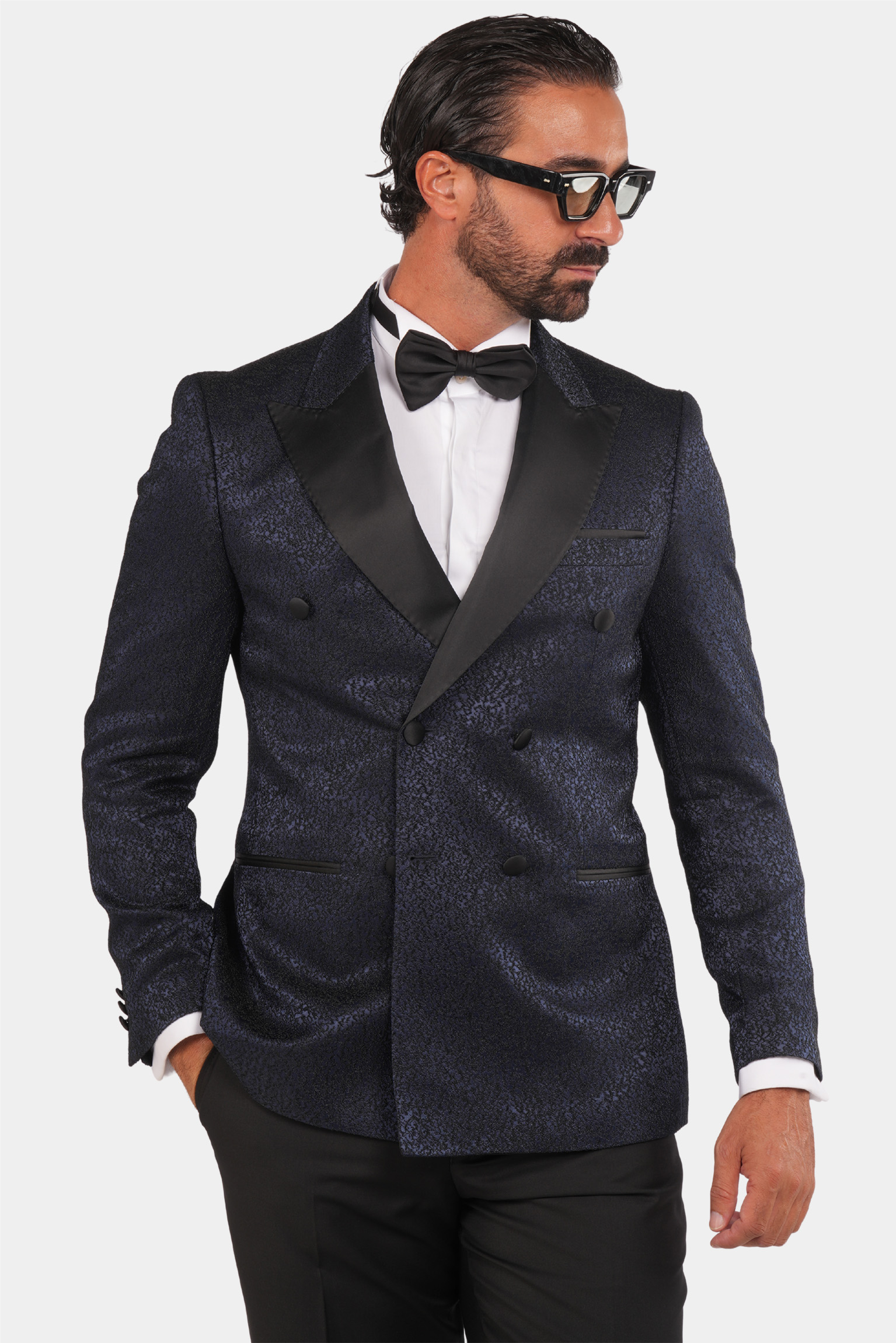 This dark blue tuxedo suit with patterned fabric and a combination of black satin on the collar, buttons and pockets creates a beautiful combination that will make your style unique and elegant.