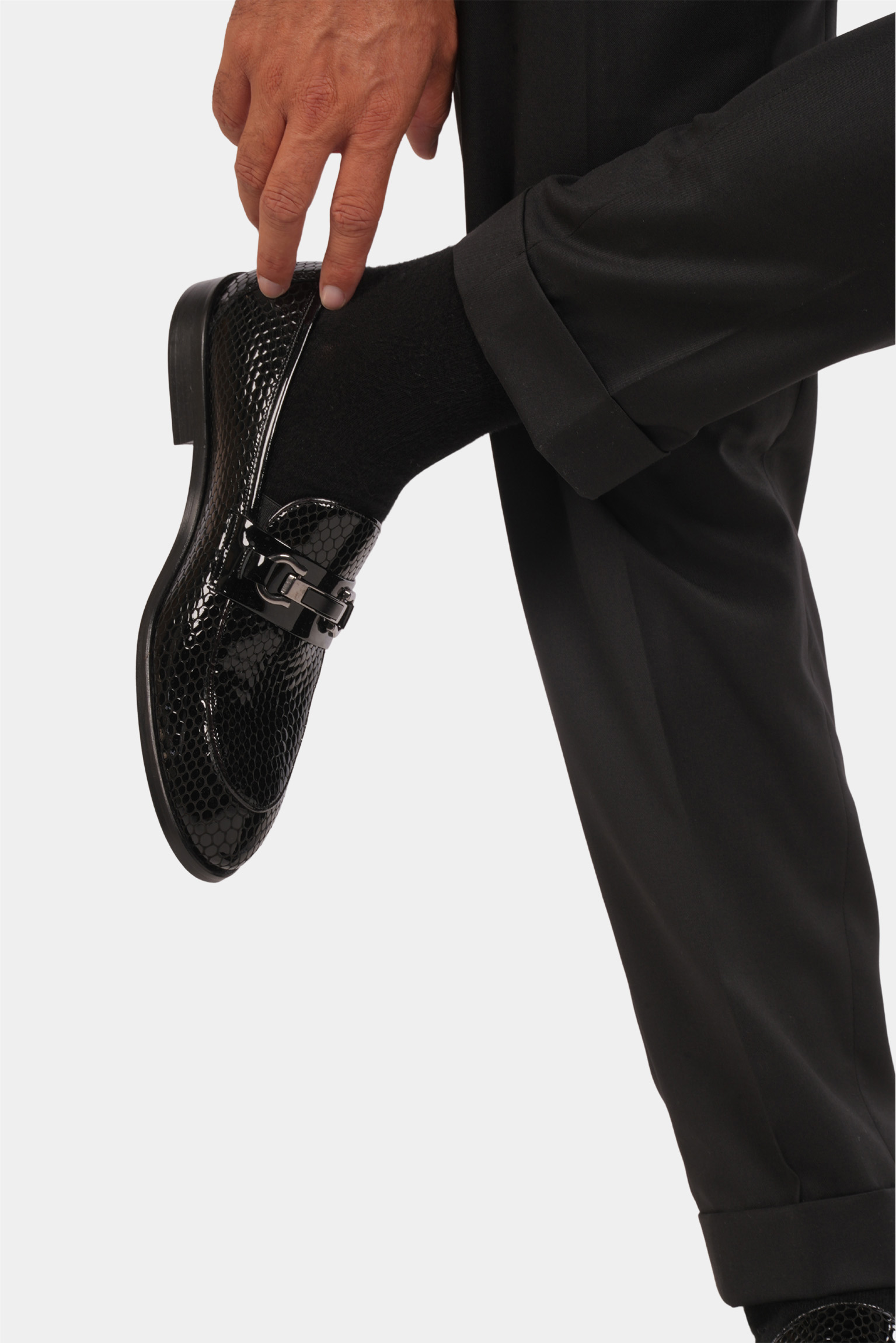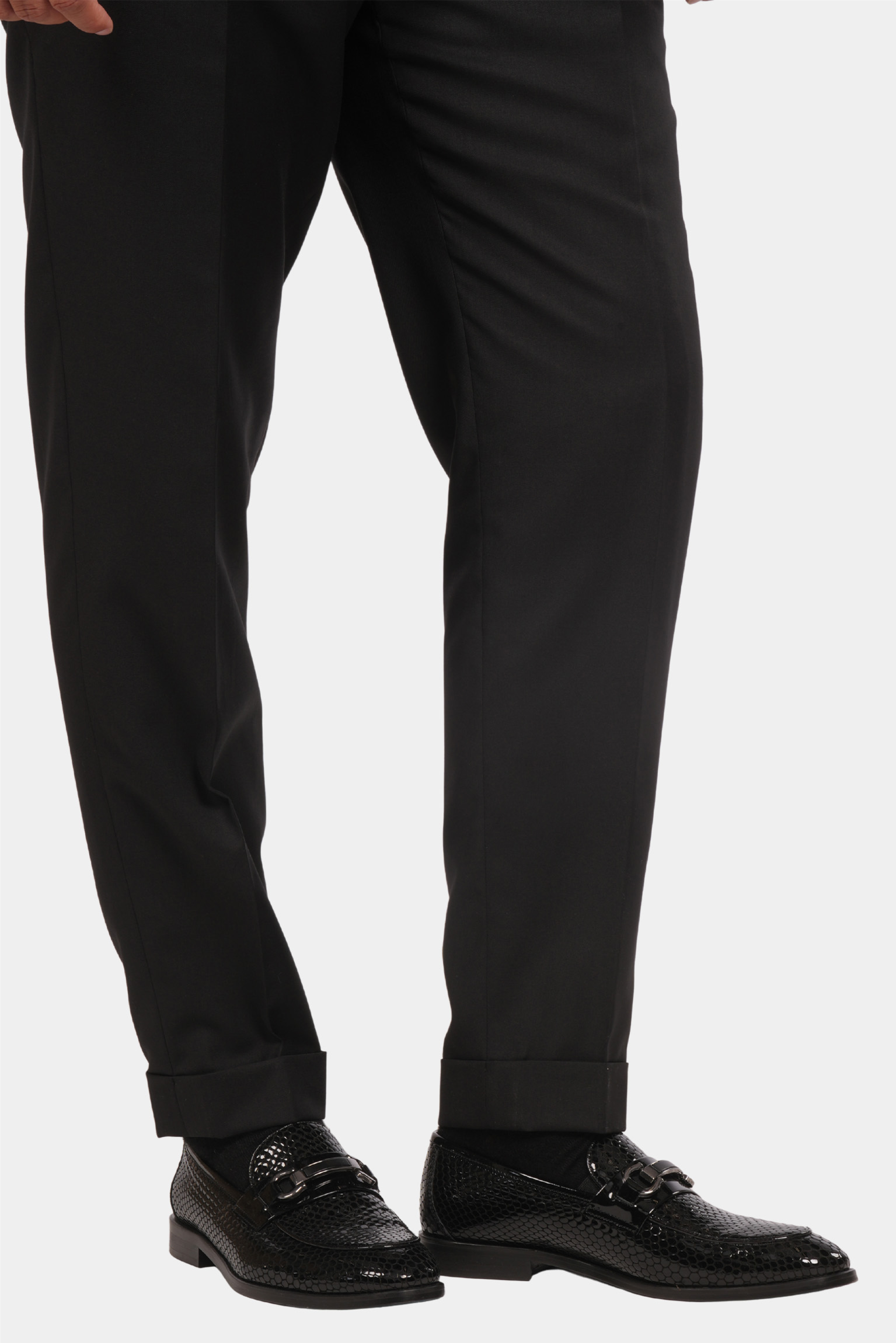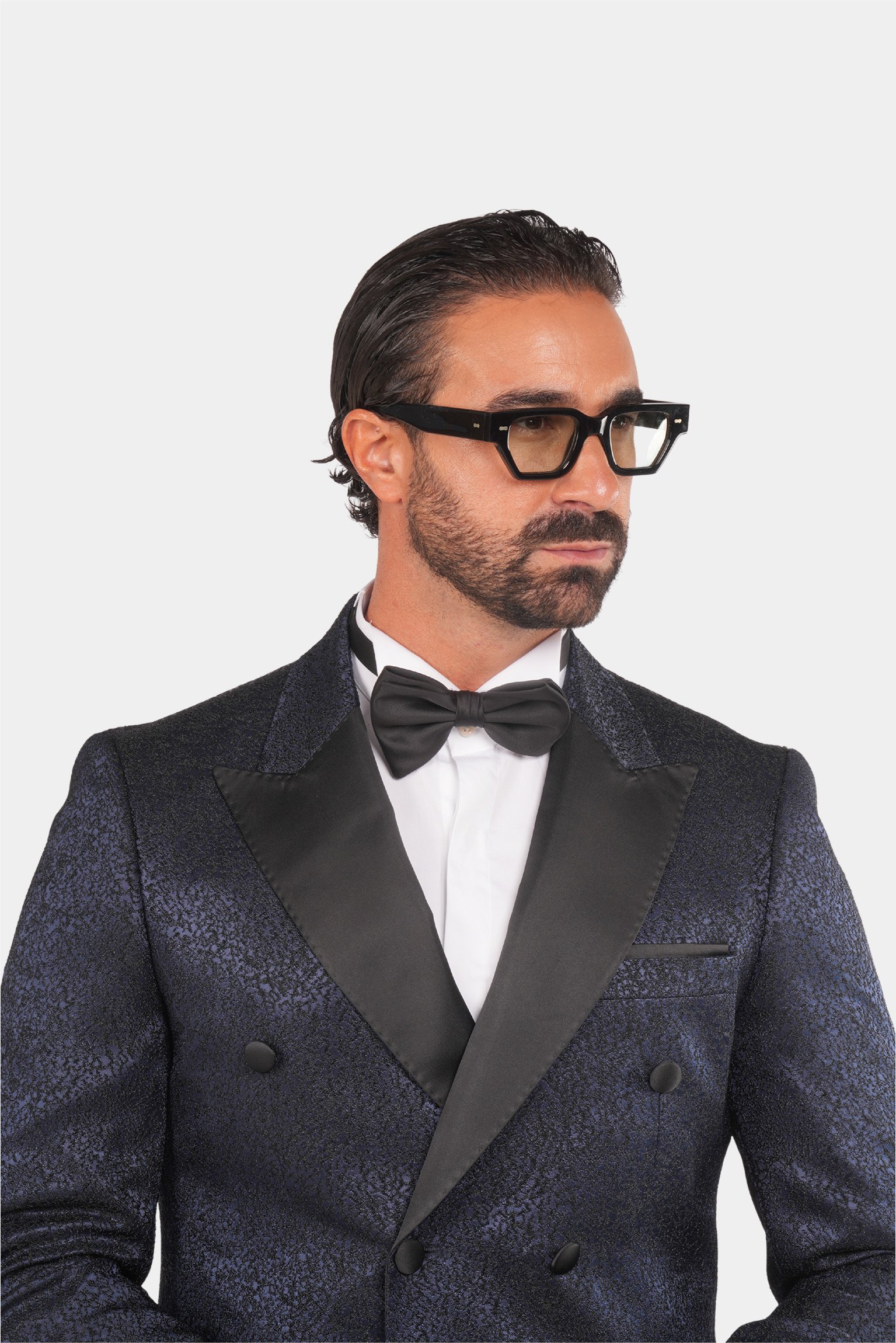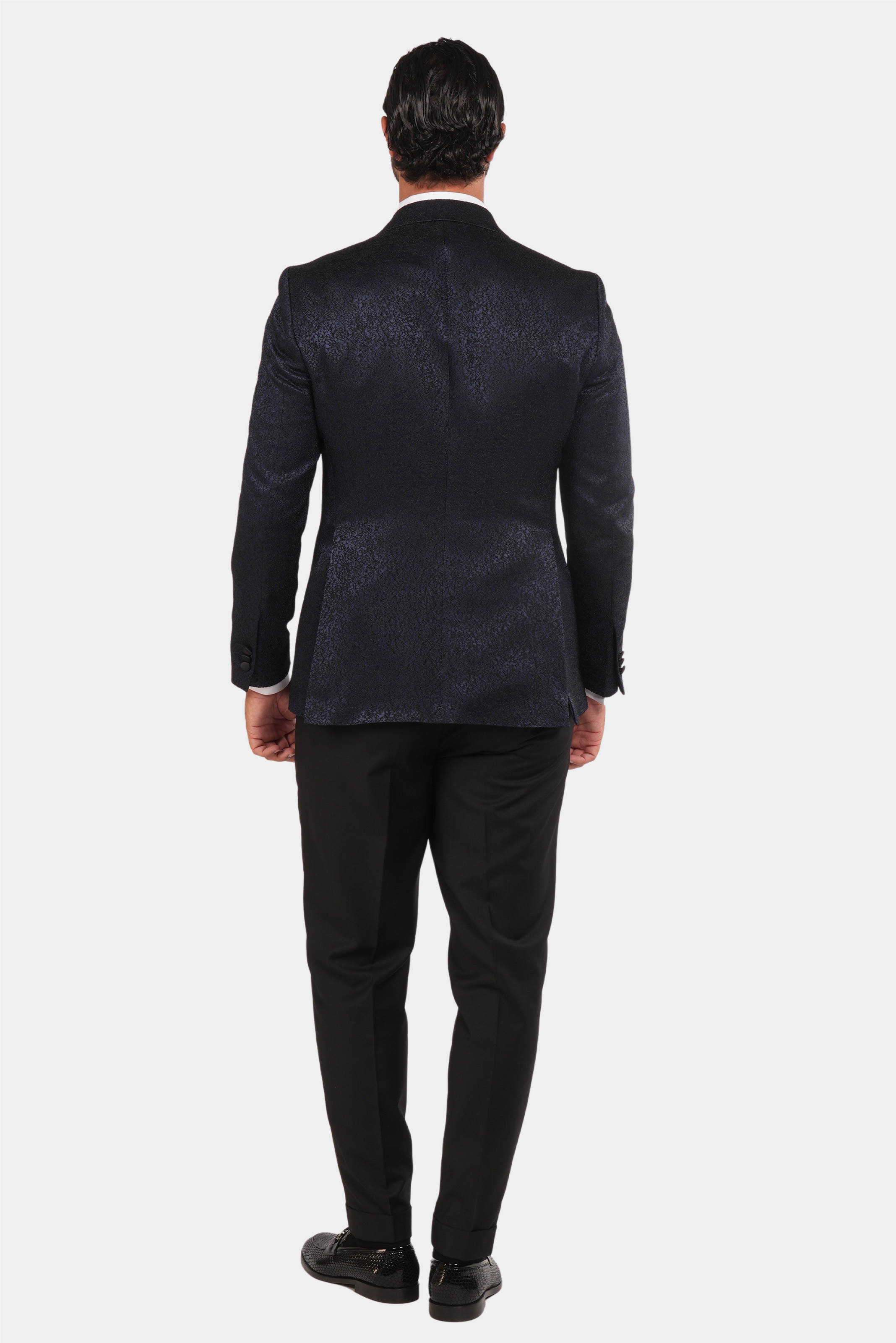 This dark blue tuxedo suit with patterned fabric and a combination of black satin on the collar, buttons and pockets creates a beautiful combination that will make your style unique and elegant.