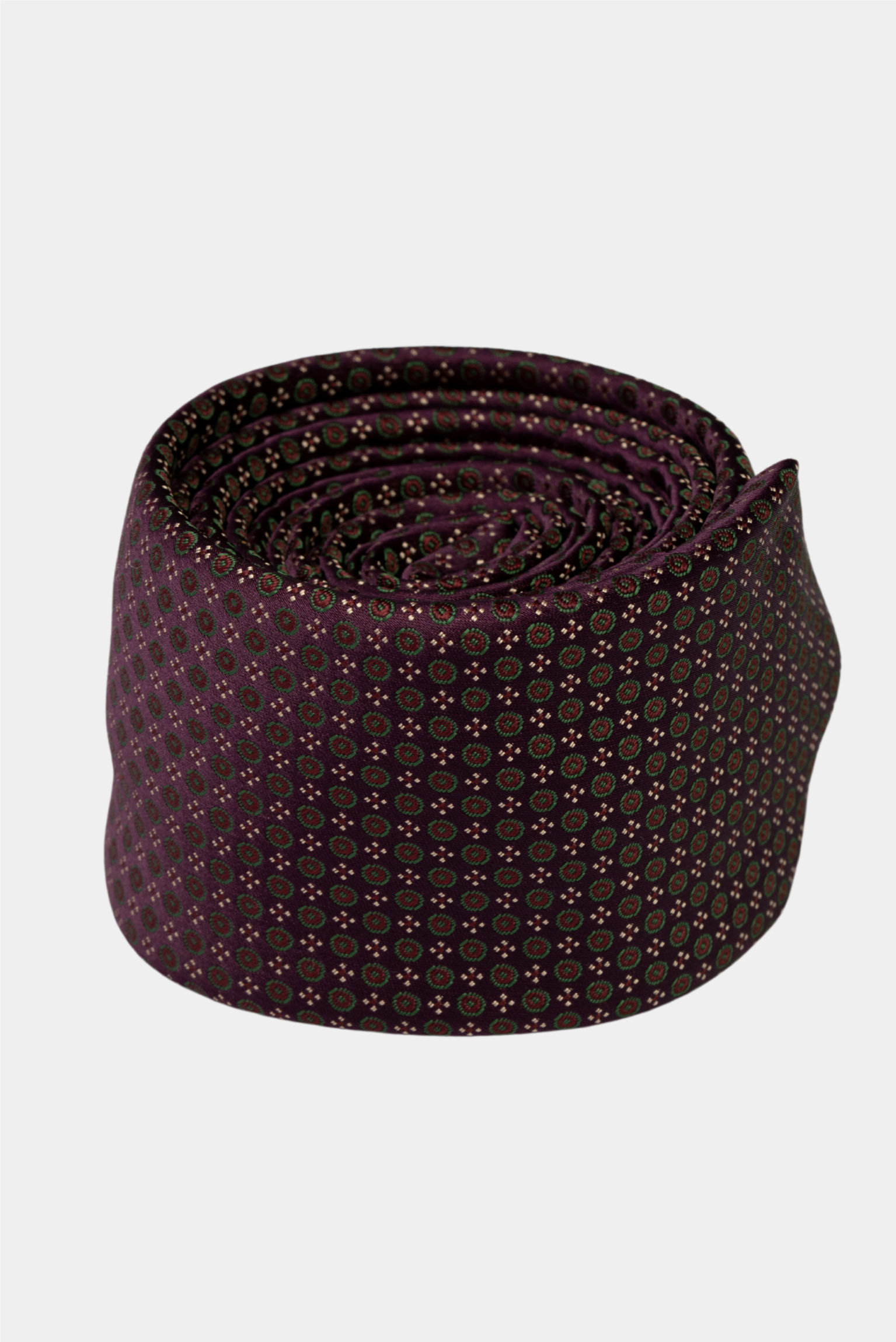 This bordo geometric tie blends timeless charm with a touch of modern texture. Made in Turkey from 100% premium microfiber, it features a rich bordo base adorned with small patterns in gold and green tones. The fine geometric design and smooth finish give it an elegant yet distinctive look, making it a perfect choice for both business and formal occasions. This tie is designed for the gentleman who appreciates subtle sophistication and classic style.