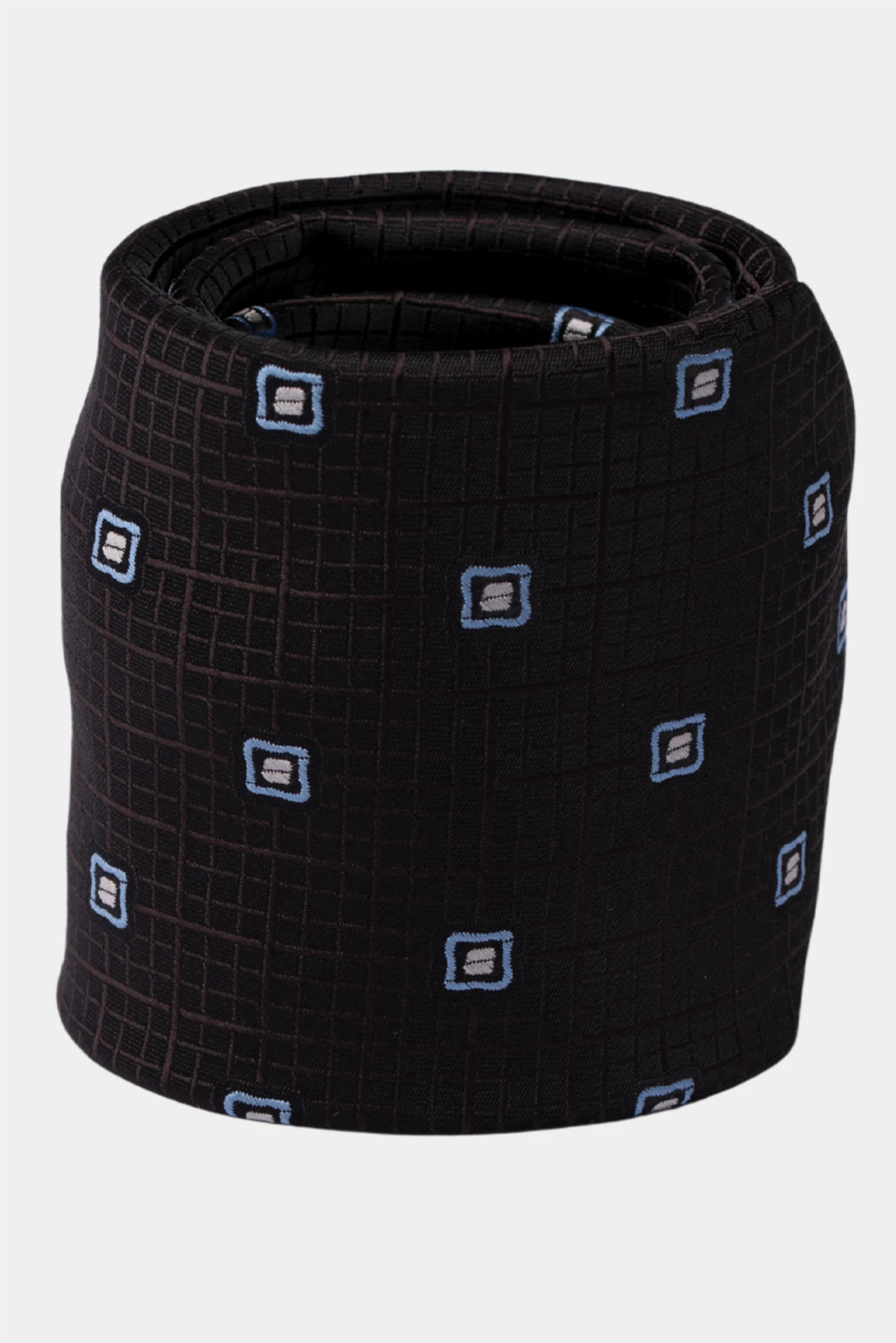 This sophisticated brown tie features a refined micro-square pattern with light blue and white accents, woven on a textured grid surface that adds depth and visual interest.