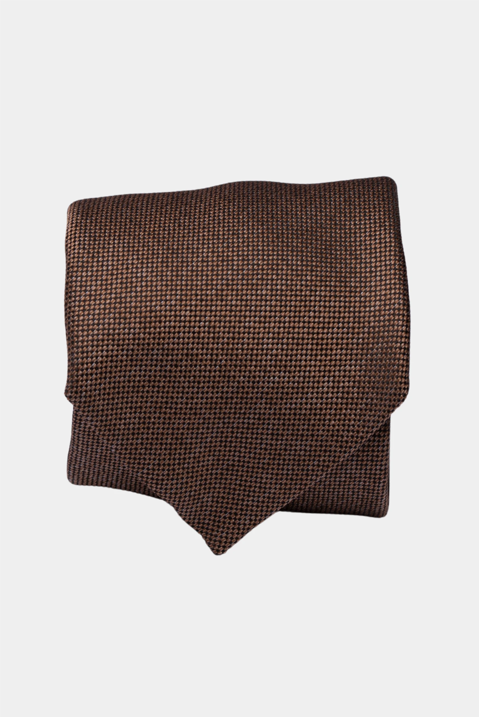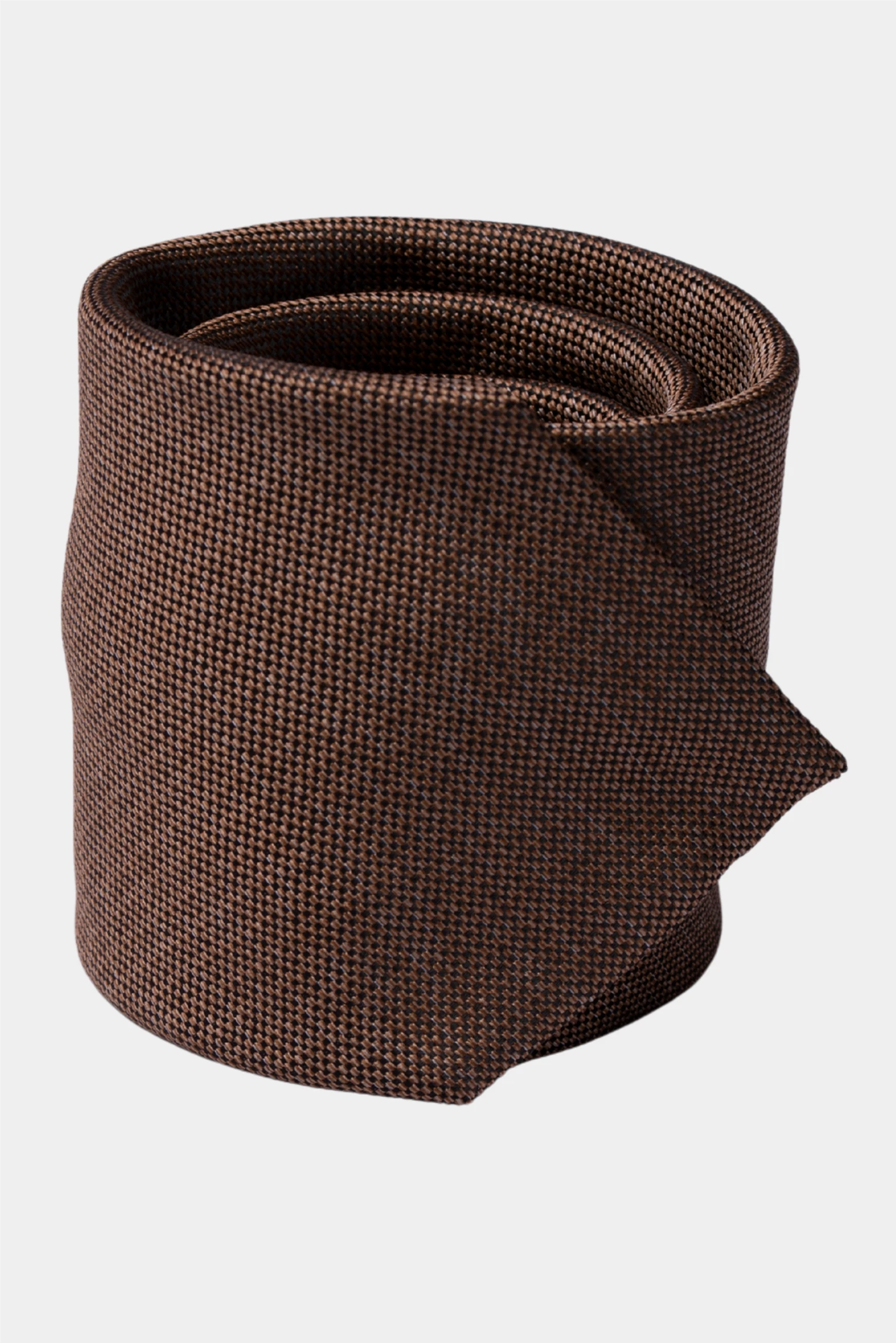 This elegant brown tie features a refined textured weave, giving it depth and a distinctive character while maintaining a timeless solid look.