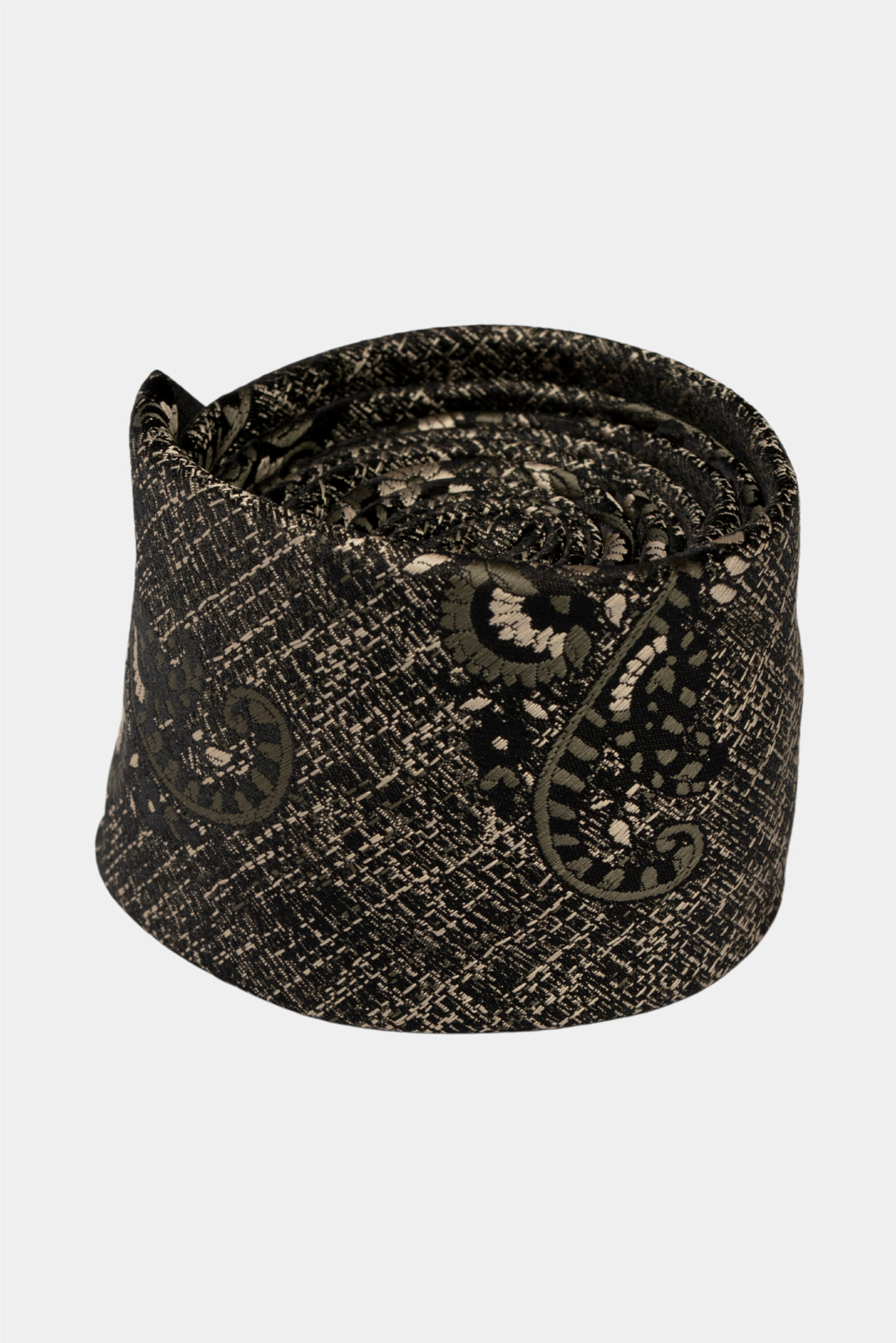This dark green paisley tie blends traditional artistry with a modern textured finish. Made in Turkey from 100% premium microfiber, it features a rich deep-green base with subtle beige and black undertones and an intricate paisley pattern woven into a softly textured surface. The matte weave adds depth and sophistication, making it ideal for men who appreciate understated luxury and refined design.