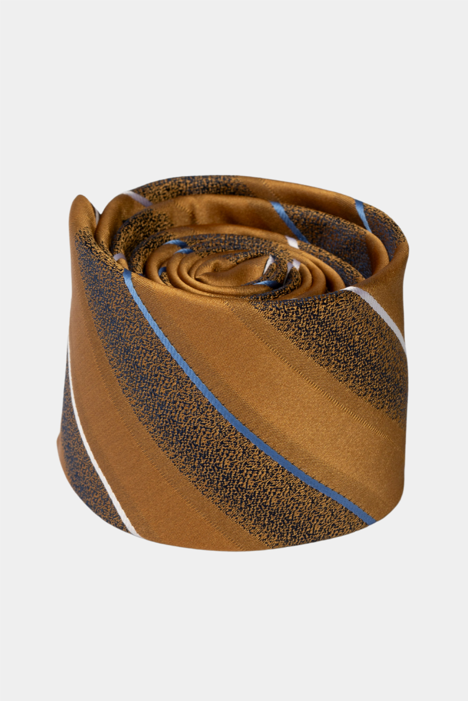 This gold striped tie brings a sophisticated balance of color and texture. Crafted in Turkey from 100% premium microfiber, it features elegant diagonal stripes in gold, navy blue, and white, creating a refined contrast suitable for business and formal wear. The smooth, slightly lustrous surface adds a polished touch to any ensemble.