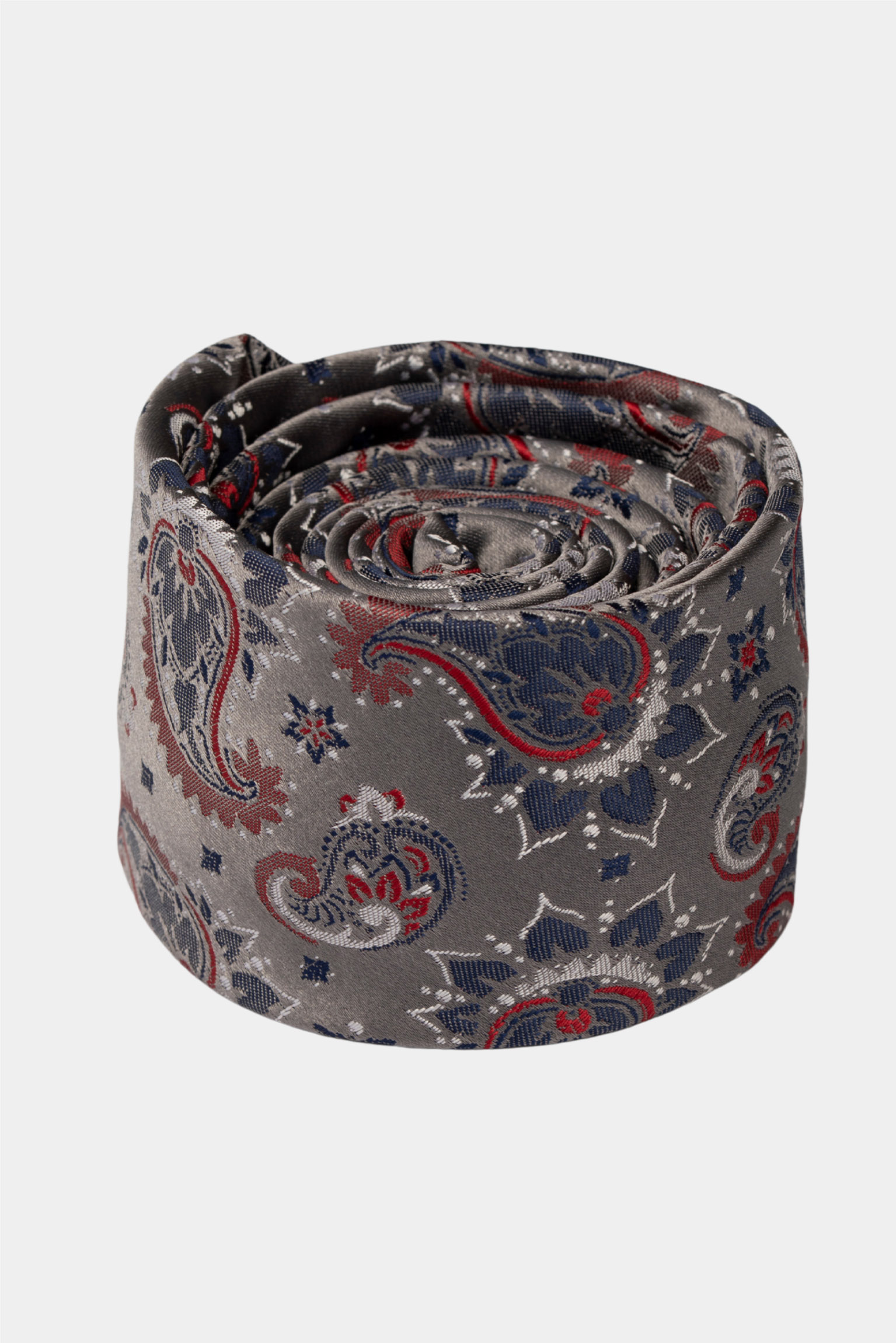This gray tie with an elegant paisley pattern merges timeless tradition with modern sophistication. Crafted in Turkey from 100% premium microfiber, it showcases a soft gray base accentuated with navy and red paisley motifs. The smooth finish and subtle sheen make it a refined choice for both formal and semi-formal occasions.