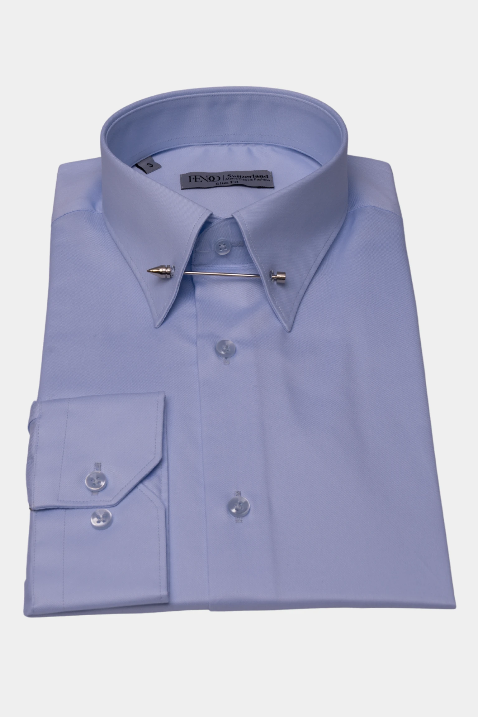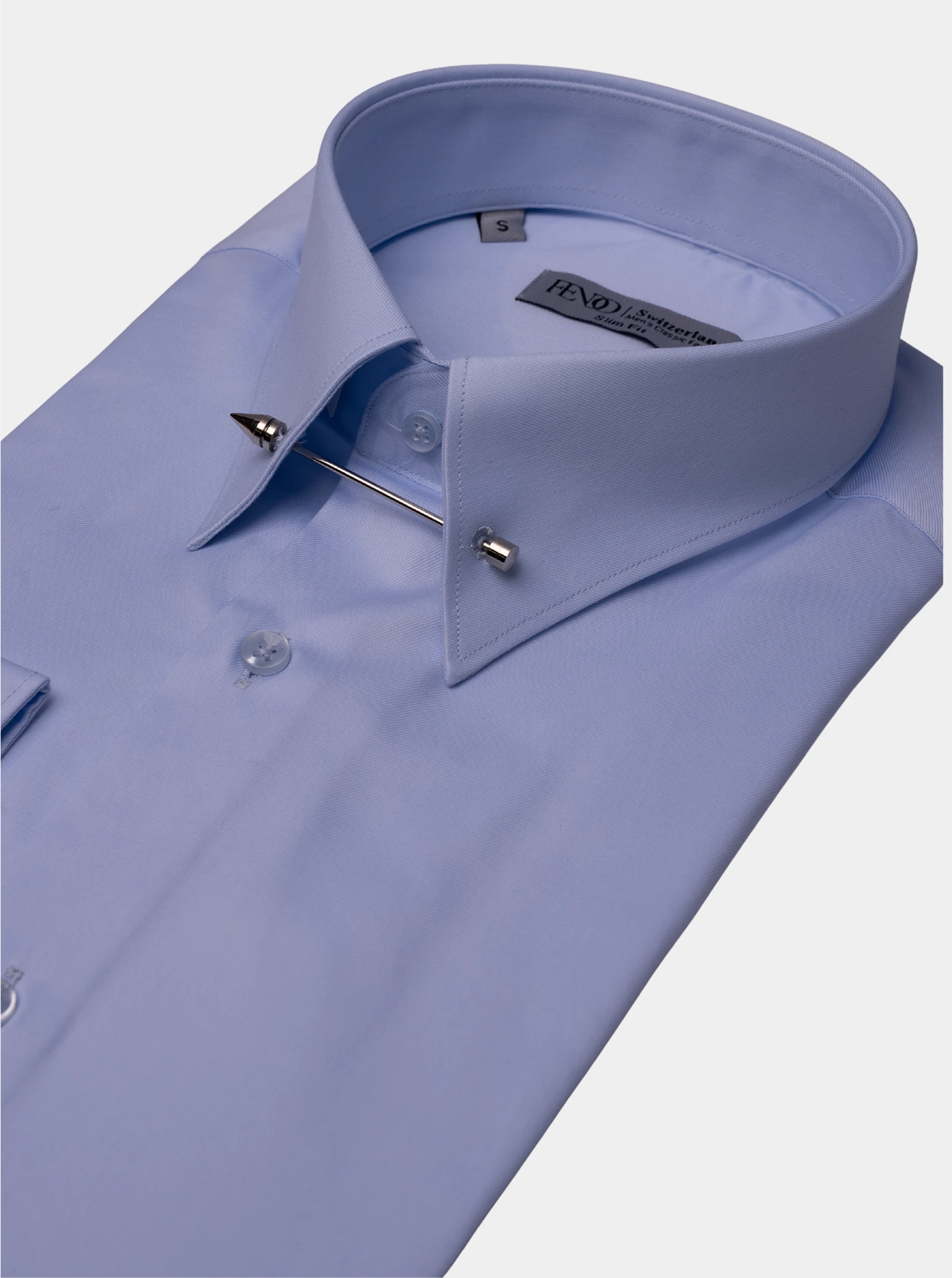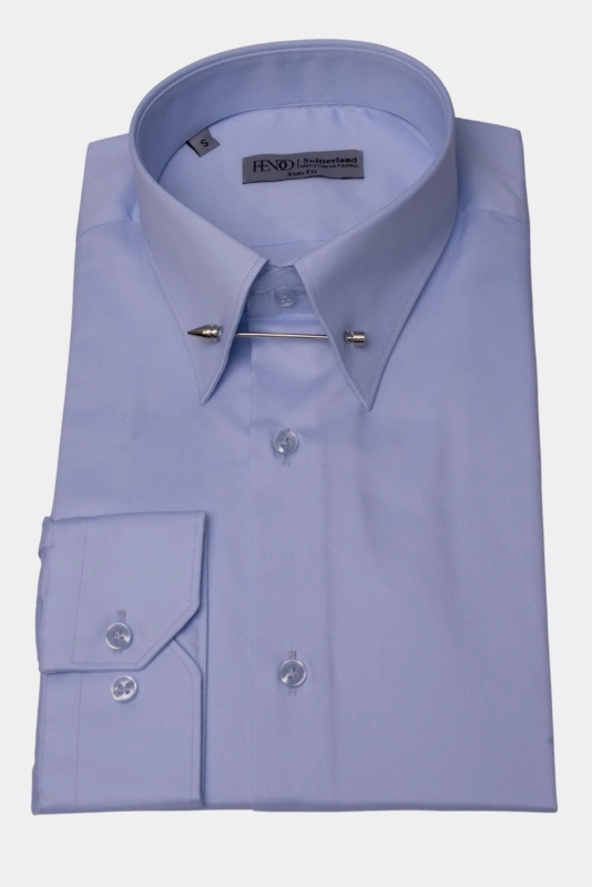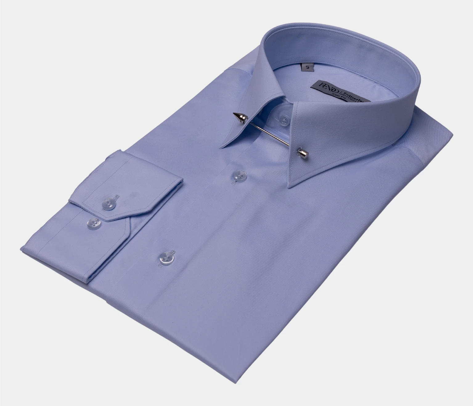 A refined light blue shirt crafted from 100% cotton, designed for men who appreciate classic style with a modern edge. The pin collar, accented with a polished metal bar, adds a sophisticated touch and perfectly lifts the tie knot for a sharp, balanced look. With its slim-fit silhouette and soft, breathable cotton fabric, it delivers both comfort and elegance — ideal for business meetings, evening events, or any occasion that calls for timeless sophistication.