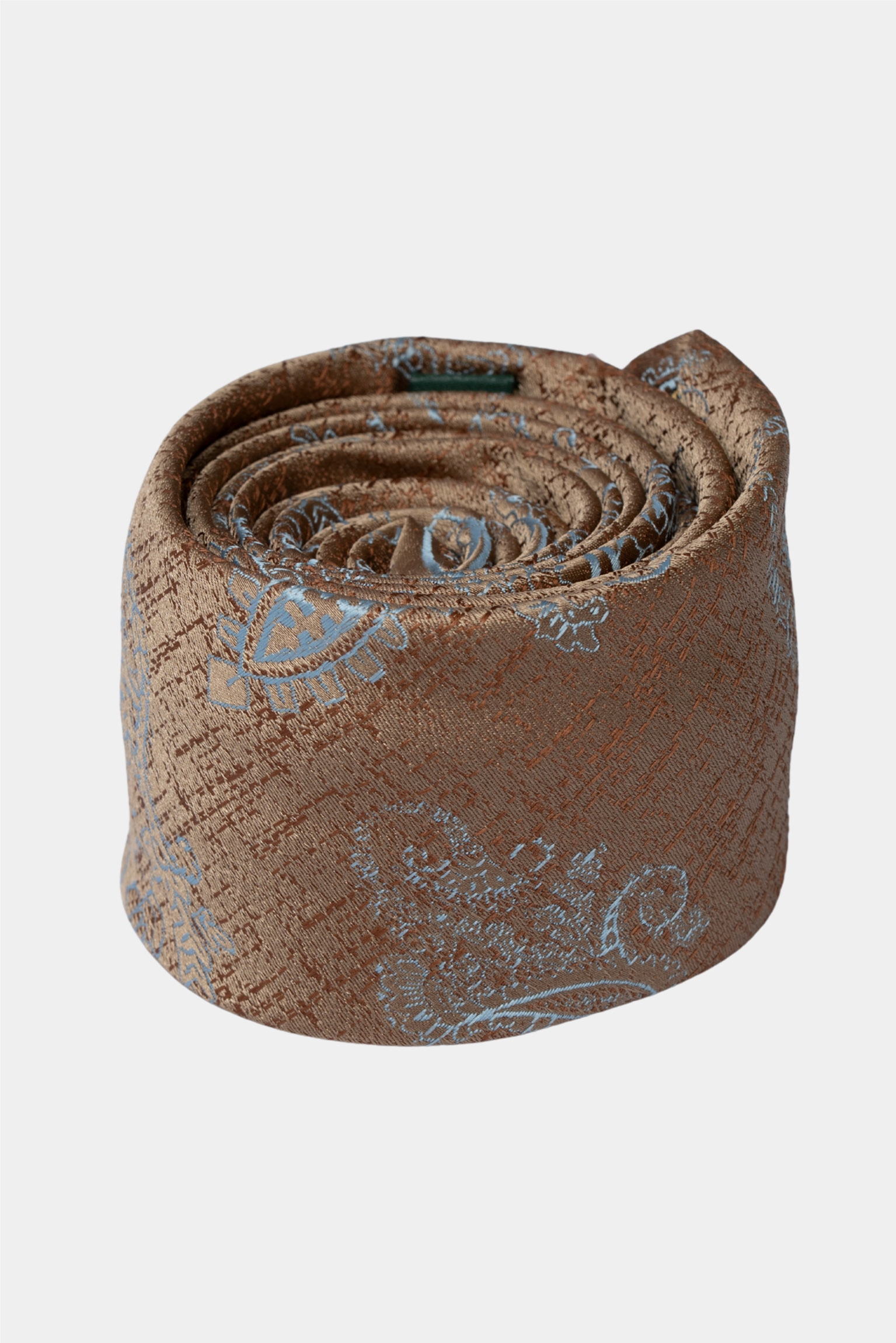 This light brown tie with an elegant paisley pattern adds warmth and sophistication to any ensemble. Crafted in Turkey from 100% premium microfiber, it features a soft light brown base accented with delicate sky-blue paisley motifs. The smooth texture and gentle sheen create a refined look, perfect for formal and semi-formal occasions.
