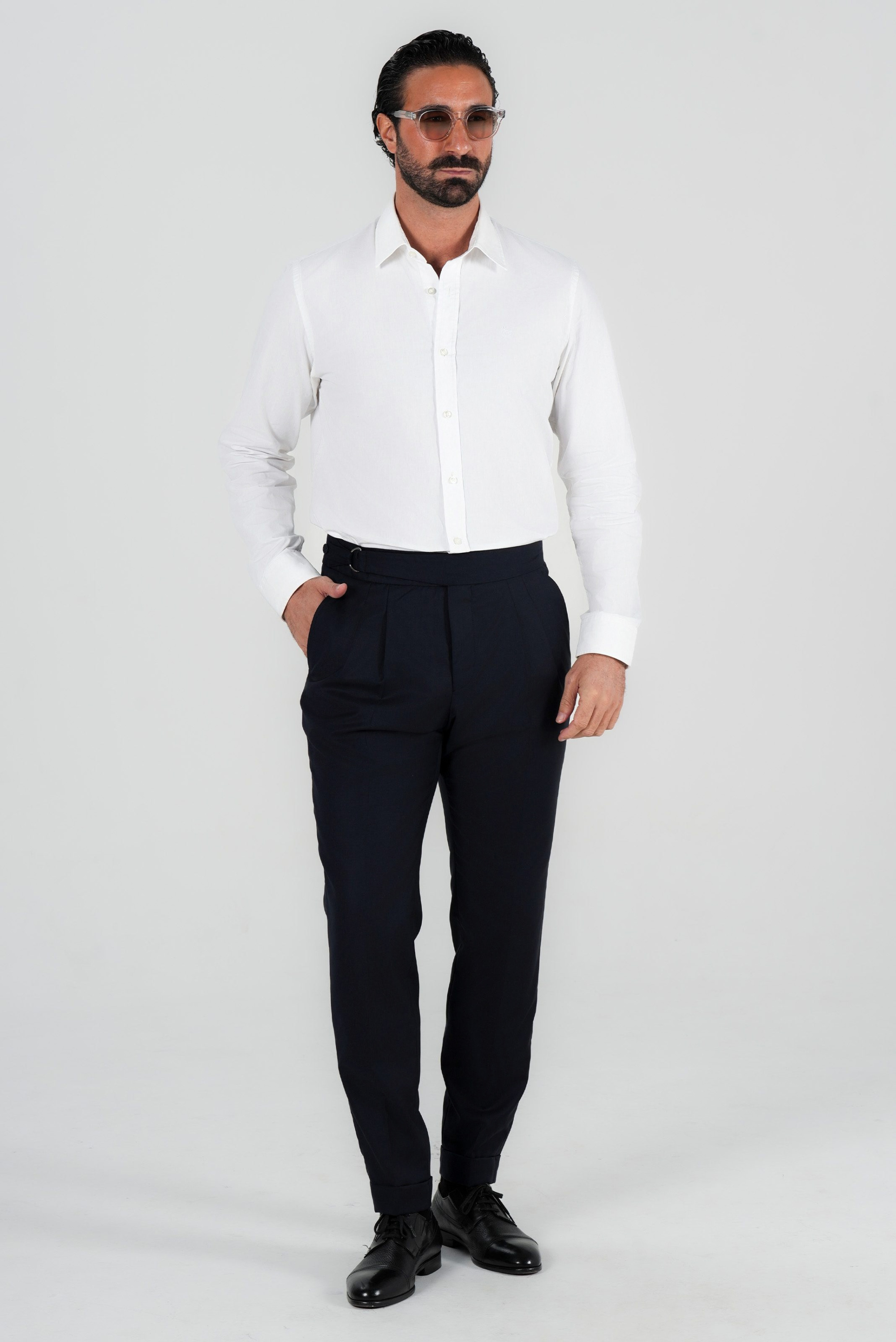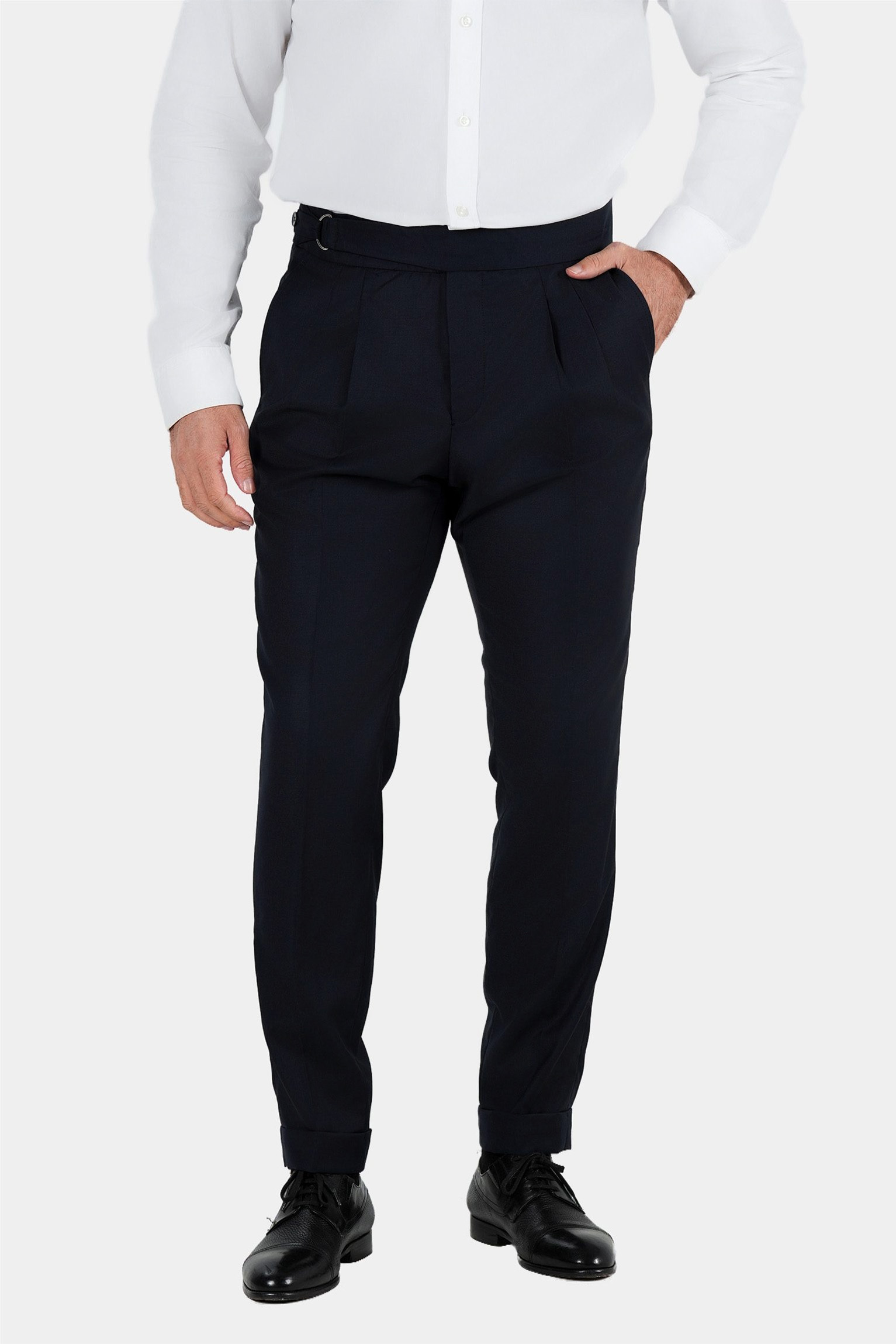 With their classic Italian cut, these trousers feature a double-pleated front and adjustable side tabs for a flawless fit without the need for a belt. The deep dark blue tone exudes understated luxury, making them an ideal choice for formal occasions, business attire, or refined smart-casual looks.