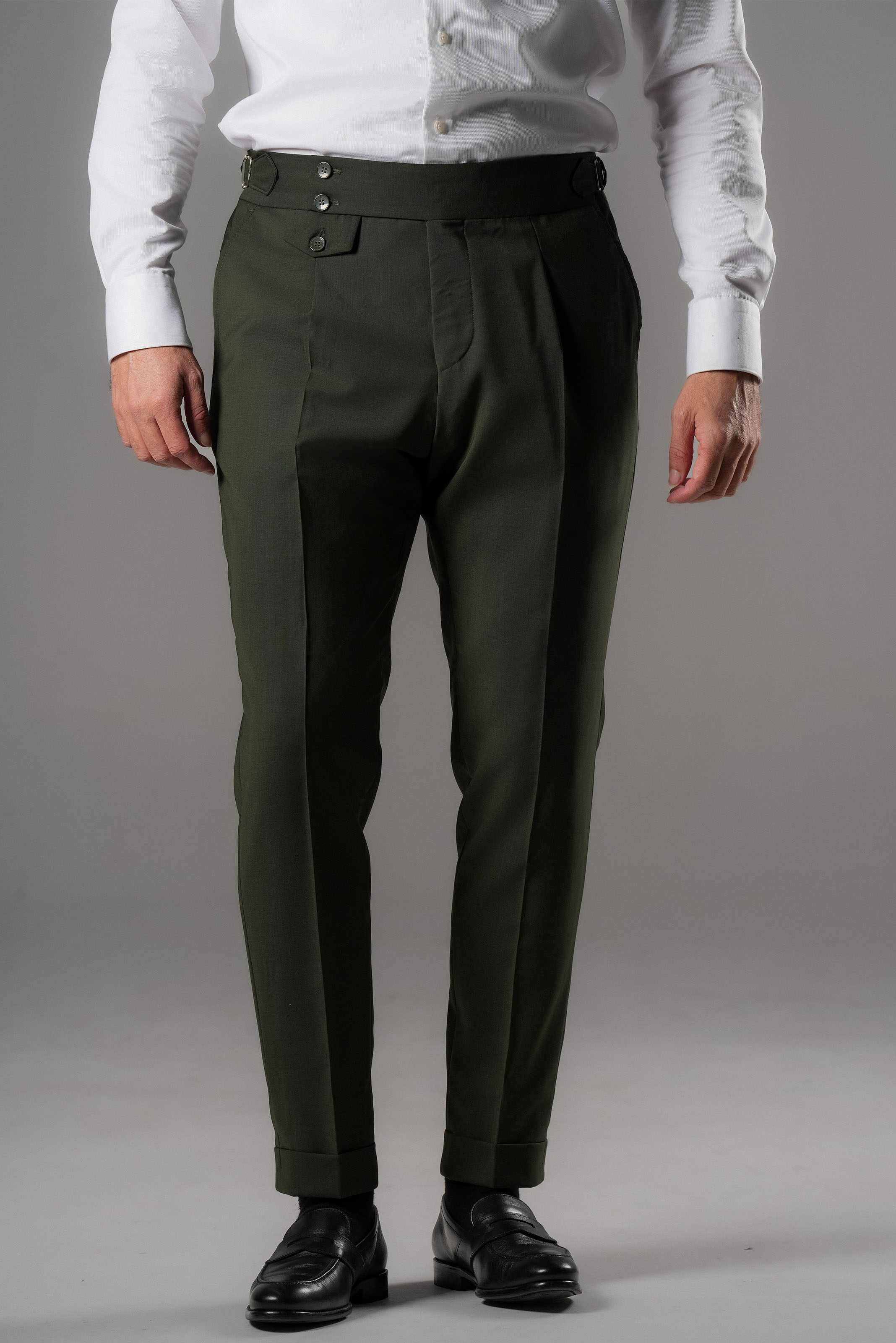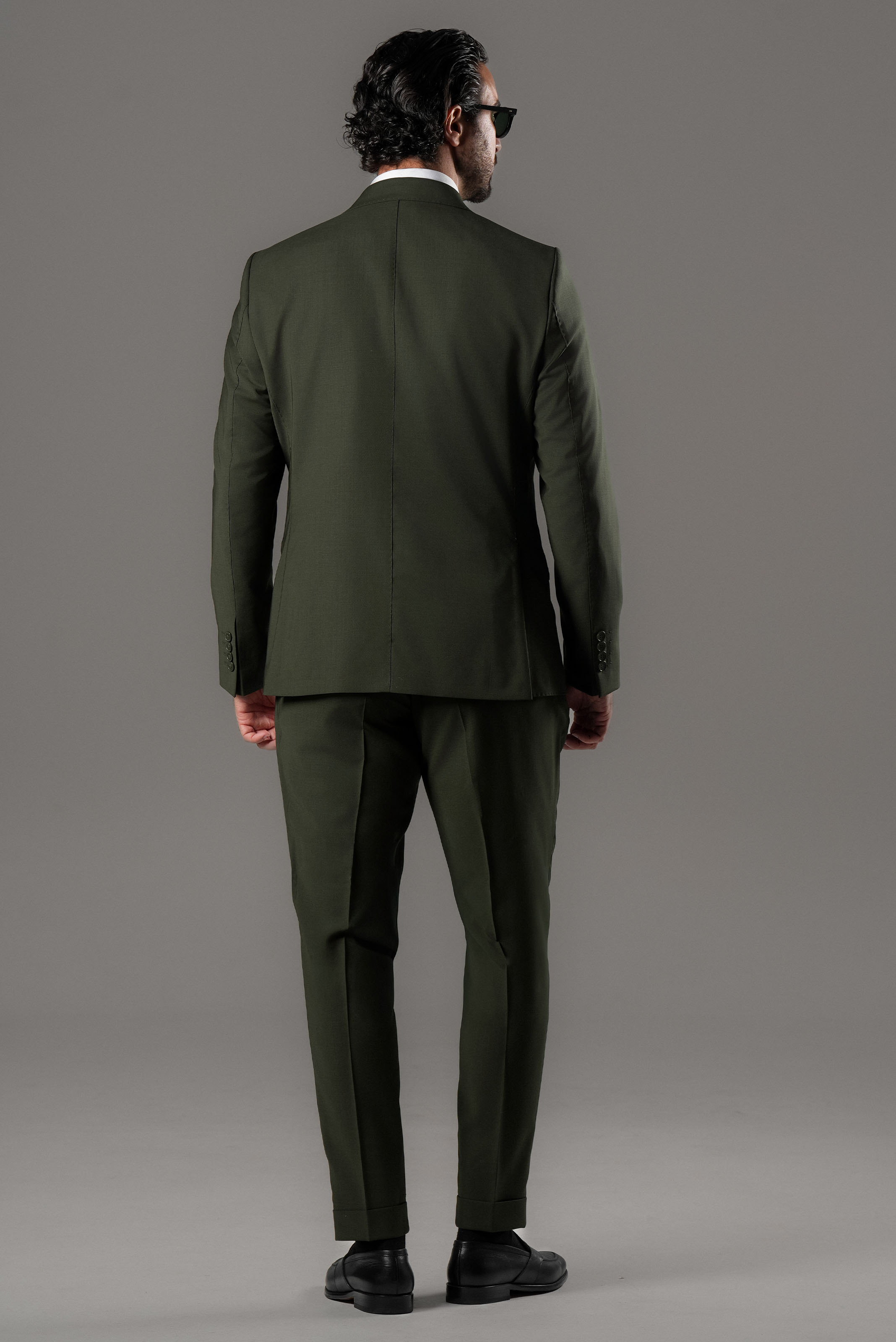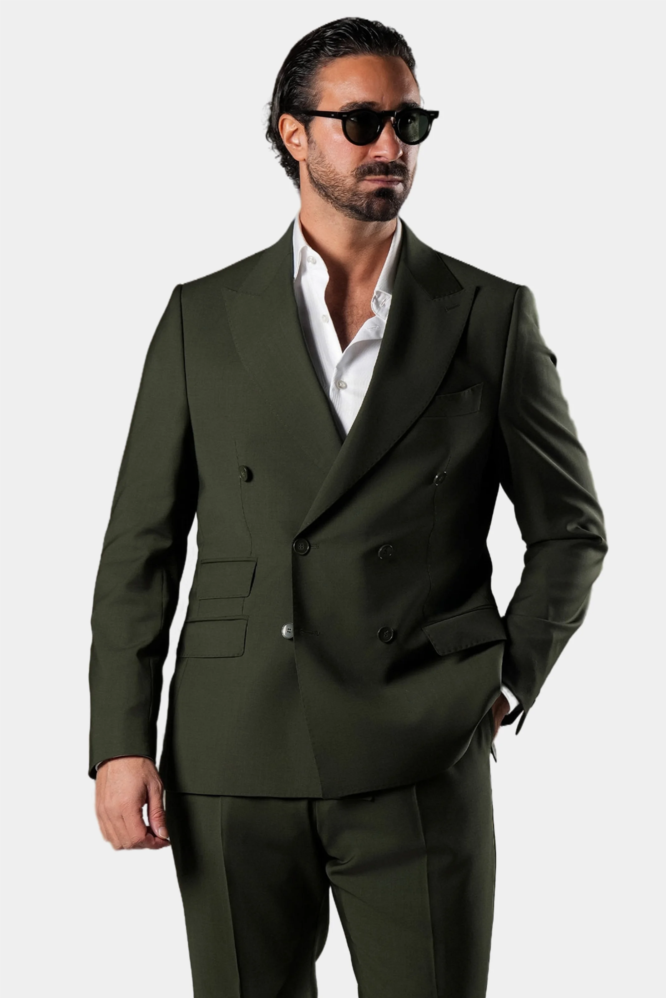 This green double-breasted slim fit suit presents a confident blend of contemporary tailoring and classic Italian craftsmanship. Cut from 100% Super 130s wool by Carnet Como, it offers a fine, smooth texture with a refined natural drape. The rich green tone gives the suit a distinctive yet elegant character, while the rising peak lapel sharpens the silhouette and enhances its formal presence. Built with a half-canvas construction and fully lined with viscose, this Italian-made suit delivers structure, comfort, and long-lasting shape—ideal for elevated business wear and sophisticated occasions.