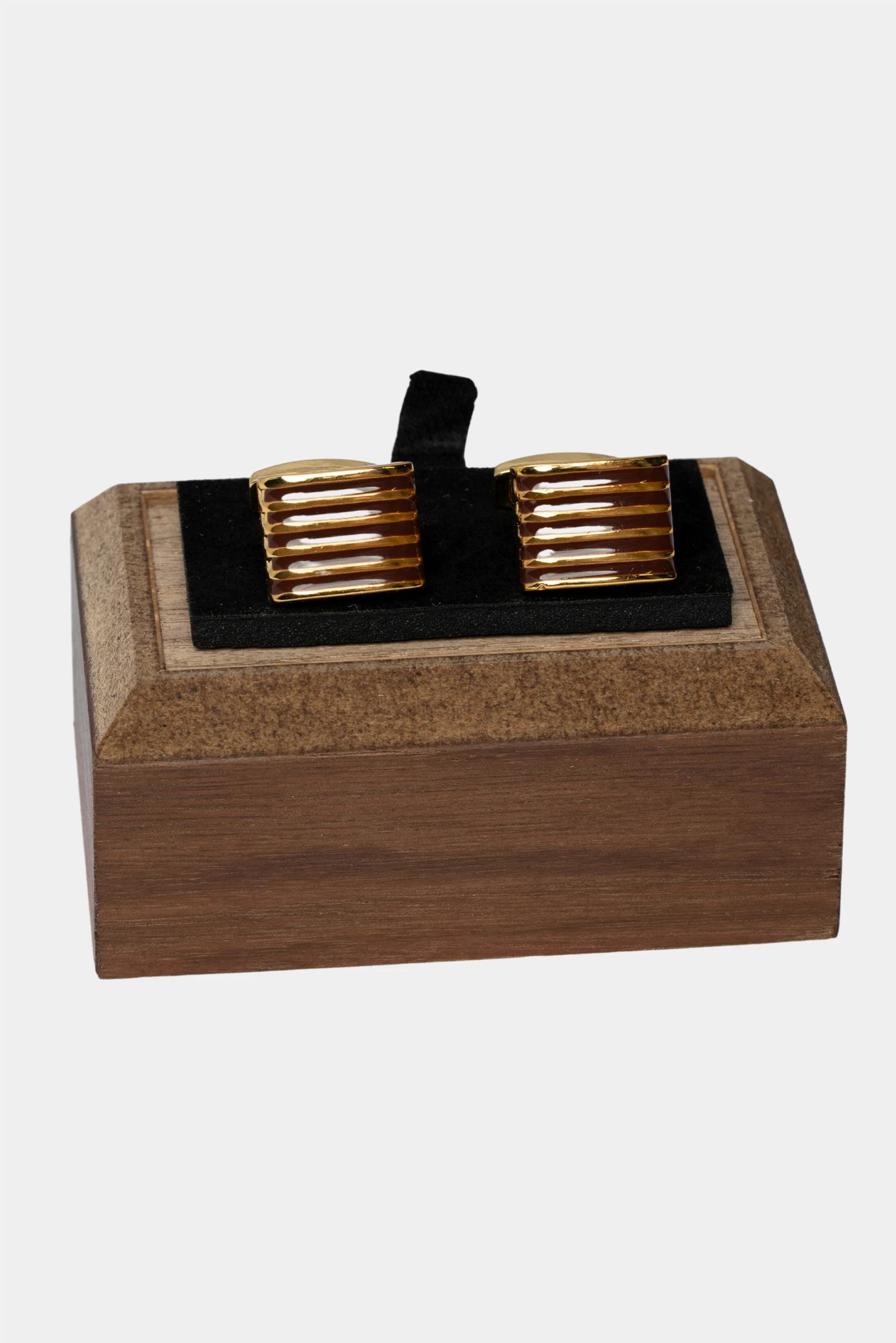Diese Manschettenknoepfe besitzen ein modernes rechteckiges Design mit horizontalen Rillenlinien und einem tiefbraunen Emaille-Finish, eingefasst in poliertem Goldmetall.