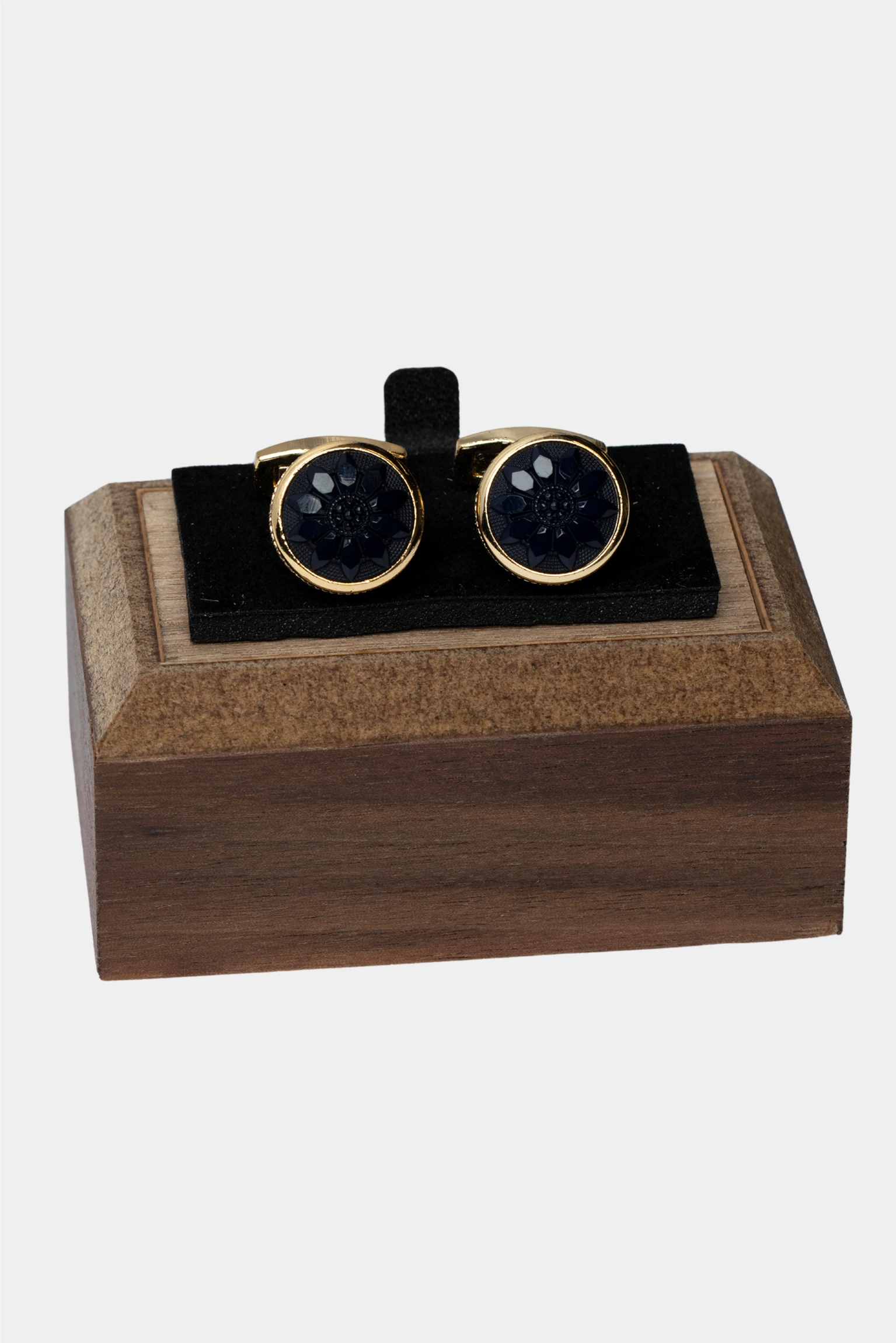 Diese Manschettenknoepfe besitzen ein elegantes rundes Design mit einem polierten Goldrahmen und einem navyblauen Emaillezentrum, verziert mit einem fein reliefierten floralen Muster.