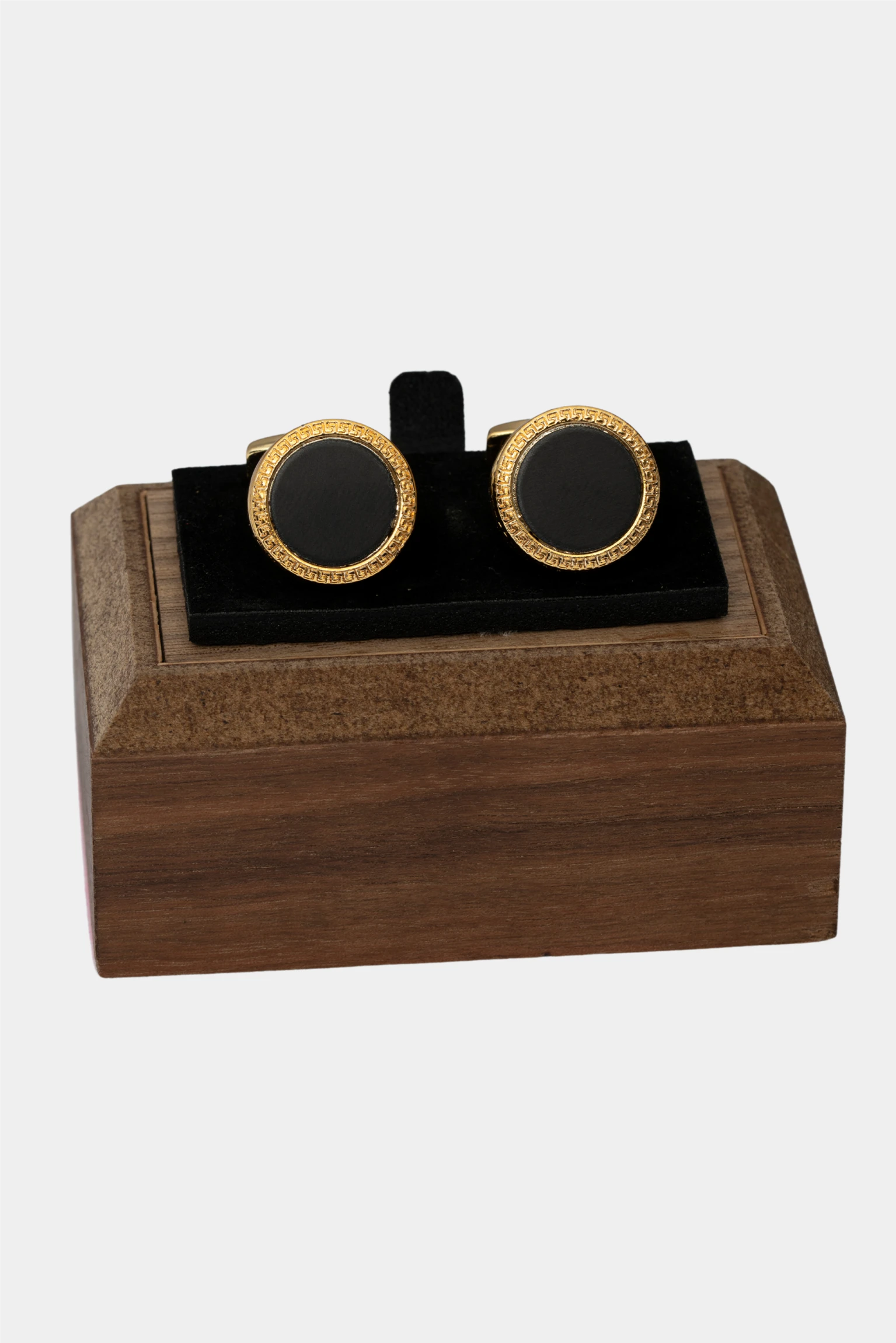 Diese Manschettenknoepfe besitzen ein klassisches rundes Design mit einem polierten Goldrahmen, der mit einem feinen geometrischen Muster graviert ist, sowie einem schwarzen Emaillezentrum fuer ein zeitlos elegantes Finish.