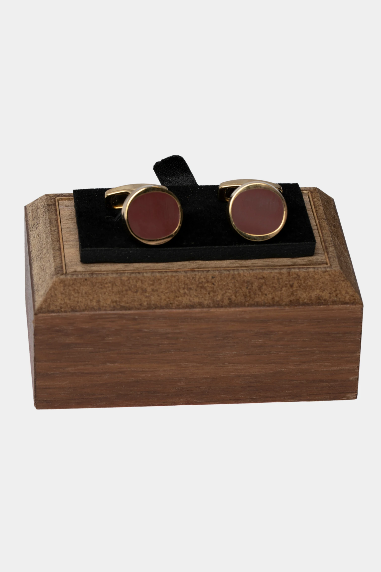Diese Manschettenknoepfe besitzen eine klassische runde Silhouette mit einem polierten Goldrahmen und einem kastanienfarbenen Emaillezentrum – ein reiches Braun-Burgund-Ton, der Waerme und Raffinesse ausstrahlt.