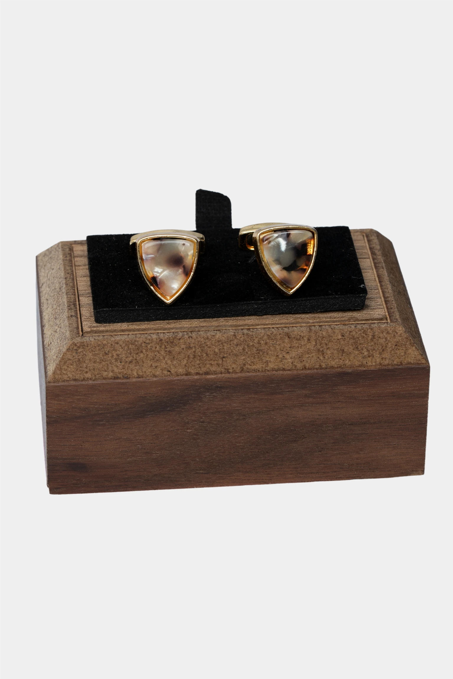 Diese Manschettenknoepfe besitzen ein elegantes schildfoermiges Design mit einem polierten Goldrahmen und einem marmorierten braunen Zentrum in Muscheloptik, das Licht mit eleganter Tiefe reflektiert.