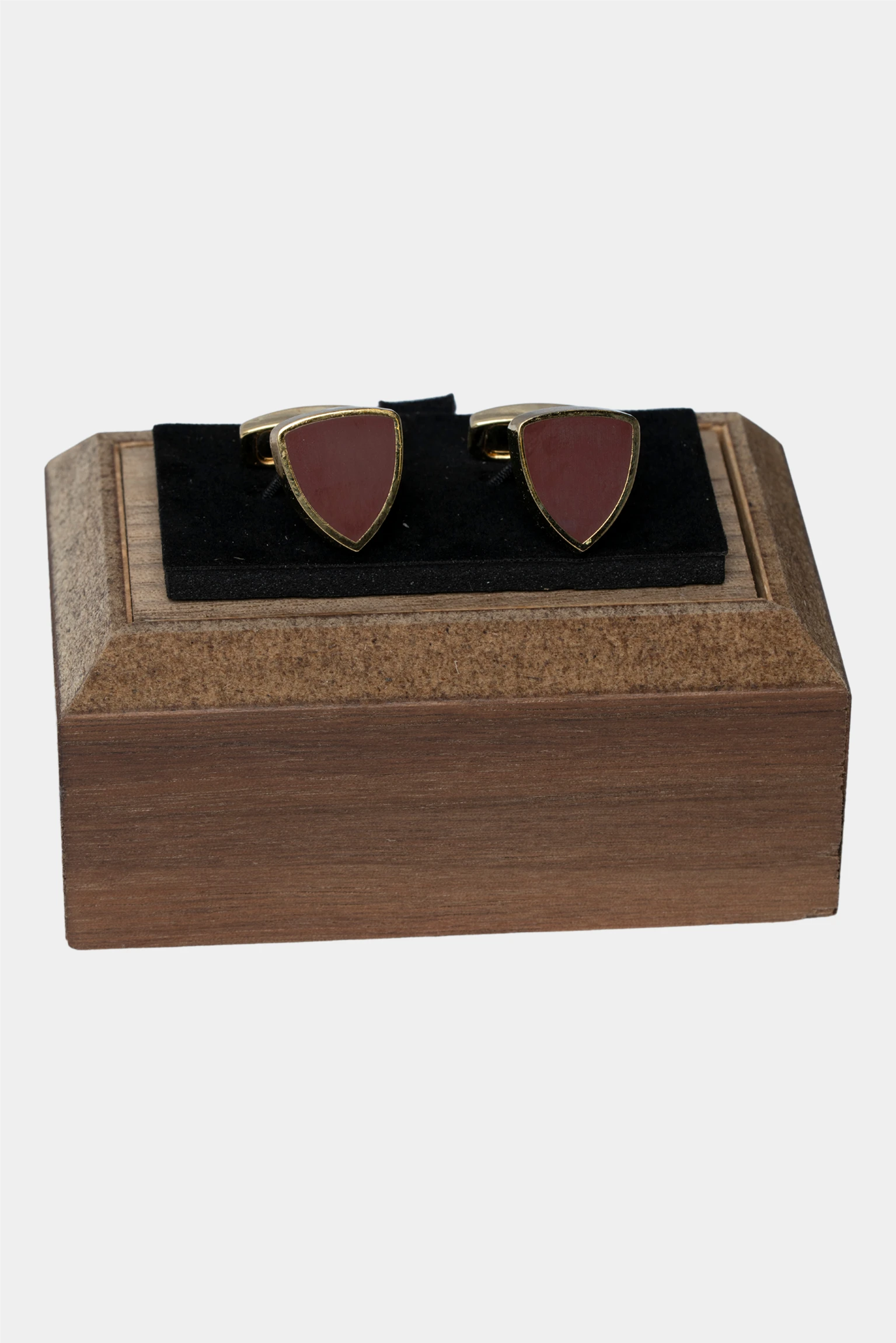 Diese Manschettenknoepfe besitzen ein elegantes, schildfoermiges Design mit einem polierten Goldrahmen und einem warmen Kastanien-Emaillezentrum, das Braun- und Burgundtoene harmonisch vereint.