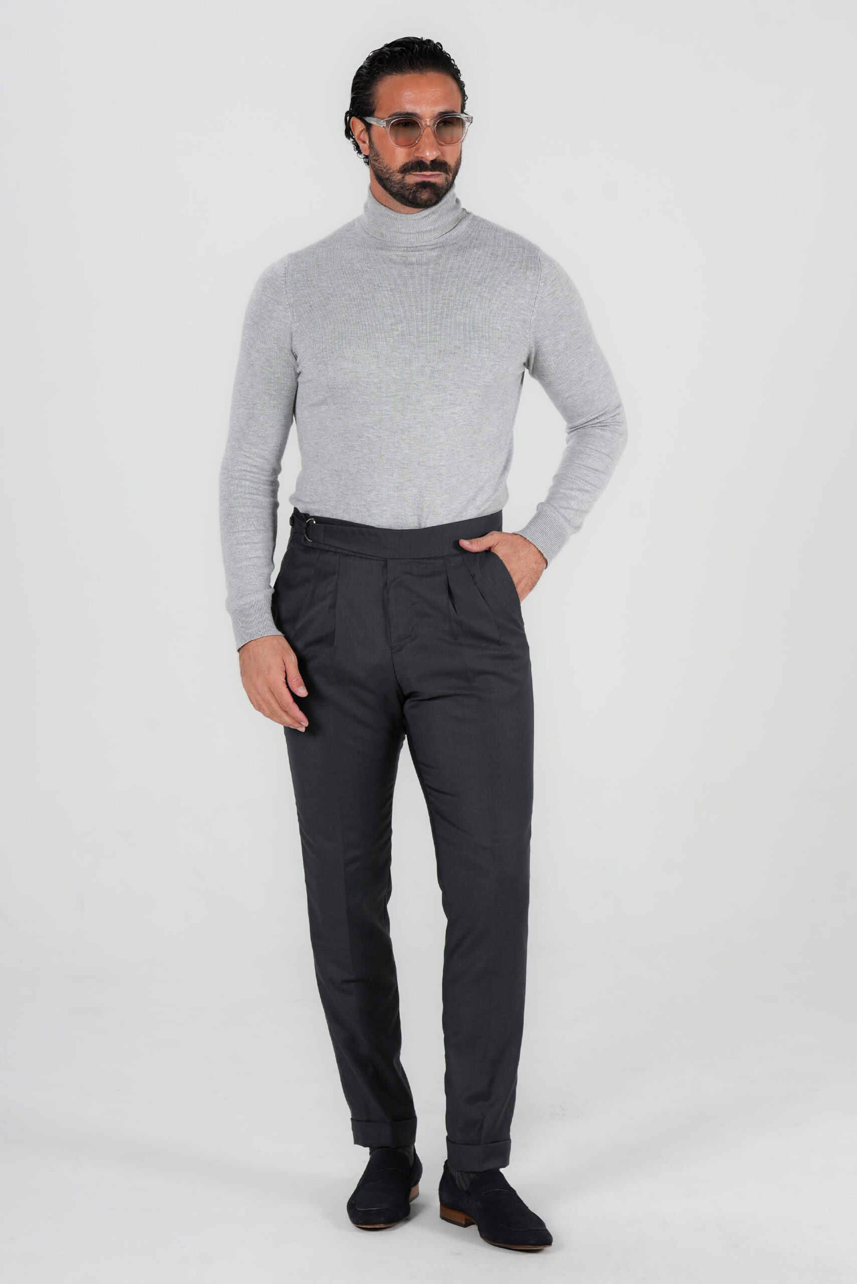 Diese graue Hose ist aus 100 % italienischer Wolle gefertigt und bietet eine feine Textur mit hervorragender Atmungsaktivität und natürlichem Fall. Im klassischen italienischen Stil gestaltet, verfügt sie über zwei Bundfalte und verstellbare Seitenspangen, die eine elegante, körpernahe Passform ermöglichen – ganz ohne Gürtel.