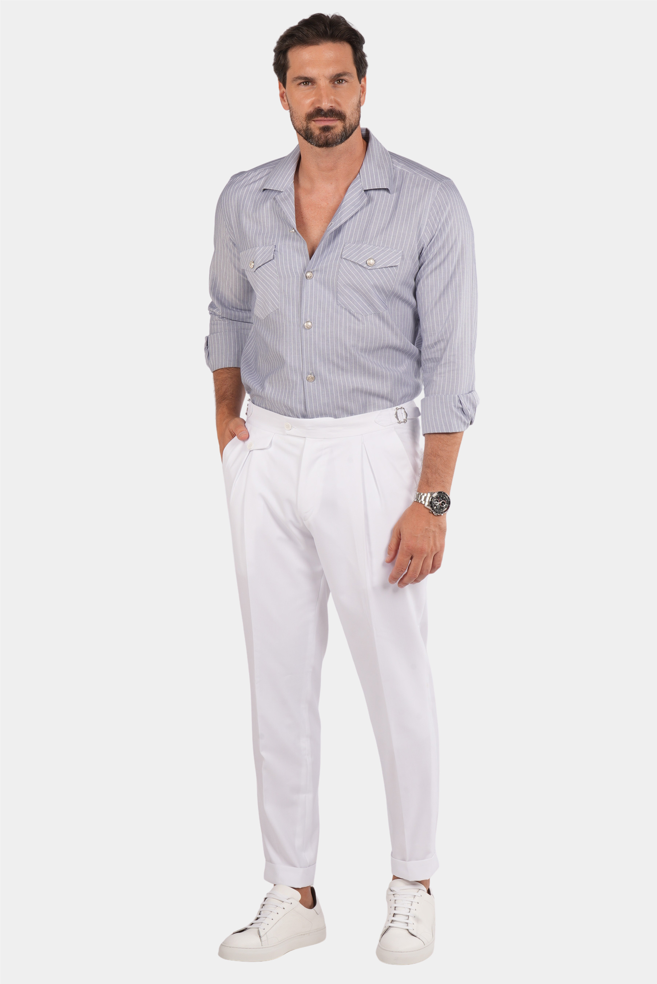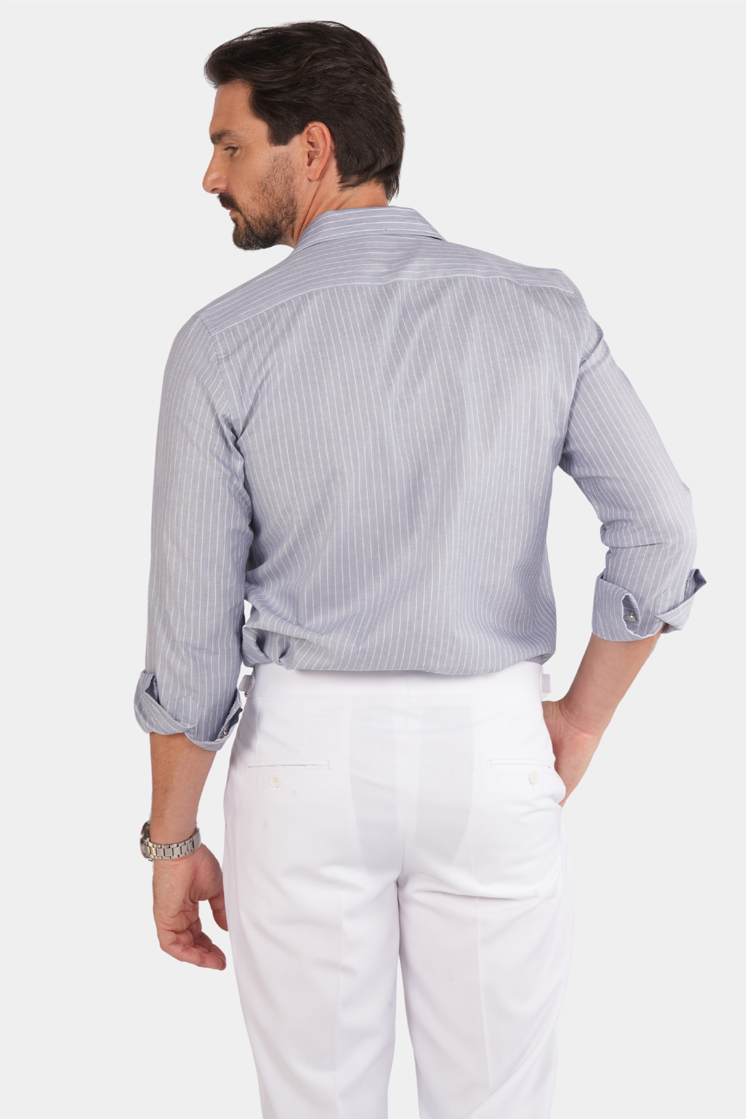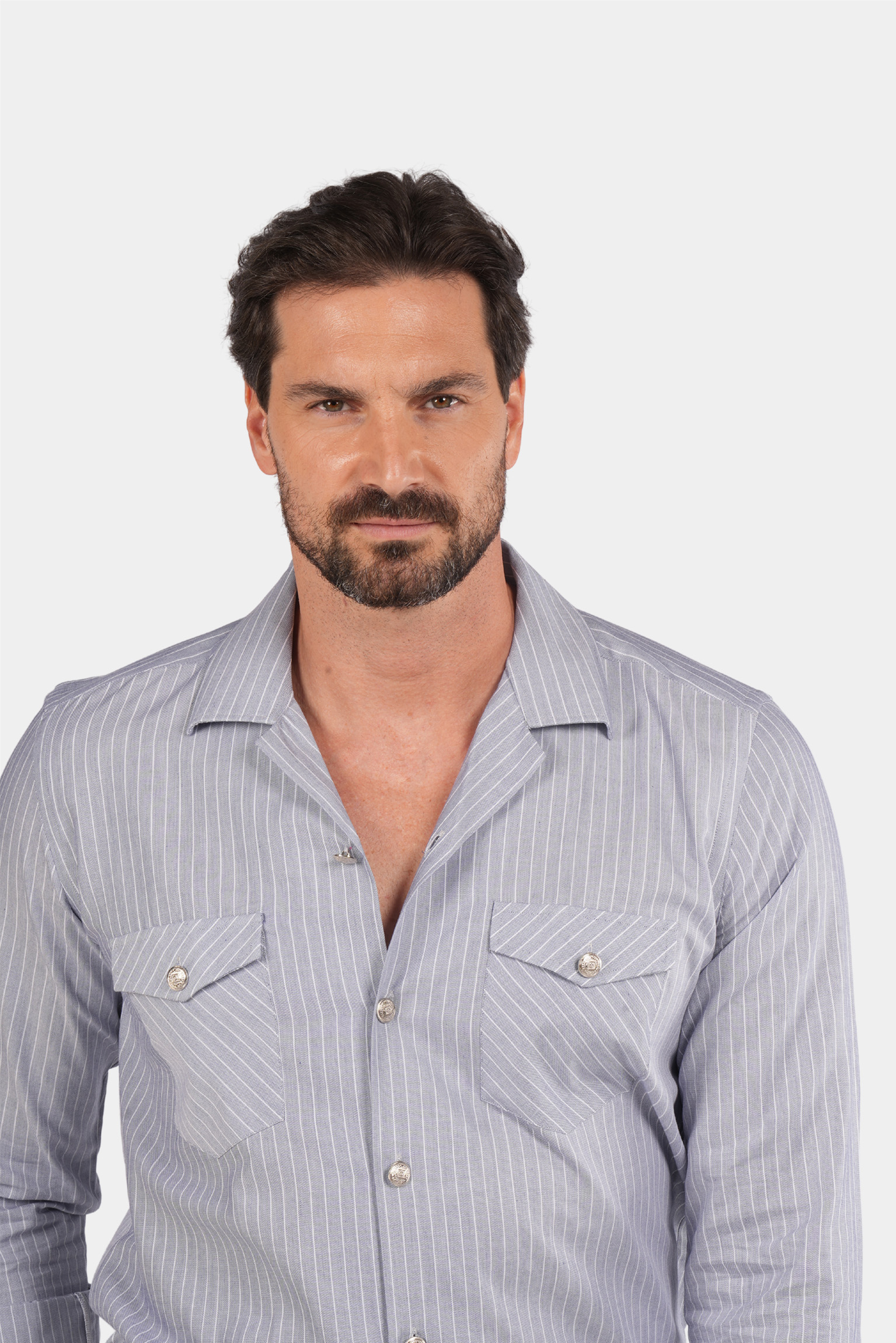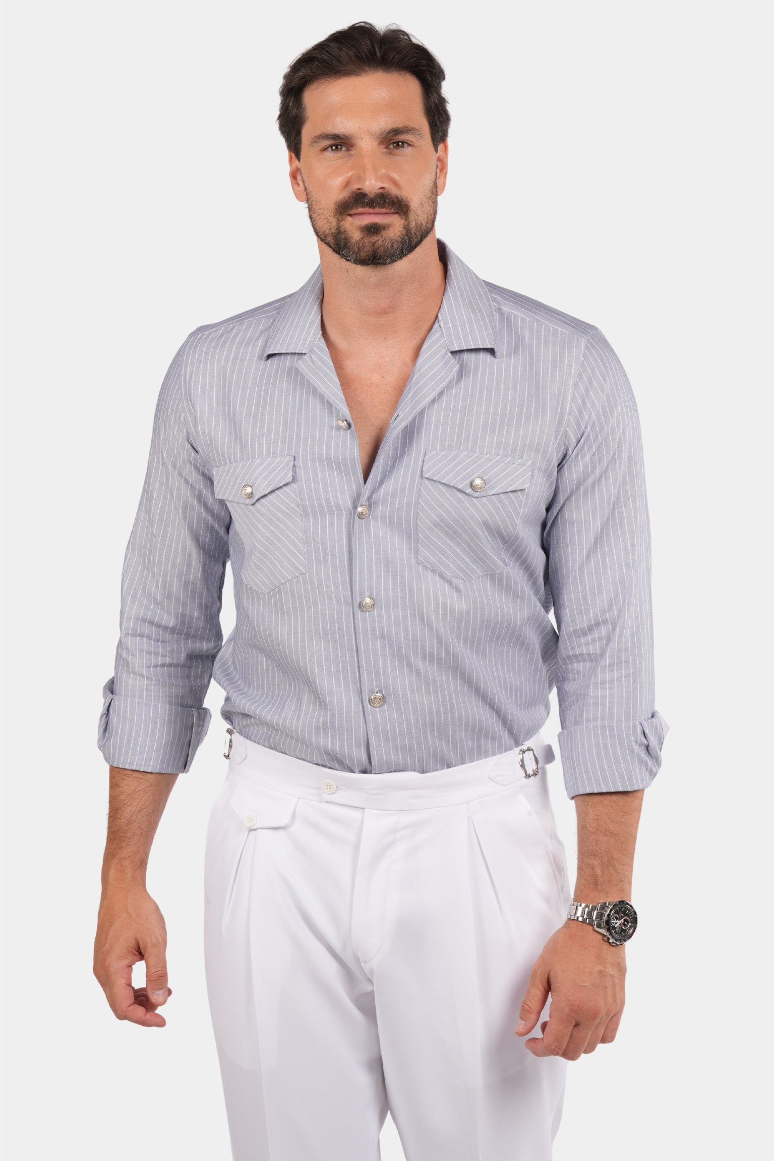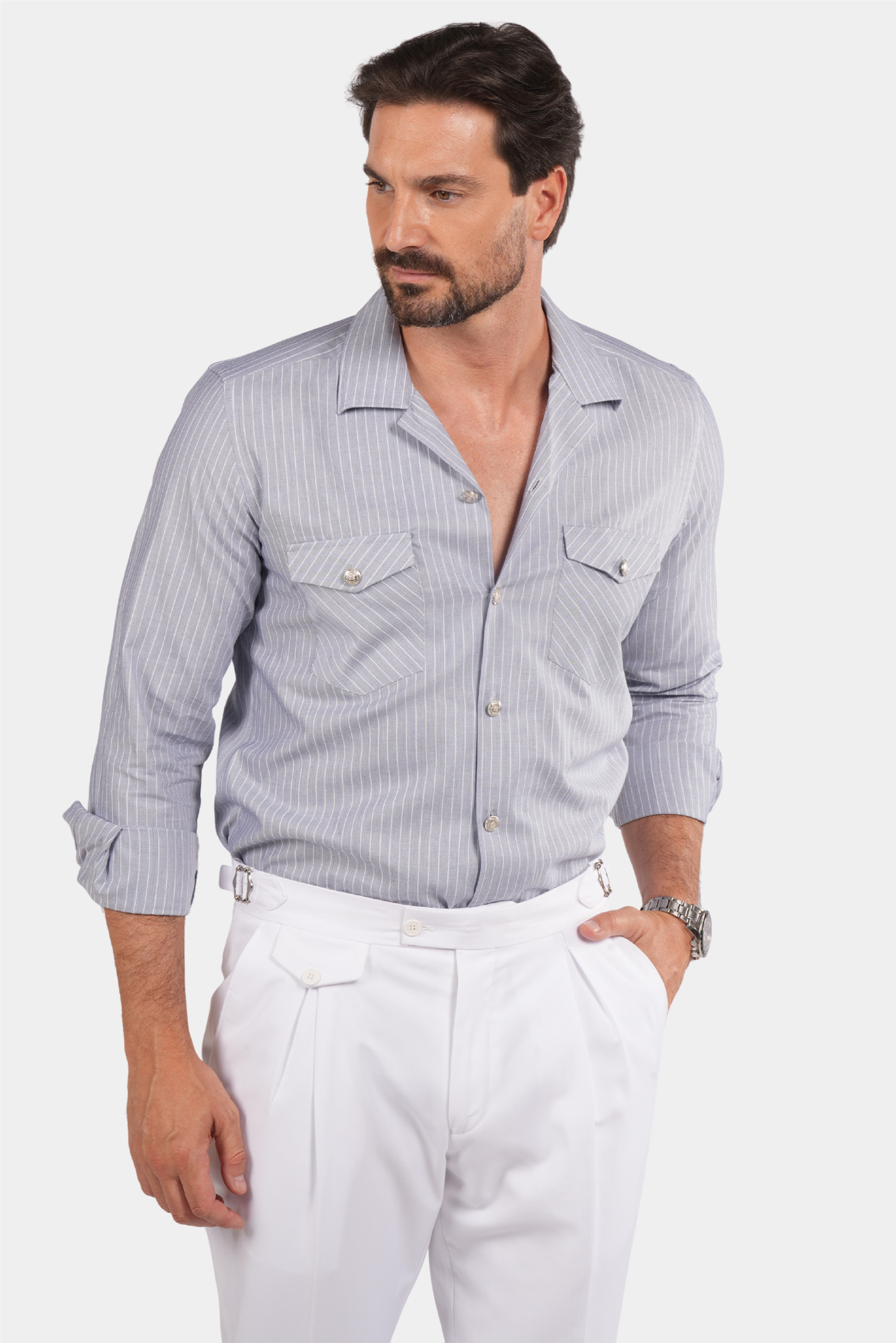 Dieses graue Safarihemd mit feinen Streifen vereint italienische Handwerkskunst mit müheloser Vielseitigkeit. Gefertigt in Italien aus 100 % hochwertiger Baumwolle, besticht es durch ein dezentes Streifenmuster, das dem leichten, atmungsaktiven Stoff subtile Tiefe und Struktur verleiht. Der offene Camp-Kragen und die aufgesetzten Brusttaschen mit Patte unterstreichen den klassischen Safari-Stil – ideal für entspannte, aber elegante Sommerlooks.