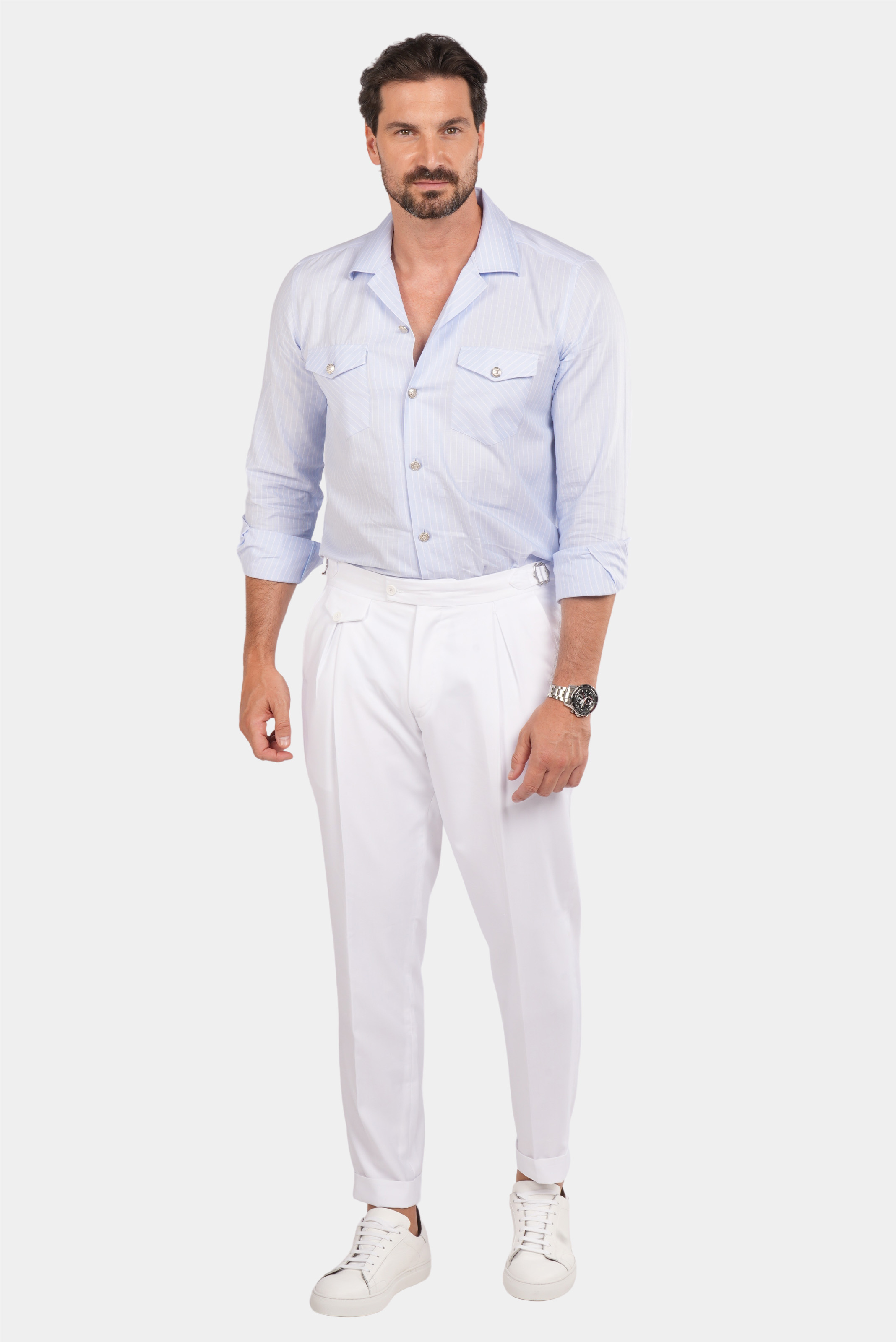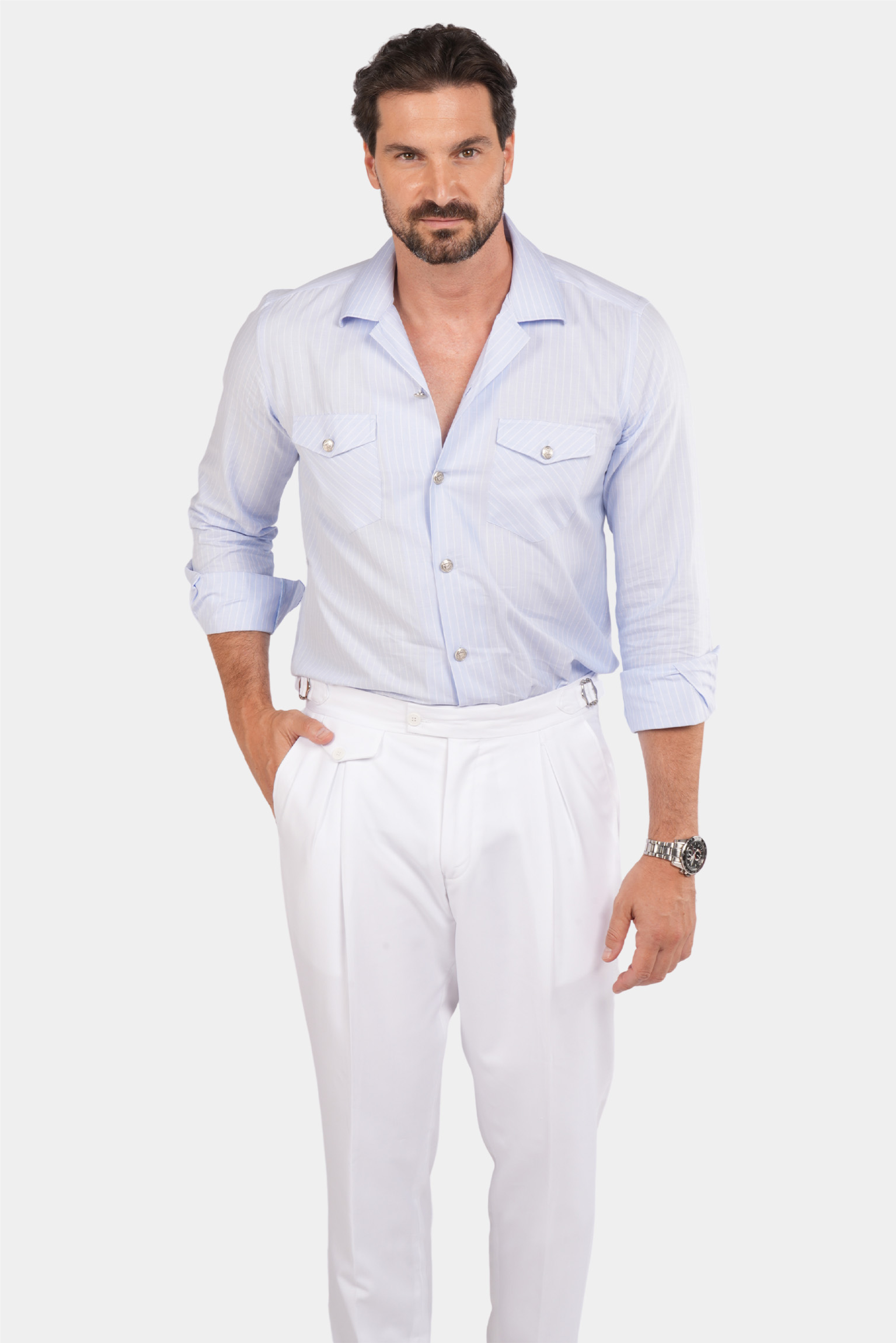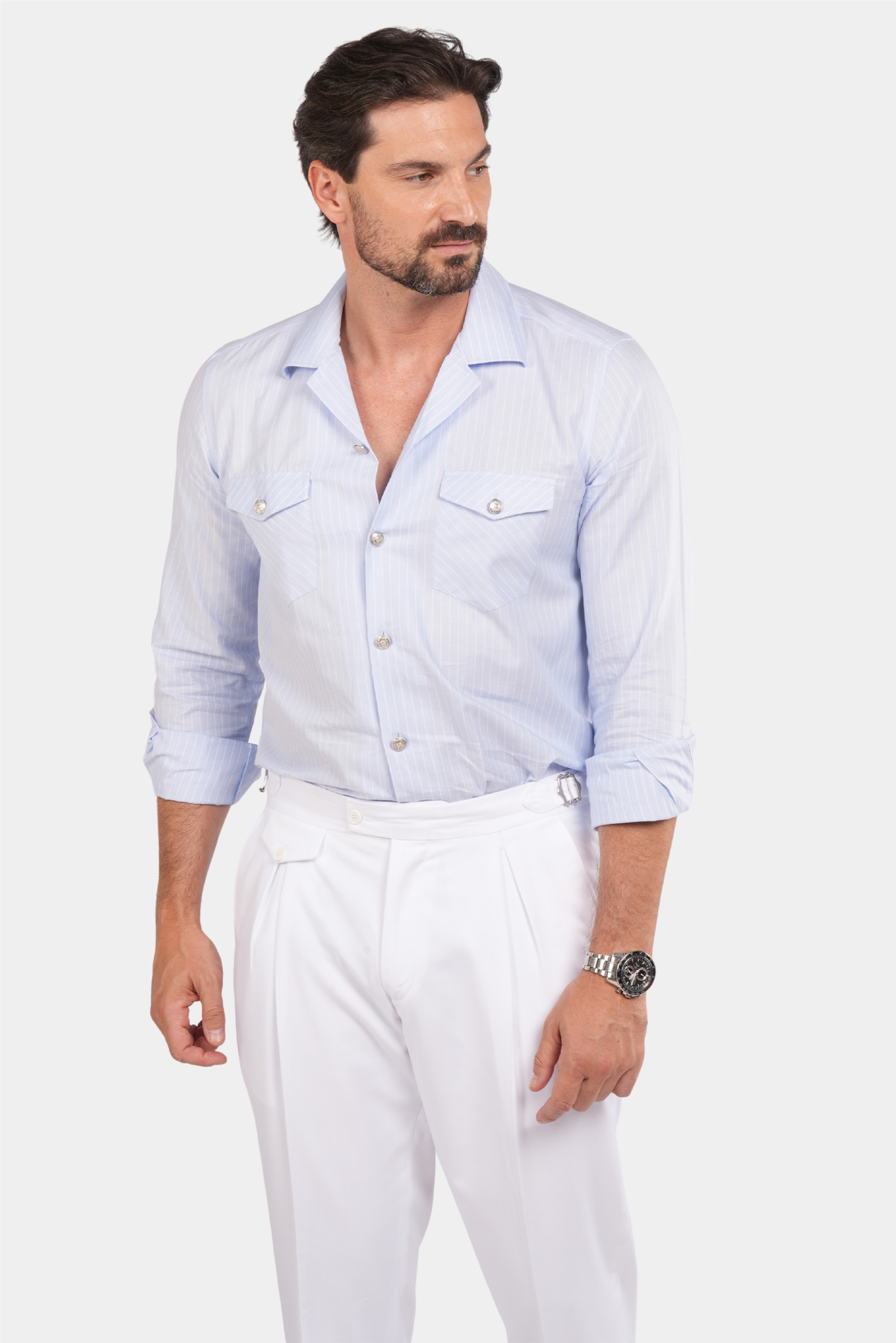 Hergestellt aus hochwertiger 100% Baumwolle, bietet dieses hellblaue Safari-Hemd mit weissen Streifen ein angenehmes, atmungsaktives Tragegefühl – ideal für den ganzen Tag. Das dezente Streifenmuster verleiht dem Hemd eine elegante Note, während silberfarbene Knöpfe und aufgesetzte Brusttaschen mit Patten das klassische Safari-Design betonen. Mit dem typischen Safari-Kragen strahlt dieses Hemd zeitlose italienische Eleganz aus und eignet sich perfekt für legere sowie halbformelle Anlässe.