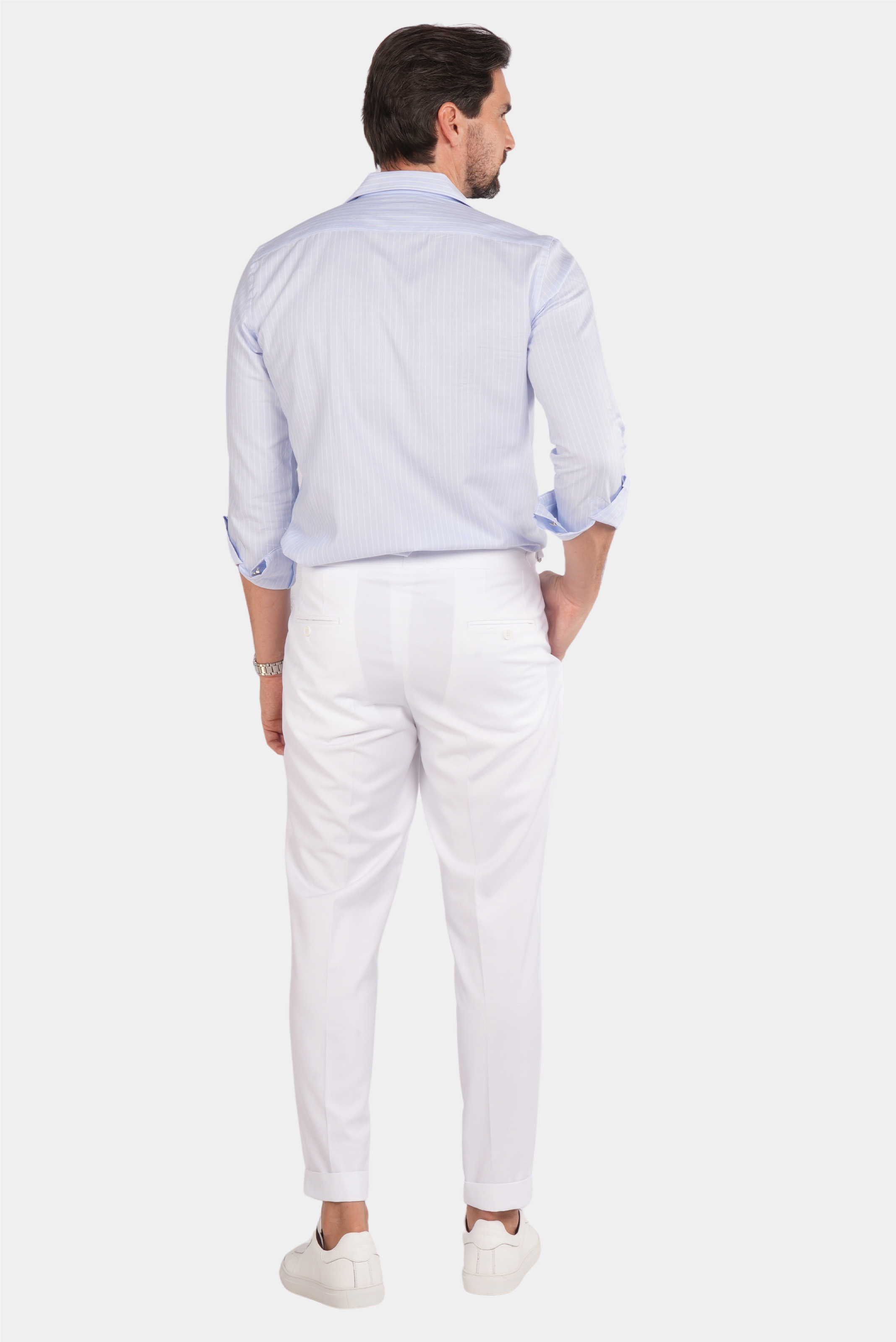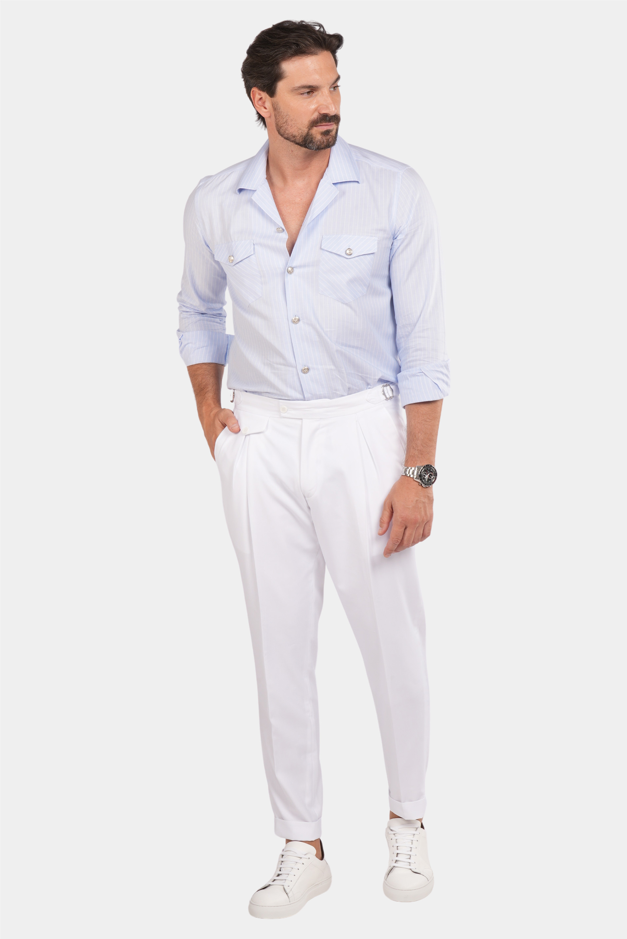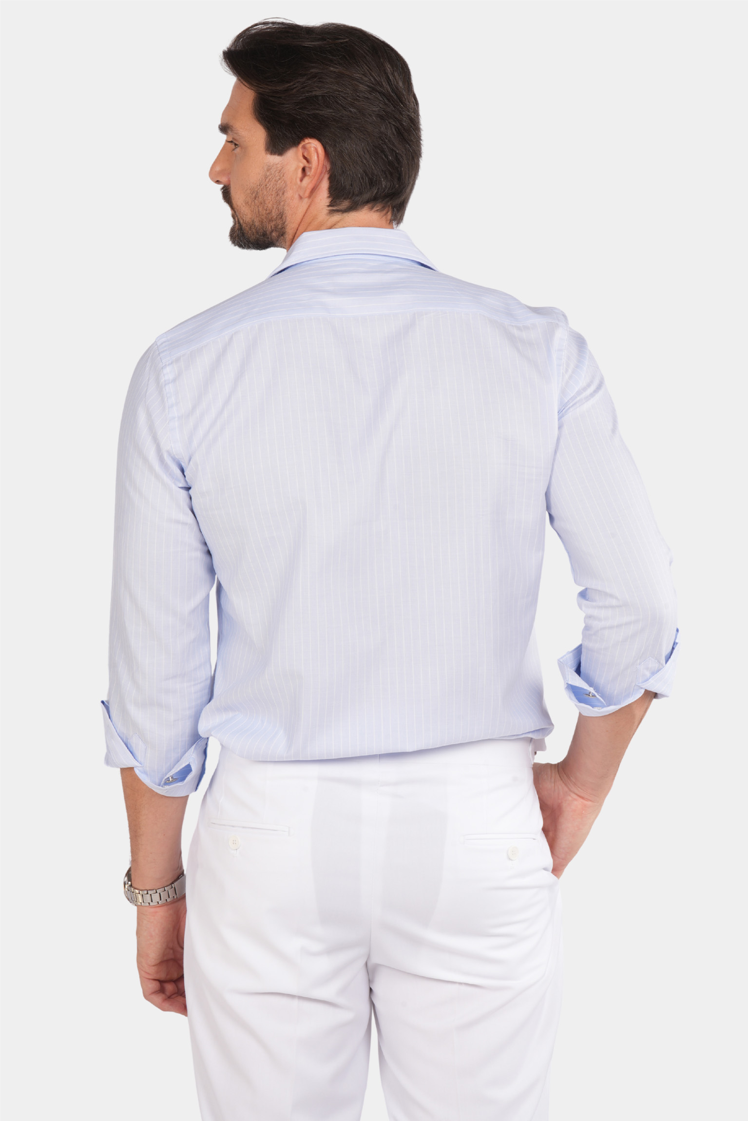 Hergestellt aus hochwertiger 100% Baumwolle, bietet dieses hellblaue Safari-Hemd mit weissen Streifen ein angenehmes, atmungsaktives Tragegefühl – ideal für den ganzen Tag. Das dezente Streifenmuster verleiht dem Hemd eine elegante Note, während silberfarbene Knöpfe und aufgesetzte Brusttaschen mit Patten das klassische Safari-Design betonen. Mit dem typischen Safari-Kragen strahlt dieses Hemd zeitlose italienische Eleganz aus und eignet sich perfekt für legere sowie halbformelle Anlässe.