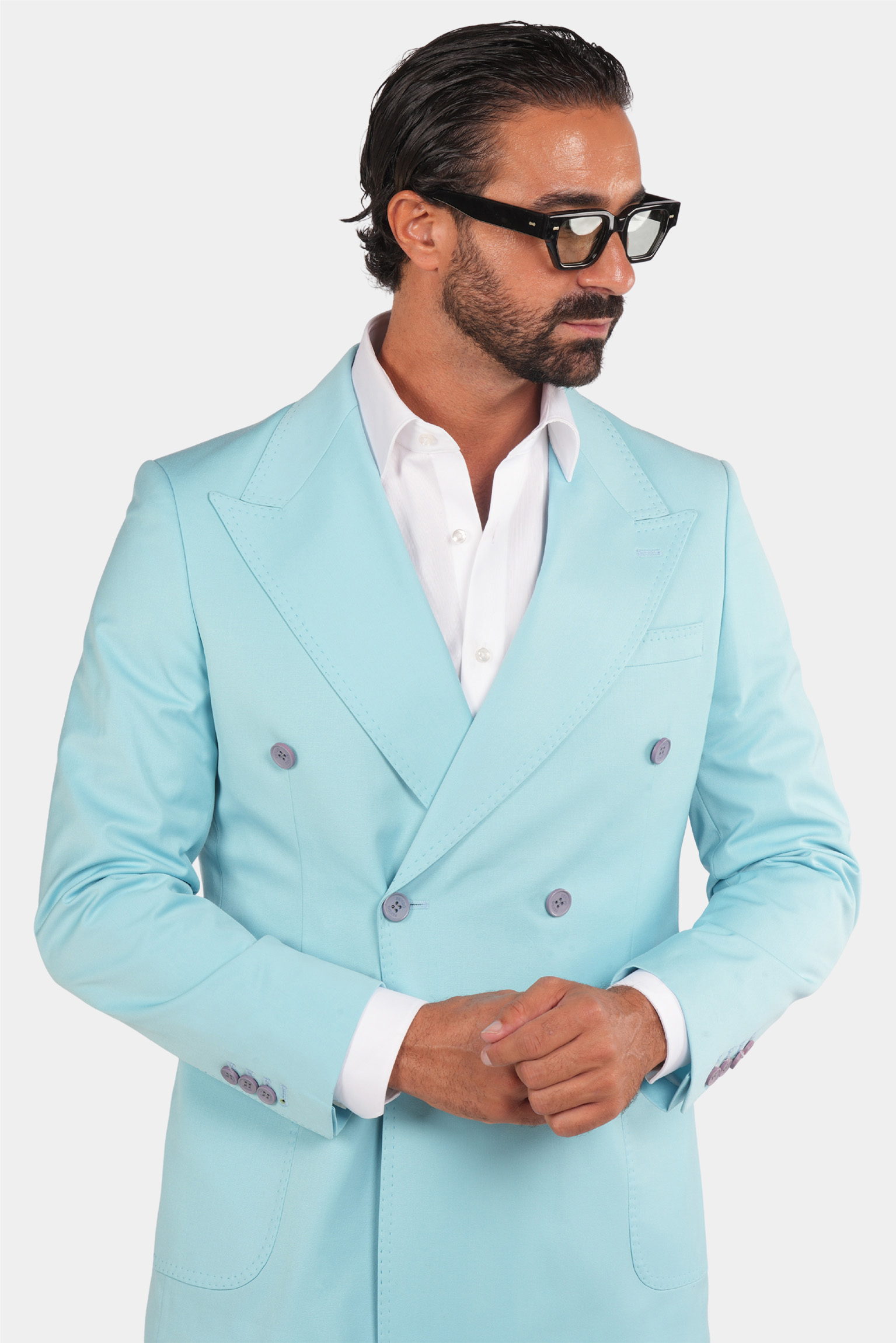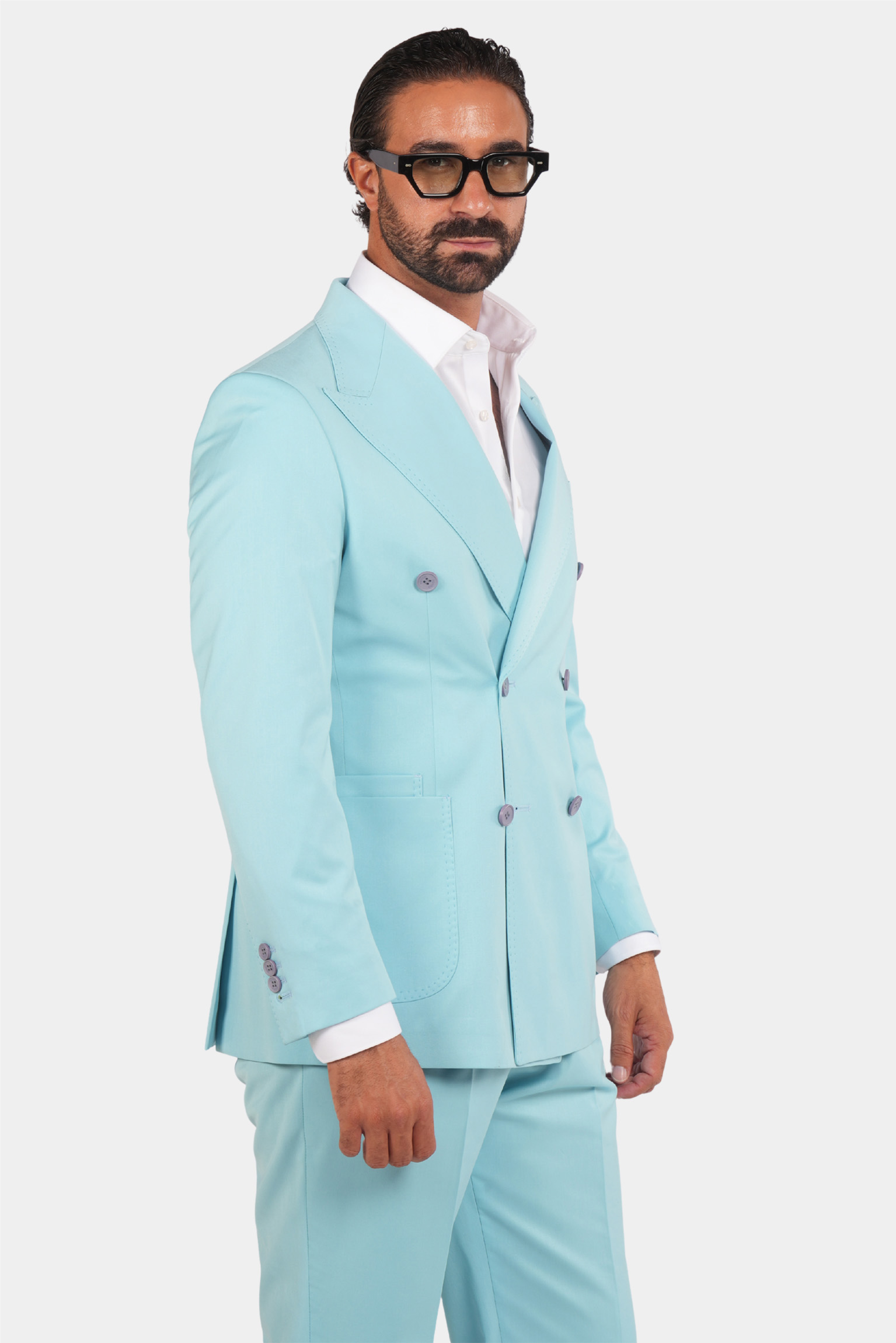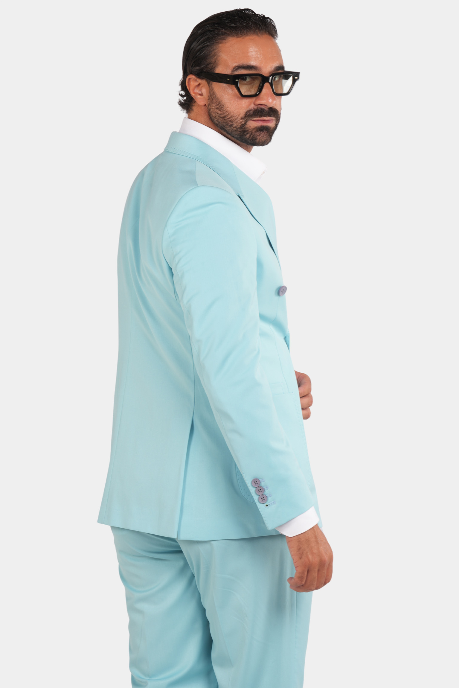 Dieser türkisfarbene Zweireiher ist ein stilvolles und formelles Produkt mit italienischem Design und hochwertigem Stoff. Sowohl der Blazer als auch die Hose dieses Produkts sind sehr schön und haben ausgezeichnete und präzise Nähte.